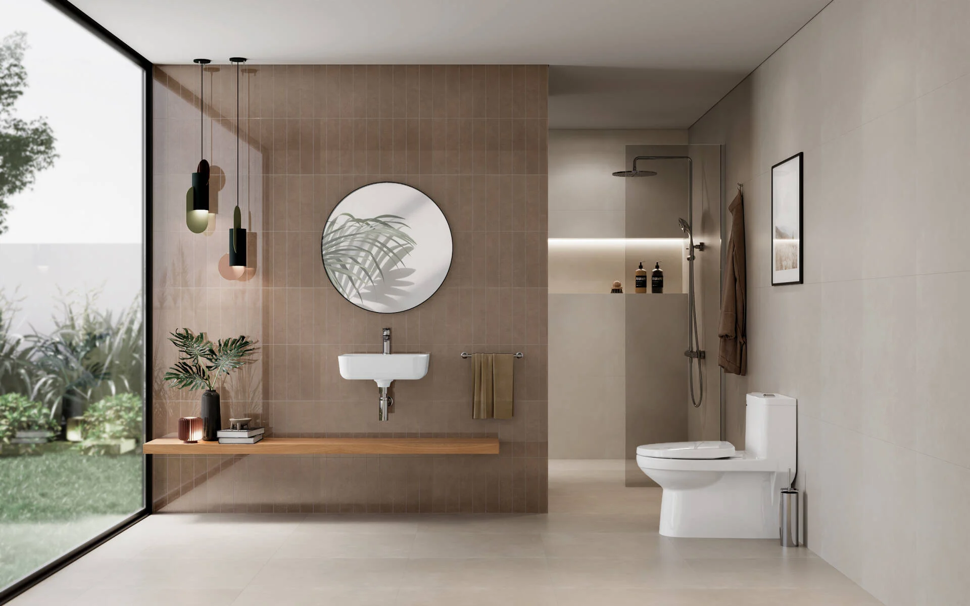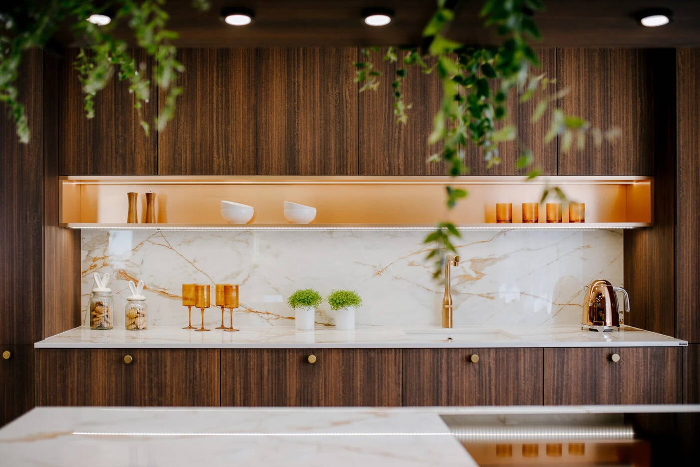 Tông màu gỗ ấm áp và lớp hoàn thiện trung tính được lựa chọn nhưng KTS đã khéo léo đưa vào các vật liệu sang trọng có họa tiết đặc biệt để tránh sự nhàm chán cho không gian.