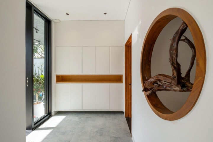 Ngôi nhà do HGAA thiết kế tại thành phố Hạ Long, Việt Nam, nổi bật với thiết kế độc đáo tạo ra một "tấm rèm xanh" từ cây cối bao quanh ngôi nhà. Với mục tiêu mang đến không gian sống gần gũi với thiên nhiên giữa lòng đô thị, kiến trúc sư đã tận dụng tối đa cây xanh để tạo ra sự riêng tư, đồng thời làm giảm nhiệt độ và cải thiện chất lượng không khí. Ngôi nhà không chỉ mang lại cảm giác mát mẻ, dễ chịu mà còn giúp cư dân kết nối với thiên nhiên, tạo nên một môi trường sống trong lành và bền vững.