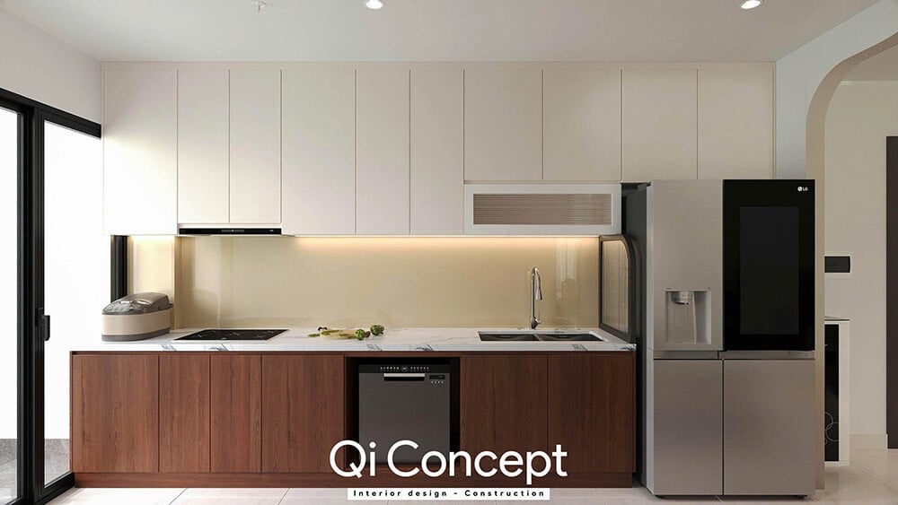 • Bếp: Để giải quyết vấn đề cố hữu về lưu trữ, hệ tủ bếp chữ L được thiết kế cao sát trần. Giải pháp này mang lại dung tích cất giữ đồ đạc tối đa, bảo chứng cho một căn bếp luôn ngăn nắp, gọn gàng.