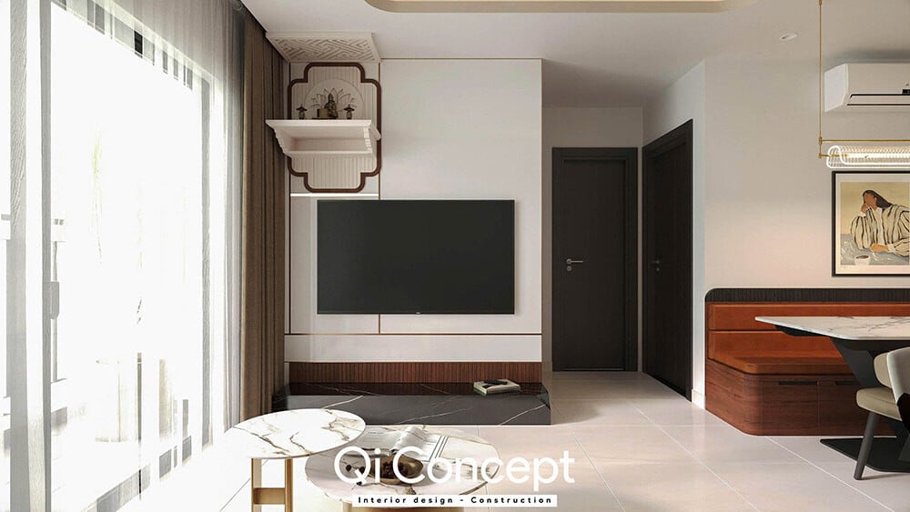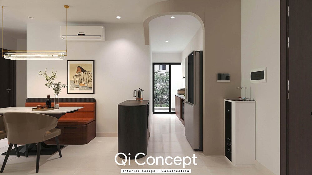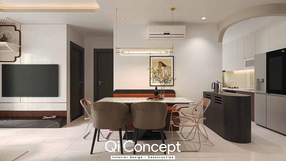 Giải pháp mang tính cốt lõi cho mọi căn hộ chung cư chính là việc khai phóng mặt bằng. Khu vực phòng khách, không gian ẩm thực và bếp được thiết kế liên thông, xóa nhòa mọi vách ngăn vật lý. Điều này không chỉ giúp tối đa hóa diện tích sinh hoạt chung, mà còn là một quyết định chiến lược để ánh sáng tự nhiên từ ban công có thể len lỏi vào từng góc khuất.