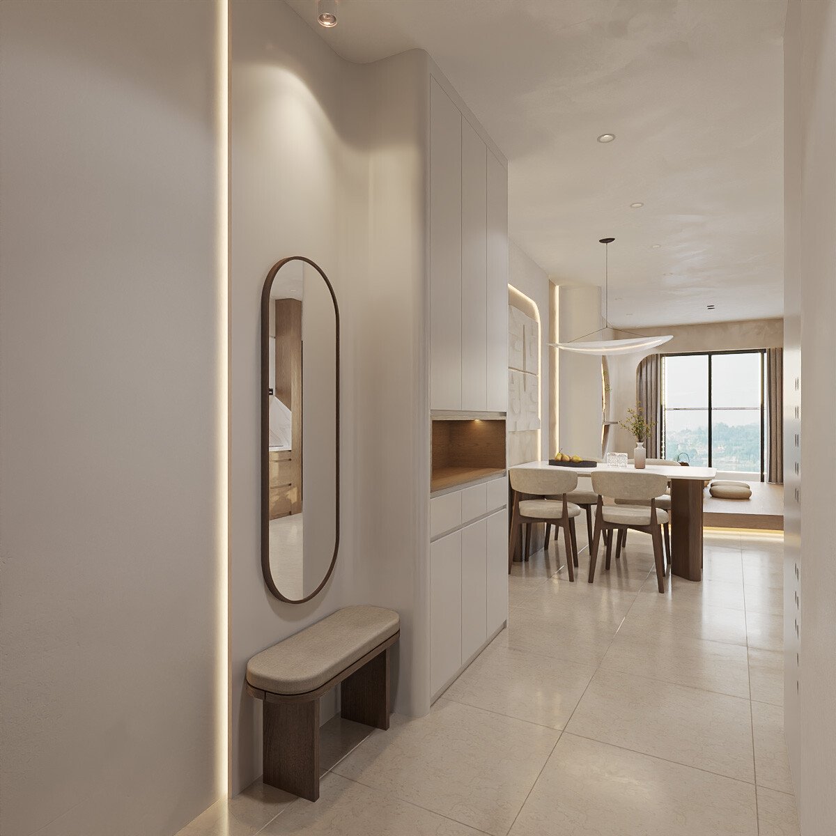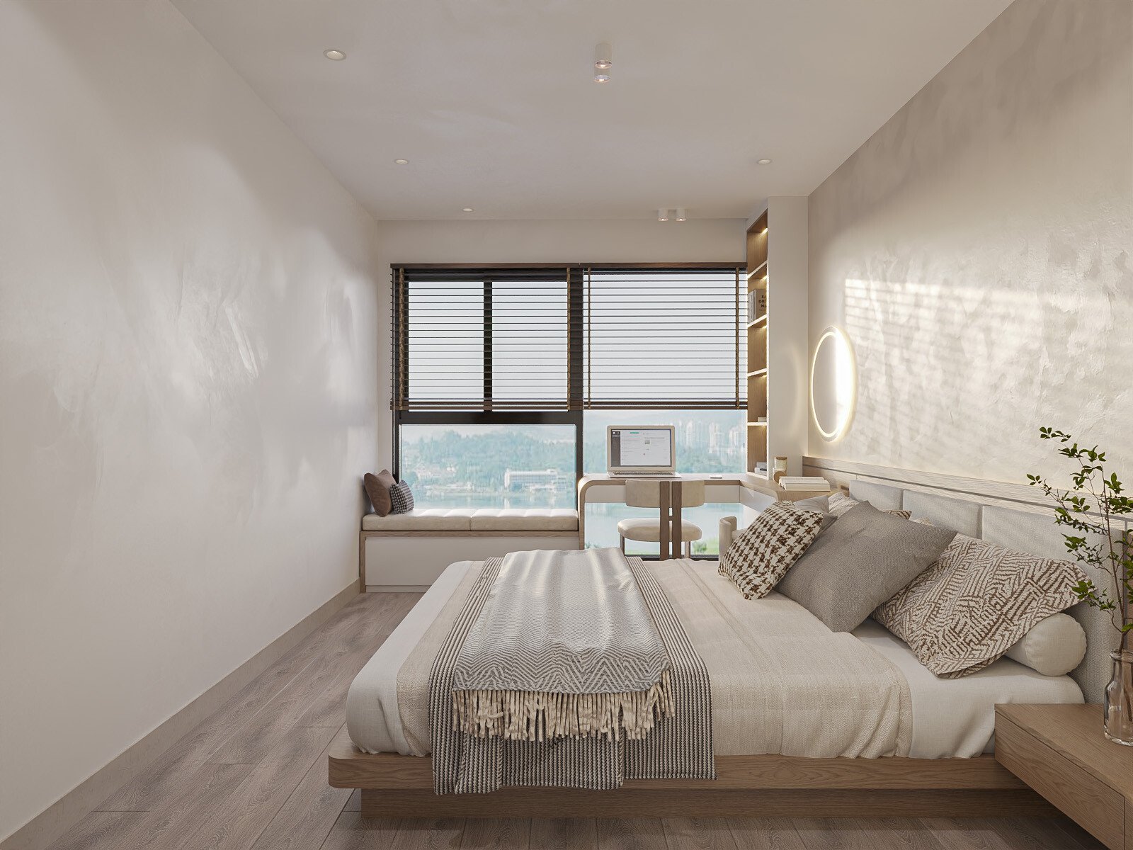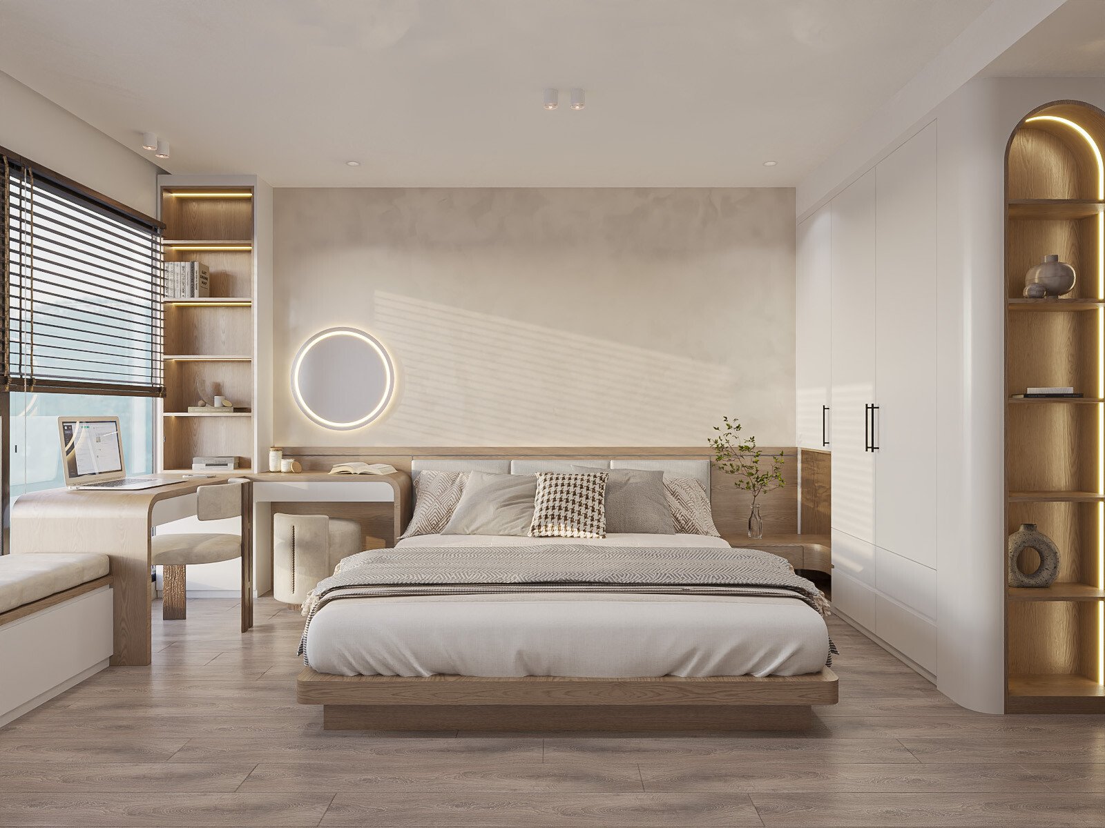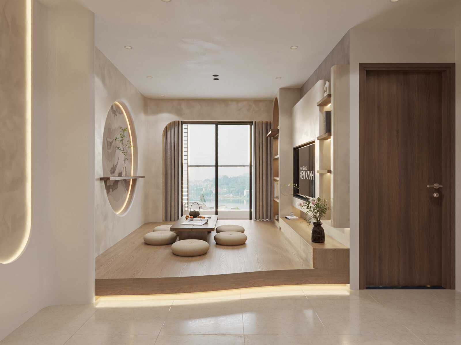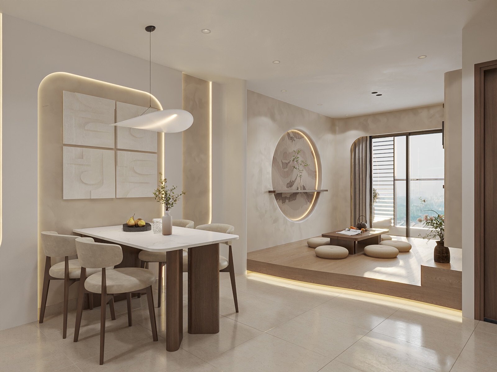 Trong lòng thành phố biển náo nhiệt, căn hộ Japandi trở thành khoảng dừng an yên, nơi ánh sáng tự nhiên và làn gió biển len lỏi qua từng khung cửa. Tông màu trung tính kết hợp chất liệu gỗ, mây tre và vải thô gợi cảm giác gần gũi, mộc mạc mà vẫn tinh tế. Sự giản lược trong bố cục không chỉ giúp mở rộng không gian mà còn mang đến sự thư thái, cân bằng giữa nhịp sống hiện đại và thiên nhiên biển cả.