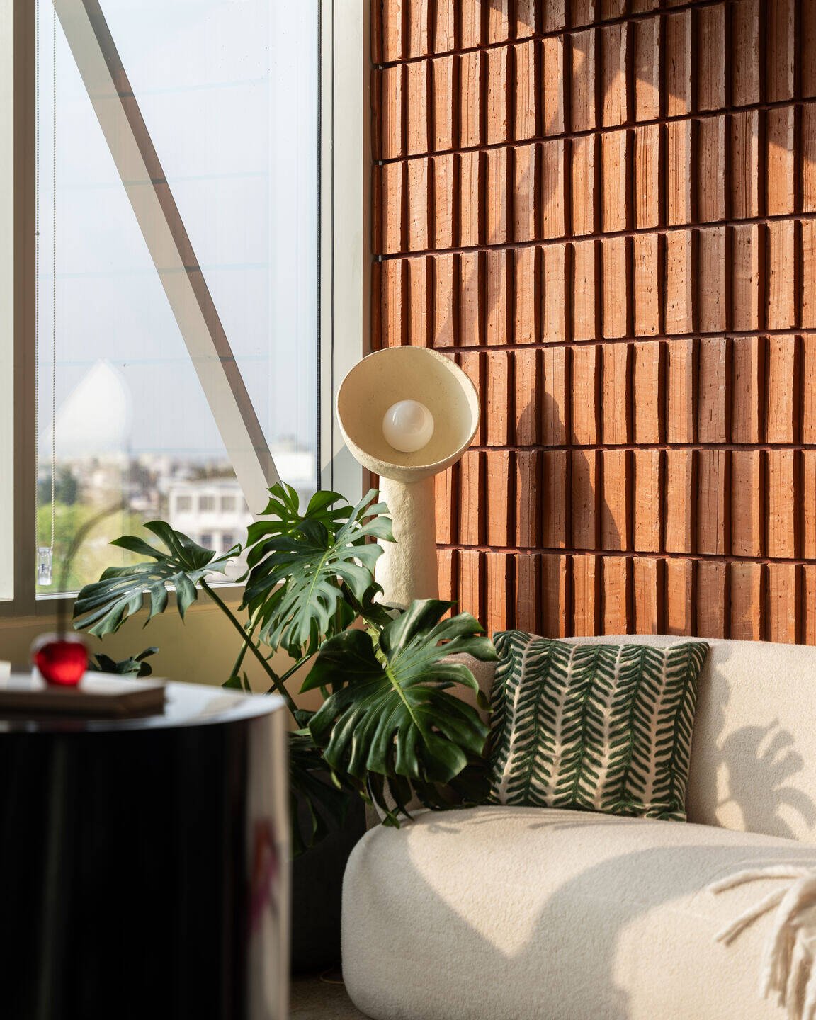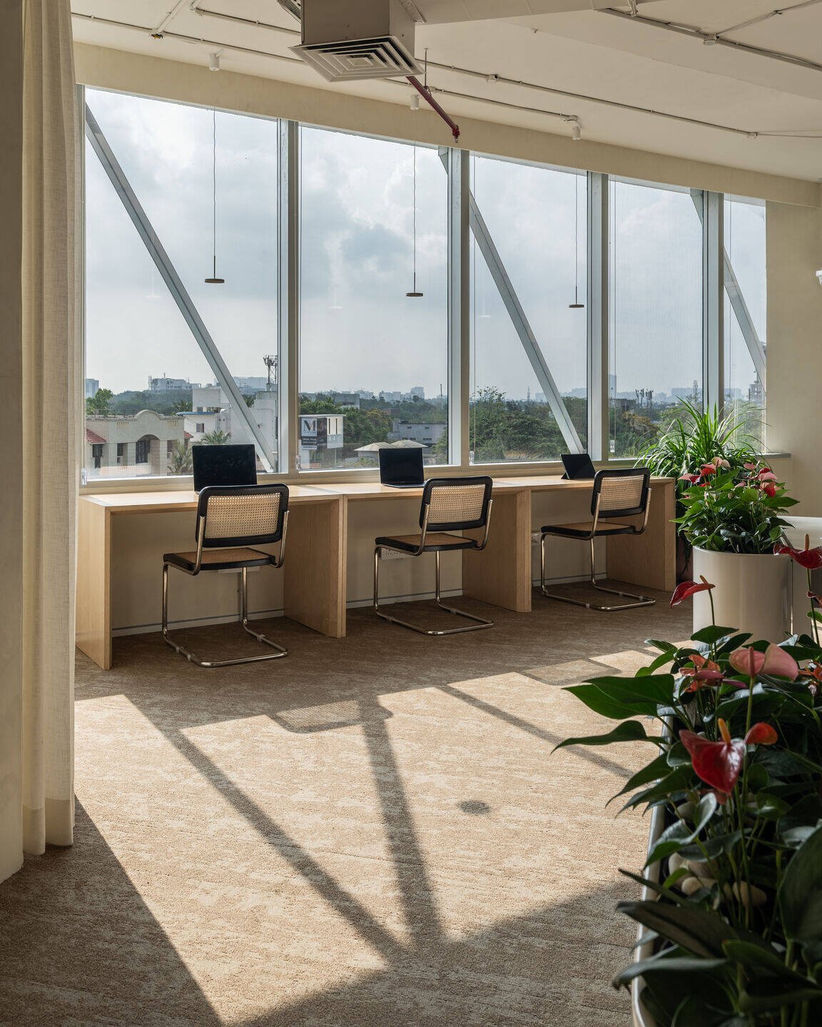 Ánh sáng tự nhiên đóng vai trò trung tâm trong việc định hình tinh thần của Timeless Venture Office. Những khung cửa kính lớn mở ra khung cảnh thành phố Chennai, cho phép ánh sáng ban ngày len lỏi vào mọi ngóc ngách. Khi ánh sáng chuyển màu trong ngày, nó làm nổi bật độ sâu của vật liệu, từ lớp sơn vôi mềm mại đến bề mặt gỗ mộc và thảm nâu ấm áp. Nhịp chuyển động của ánh sáng chính là yếu tố khiến không gian trở nên “sống”: vừa tĩnh tại, vừa biến đổi không ngừng.