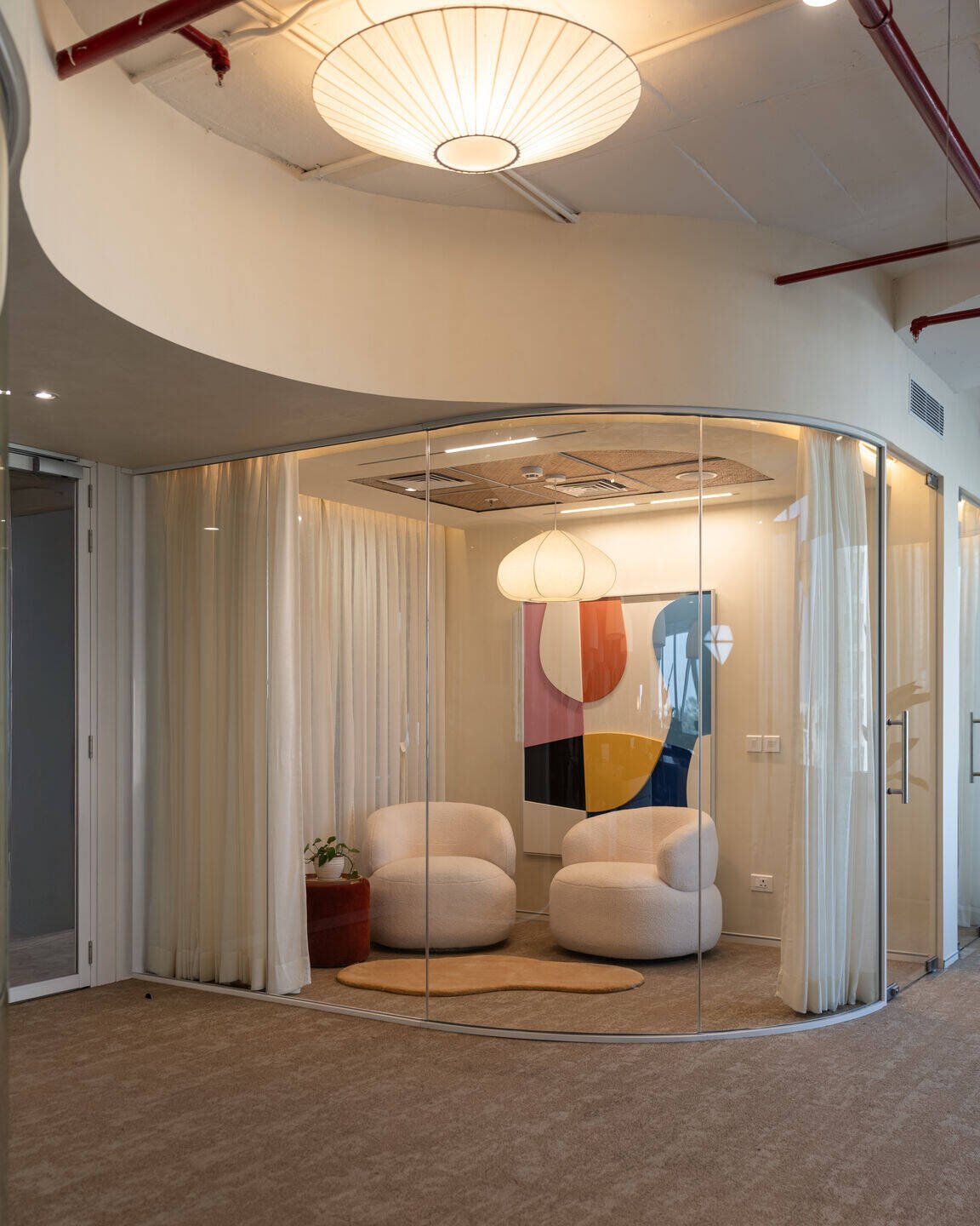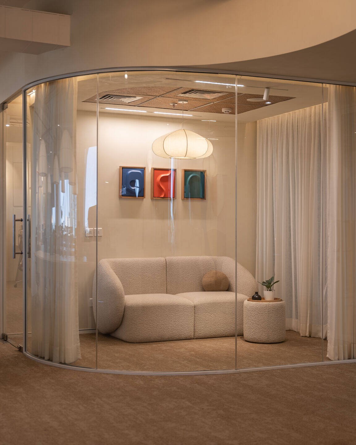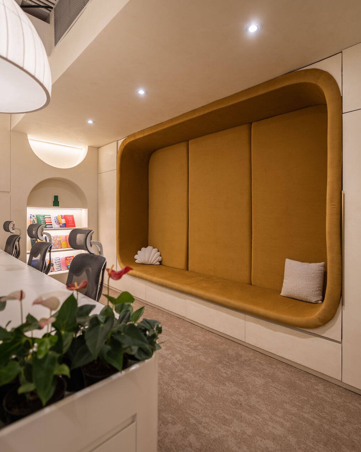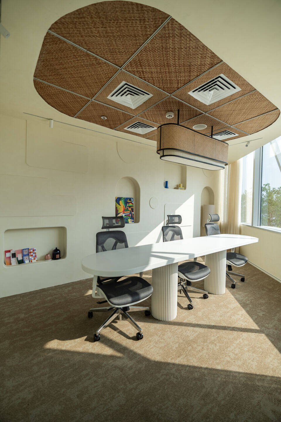Cân bằng giữa năng suất và thư giãn, VM Design Works tạo nên những khoảng nghỉ “ẩn mình” nhưng đầy cảm xúc: một góc ngồi âm tường bọc nỉ vàng đất, nơi nhân viên có thể ngả lưng nghỉ ngắn; một phòng thảo luận tách biệt bằng vách kính cong và rèm vải trắng, tràn ngập ánh sáng tự nhiên; hay khu lounge mềm mại với hai chiếc ghế bông tròn, mang lại cảm giác như đang ở trong một quán cà phê yên tĩnh.