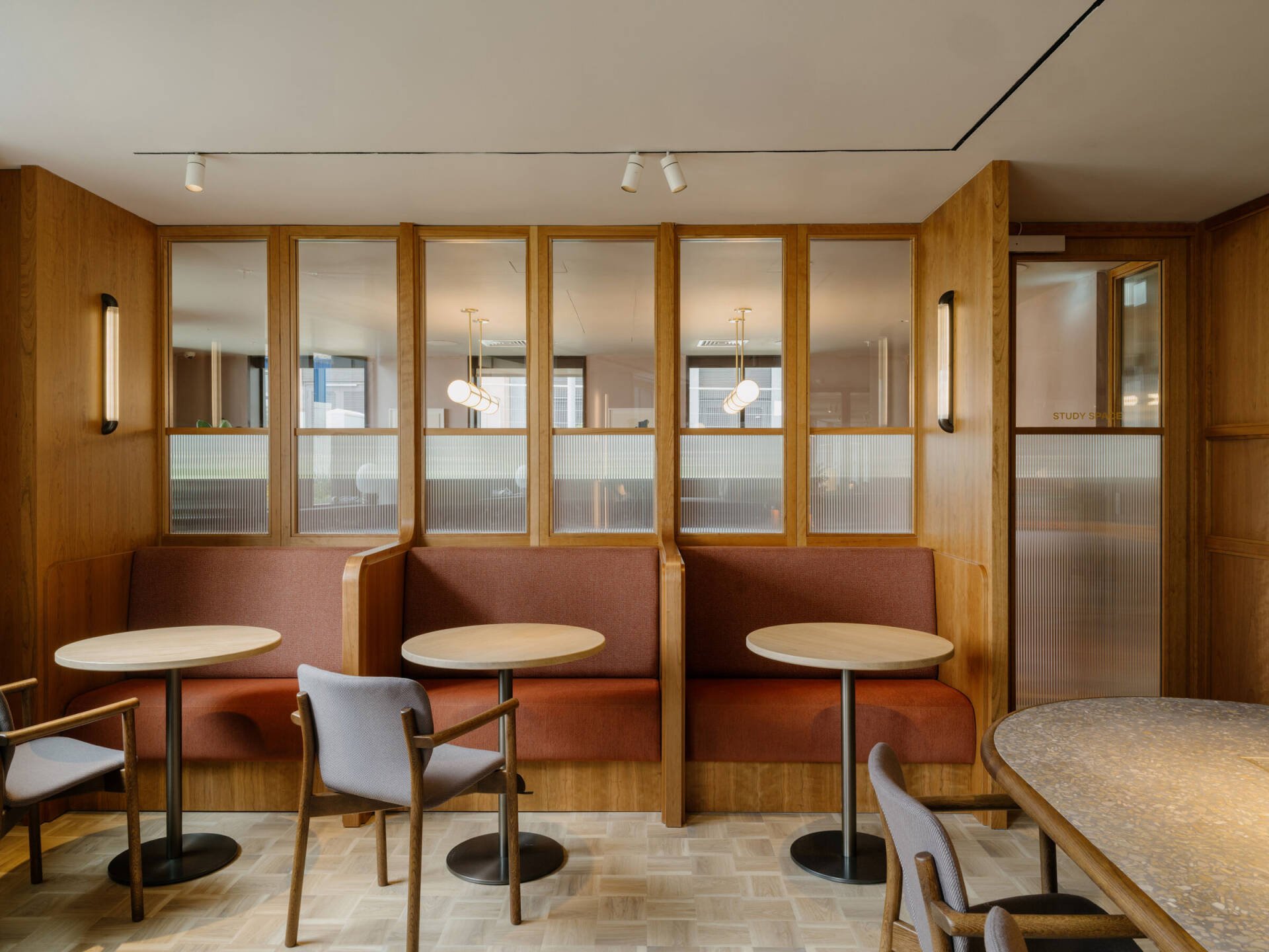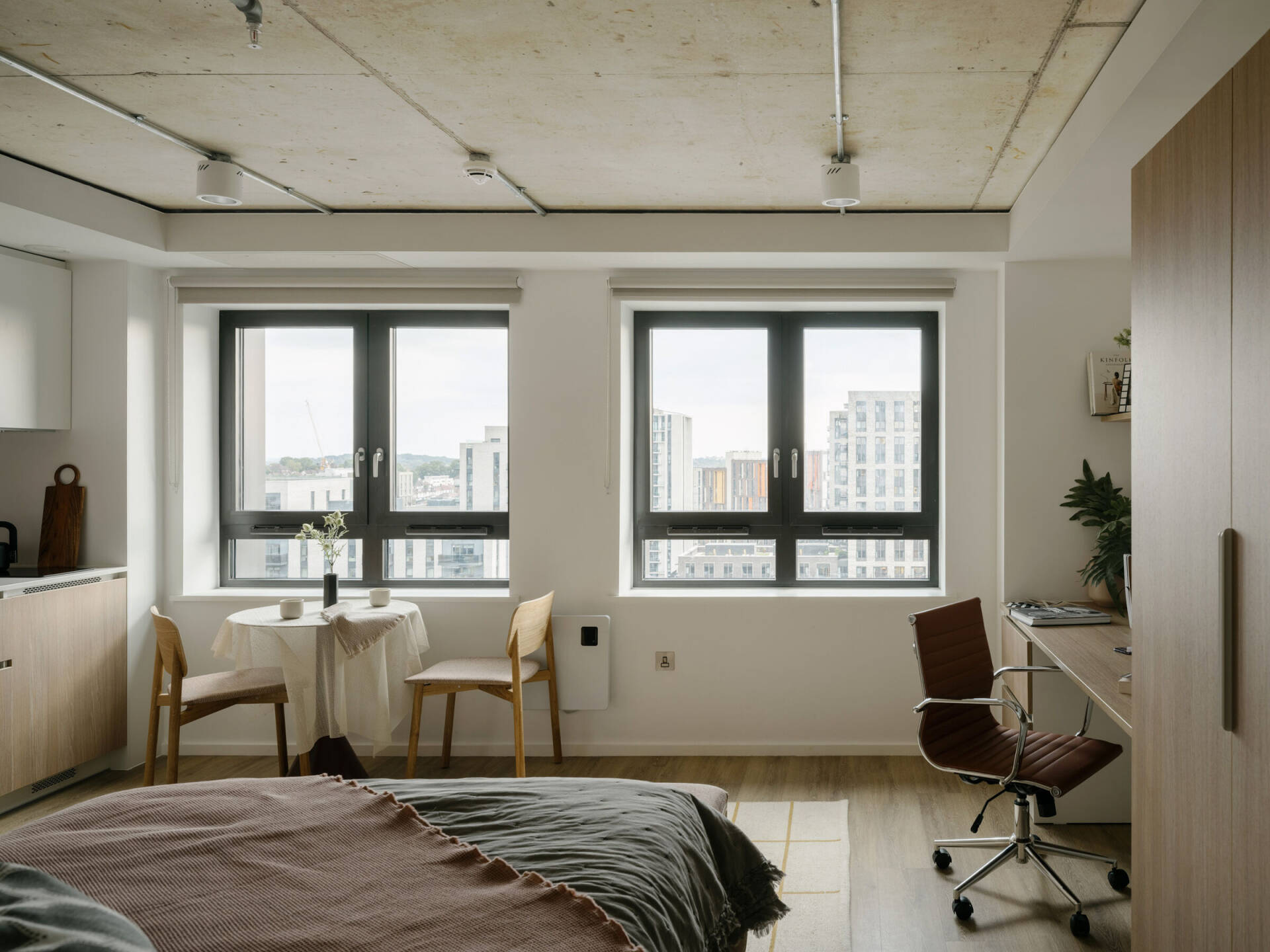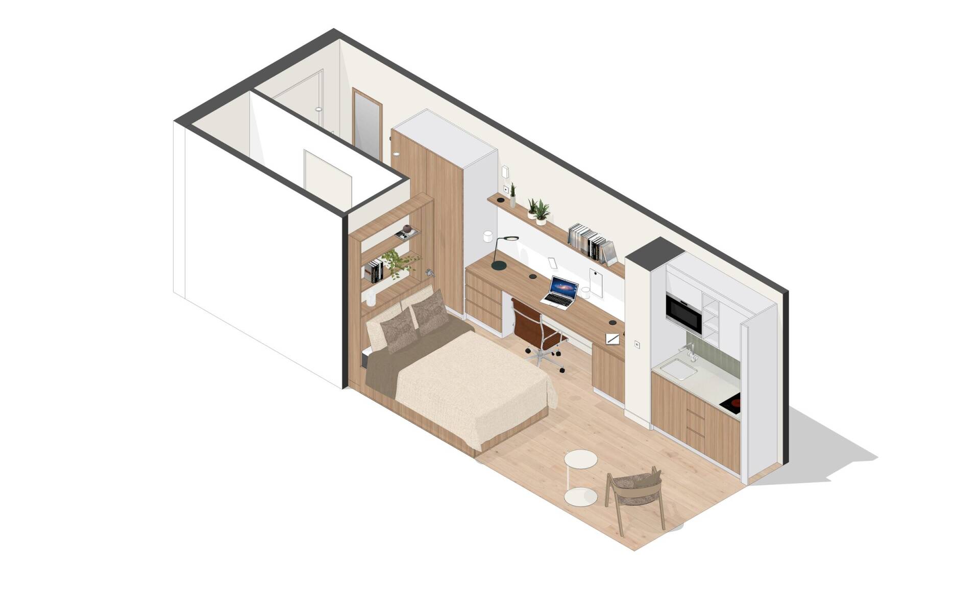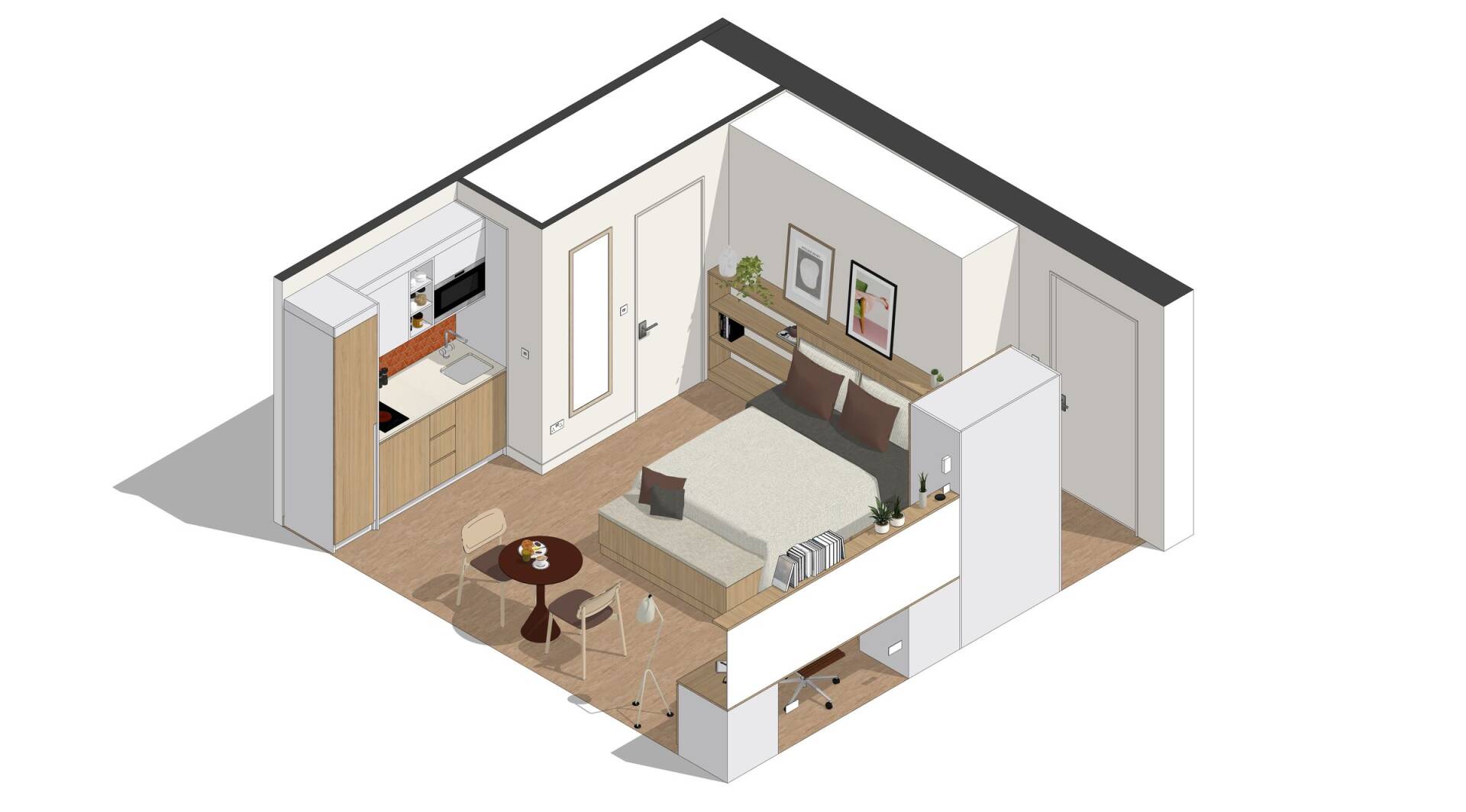 Bên trong tòa ký túc xá 20 tầng, TiggColl thiết kế nhiều loại phòng - từ tiêu chuẩn đến cao cấp - nhưng vẫn duy trì tinh thần chung: ấm áp, gần gũi, tự nhiên. Các phòng đều được hoàn thiện bằng vật liệu thân thiện, tông màu nhẹ và nội thất gỗ sáng, tạo cảm giác như một “tổ ấm thứ hai” giữa thành phố.