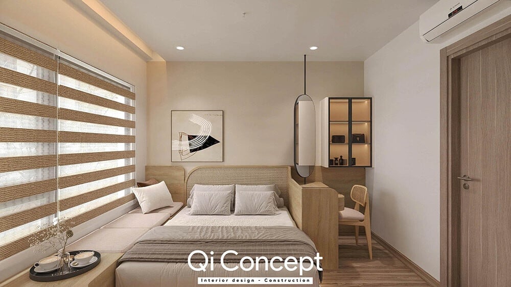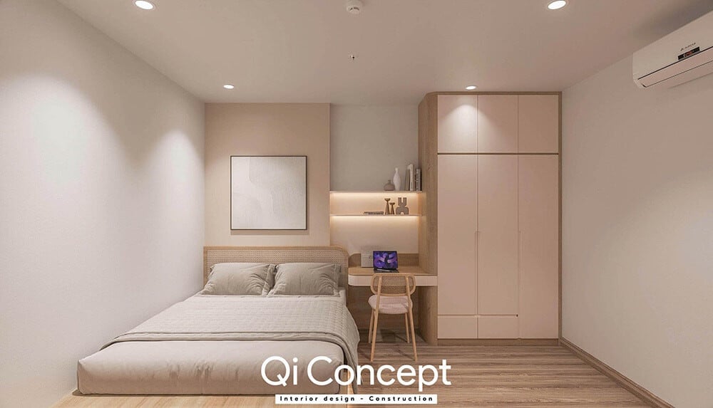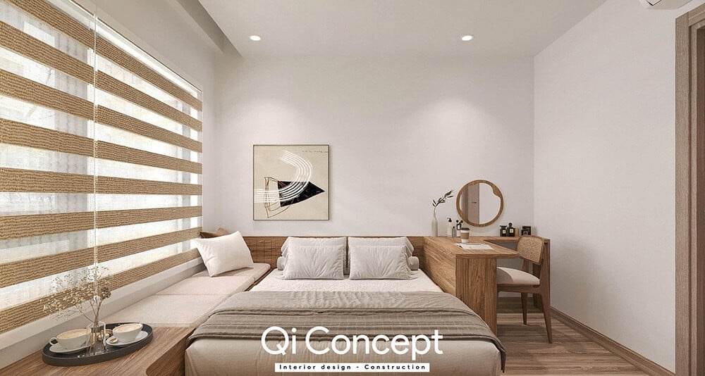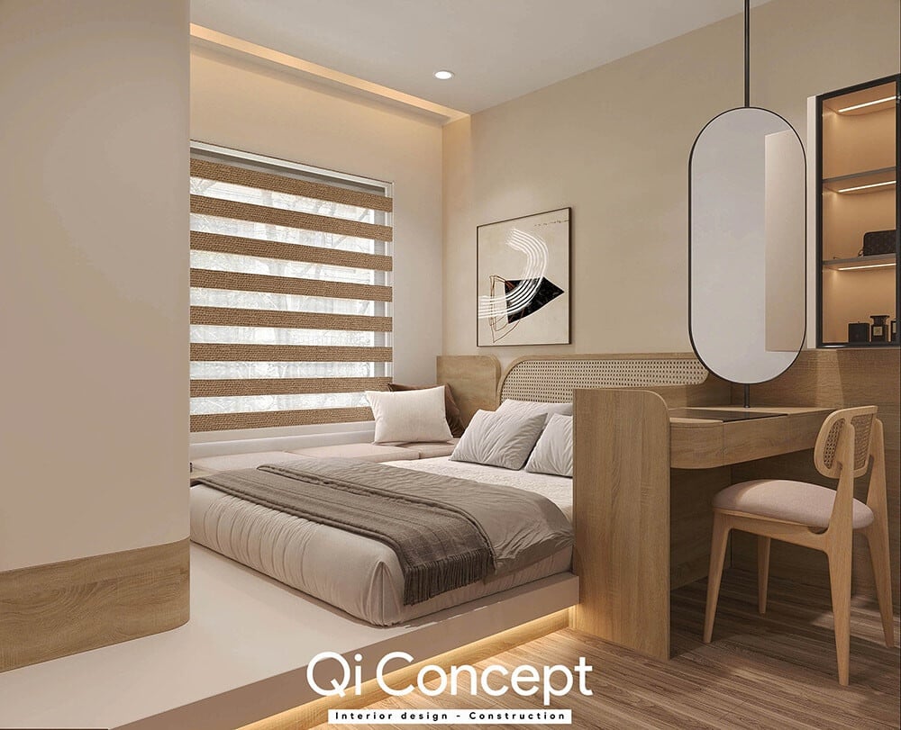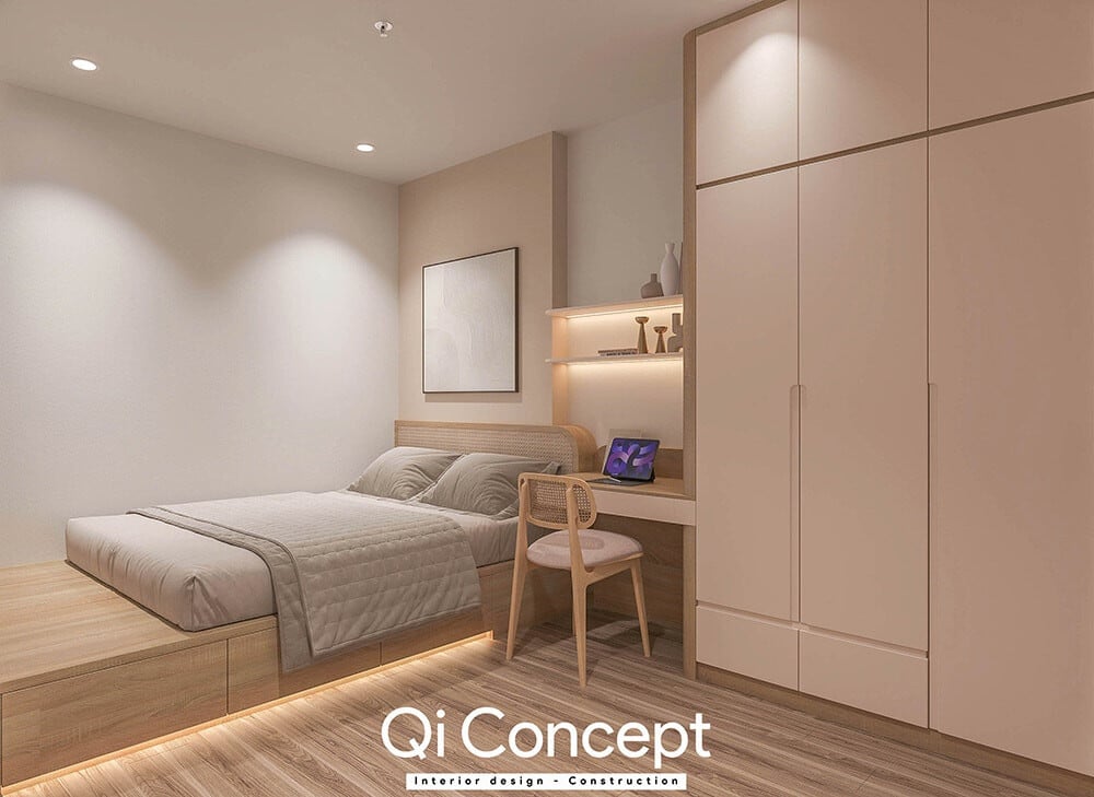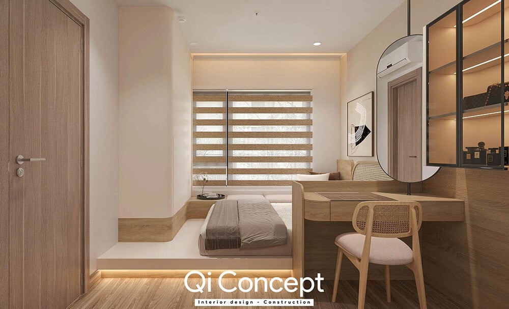 • Phòng ngủ Master: Được ví như một "ốc đảo" thu nhỏ với giường ngủ dạng bục (platform bed) nối liền với bàn trang điểm và góc thư giãn bên cửa sổ. Mọi thứ được quy hoạch gọn gàng để nhường chỗ cho sự nghỉ ngơi tuyệt đối.