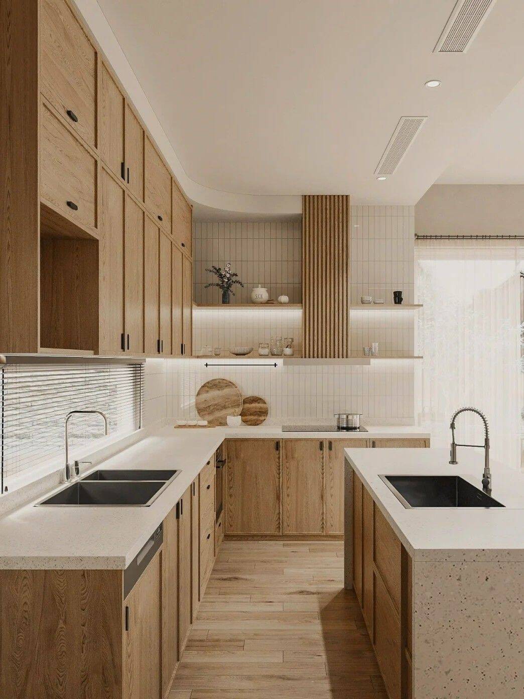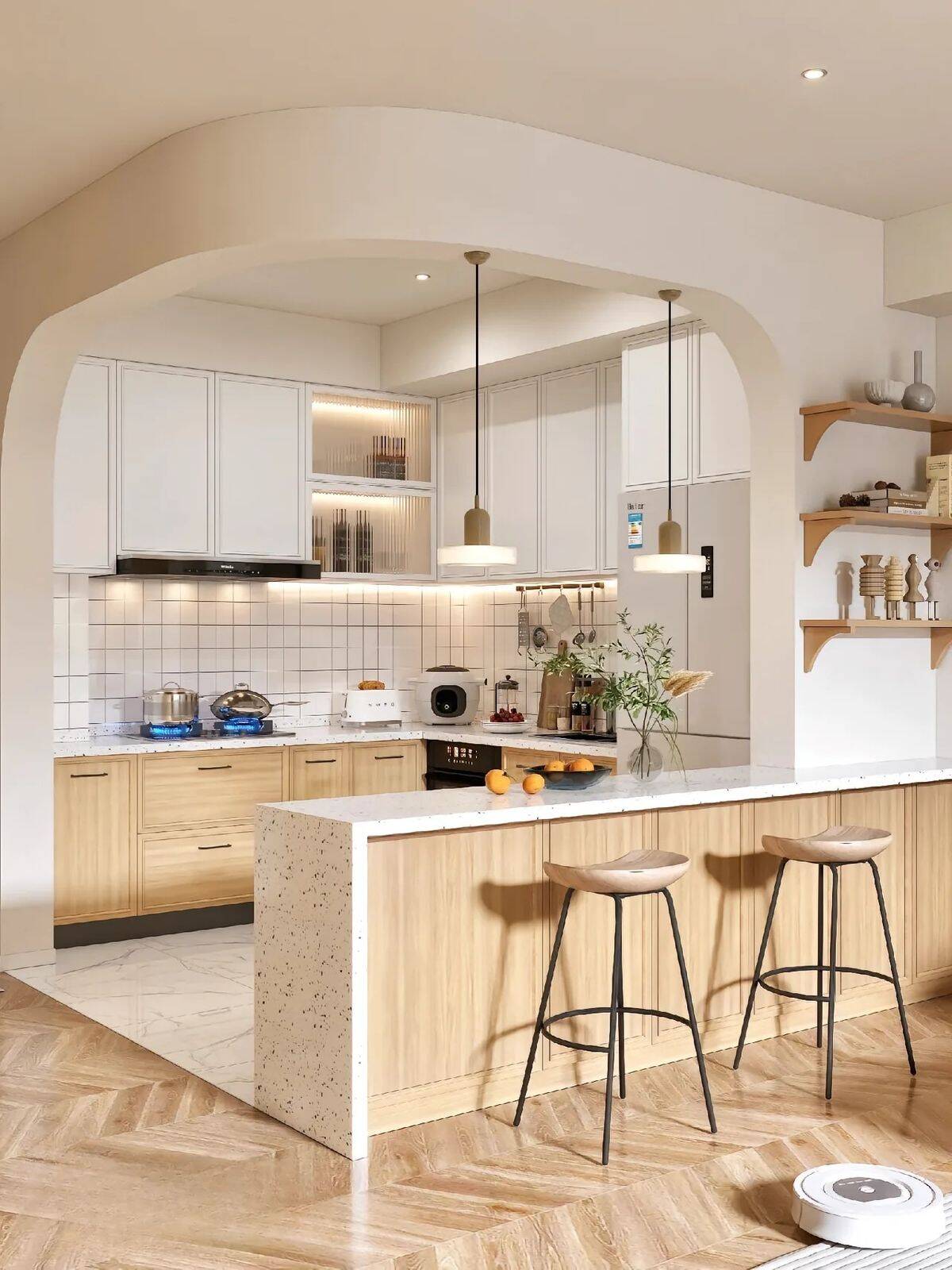 Các mẫu thiết kế nội thất phòng bếp chữ L tiếp tục là lựa chọn nổi bật trong năm 2026 nhờ khả năng khai thác góc chết hiệu quả. Quầy bếp chạy dọc tường, tủ kịch trần và hộc kéo thông minh giúp tăng đáng kể diện tích lưu trữ. Tone màu sáng - gỗ nhạt mang đến cảm giác thoáng đãng, phù hợp với nhà ống hẹp hoặc căn hộ dưới 70m2. Đây là giải pháp lý tưởng cho gia đình trẻ muốn vừa tiết kiệm diện tích, vừa có bếp đẹp để nấu nướng mỗi ngày.