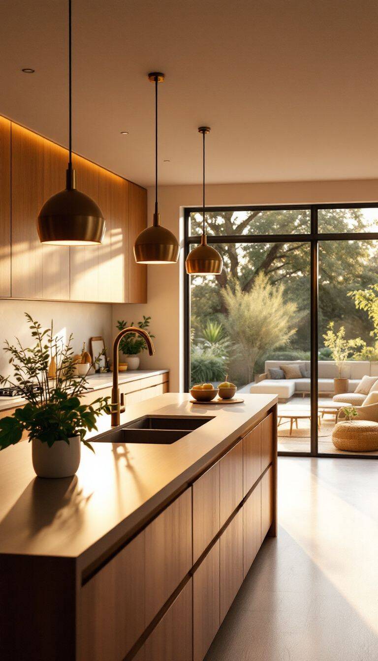 Xu hướng 2026 ưu tiên vật liệu bền vững: gạch giả xi măng chống bám bẩn, gỗ công nghiệp chống ẩm và mặt đá quartz dễ vệ sinh. Hệ đèn led âm tủ, đèn mặt bếp và ánh sáng vàng nhẹ tạo nên cảm giác ấm cúng cho gia đình. Trong thiết kế nội thất phòng bếp, việc tính toán ánh sáng đúng cách còn giúp màu sắc món ăn lên đẹp hơn, tạo cảm hứng nấu nướng và giữ không gian luôn sạch sẽ, tinh tế.