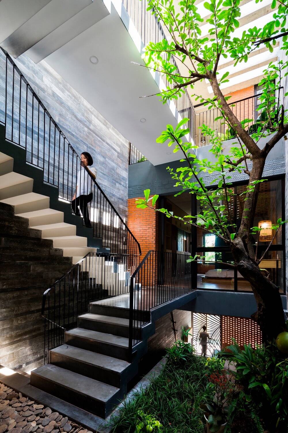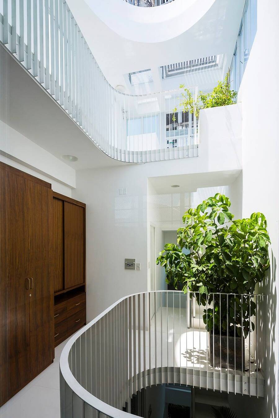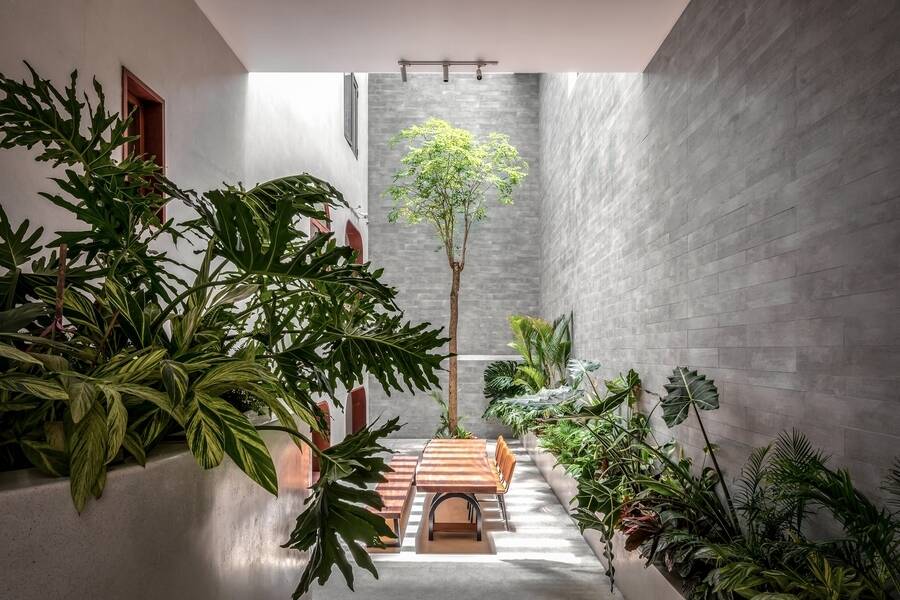 Mái lam phù hợp cho những ngôi nhà muốn ưu tiên thông gió nhiều hơn ánh sáng trực tiếp. Hệ lam ngang hoặc lam đứng tạo các khe thoáng, cho gió lưu thông liên tục, giảm tích nhiệt trong nhà. Khi bố trí lam đúng hướng gió, giếng trời sẽ hỗ trợ đối lưu khí, tạo sự mát mẻ mà không phụ thuộc nhiều vào điều hòa. Đây là kiểu thiết kế giếng trời được ưa chuộng tại các thành phố nóng như TP.HCM, Bình Dương, Đồng Nai.