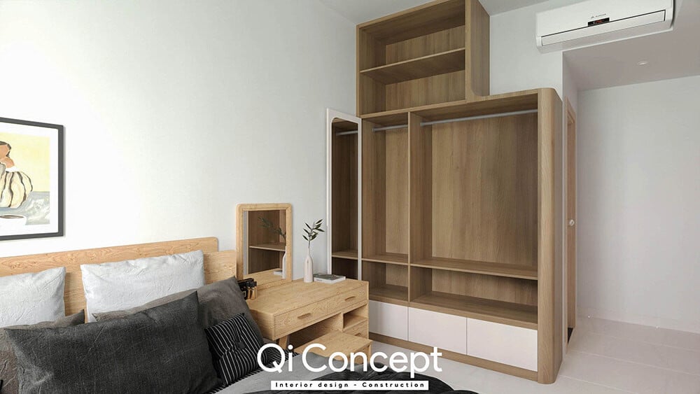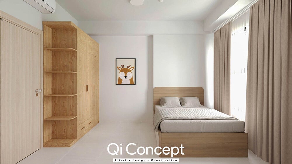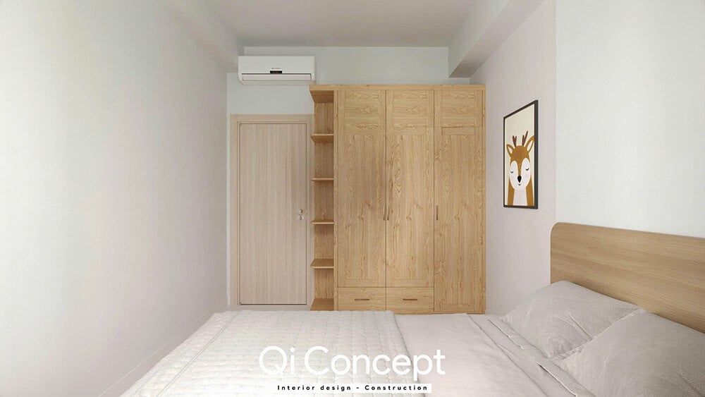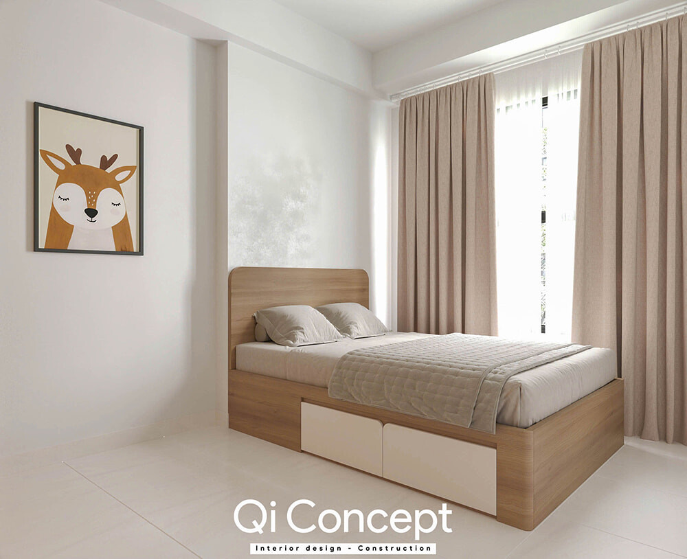 Tối ưu từng centimetVới diện tích khiêm tốn hơn, giải pháp nội thất thông minh được áp dụng triệt để. Giường ngủ tích hợp ngăn kéo (hộc kéo) bên dưới gầm và tủ quần áo kịch trần giúp tăng gấp đôi khả năng lưu trữ. Không gian nhờ đó mà luôn gọn gàng, ngăn nắp - điều cực kỳ quan trọng với những gia đình có nhiều đồ đạc.