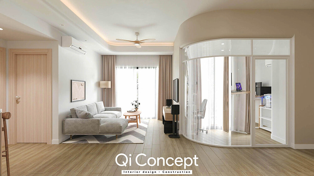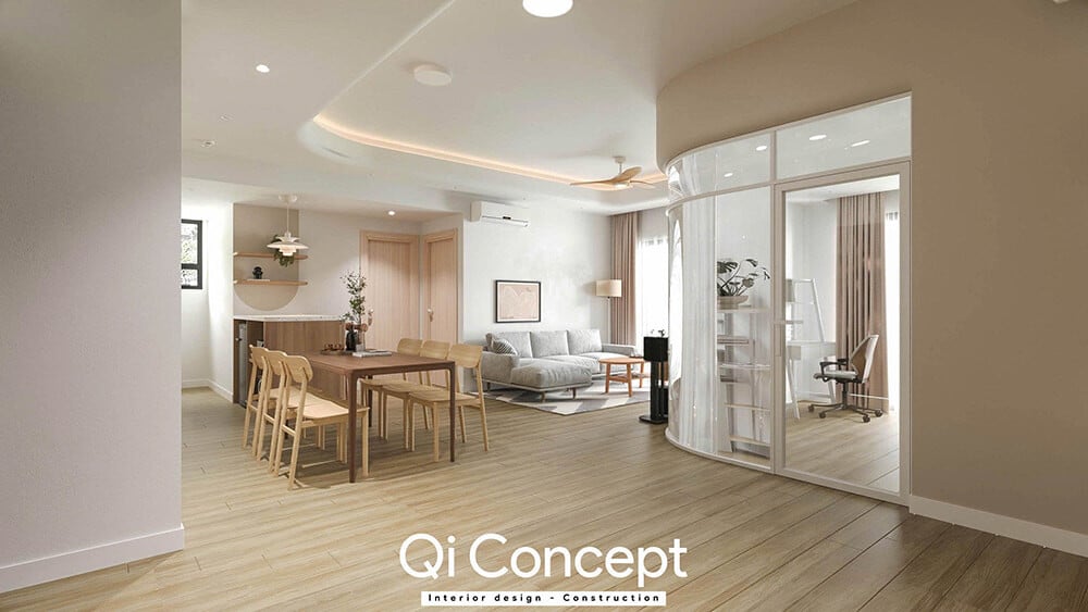 - Điểm nhấn:Sử dụng các đường cong mềm mại từ trần thạch cao đến vách kính bo tròn. Chi tiết này không chỉ mang tính thẩm mỹ cao mà còn giúp không gian trở nên uyển chuyển, nghệ thuật hơn, xóa tan sự khô khan thường thấy của các căn hộ chung cư.
