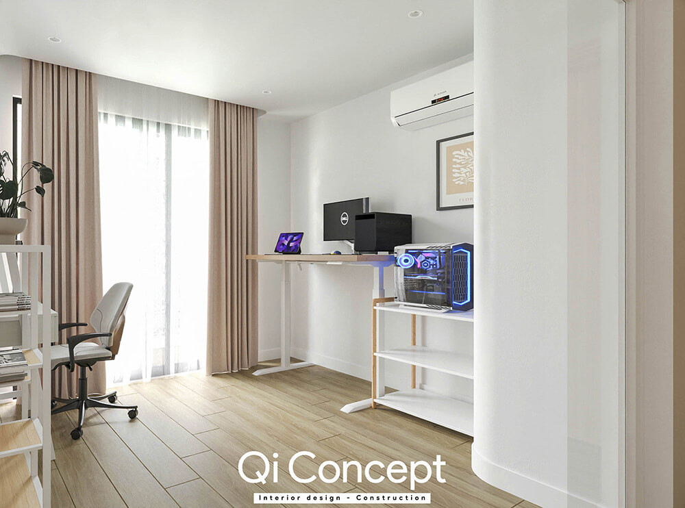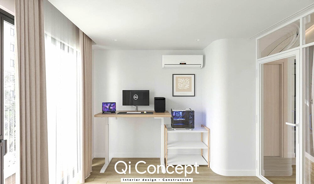 Đây là một giải pháp mình cực kỳ tâm đắc. Phòng làm việc được ngăn cách bởi vách kính bo cong độc đáo. Điều này vừa đảm bảo sự yên tĩnh cần thiết để tập trung, vừa giữ được sự kết nối thị giác với các không gian khác, giúp căn nhà luôn tràn ngập ánh sáng.