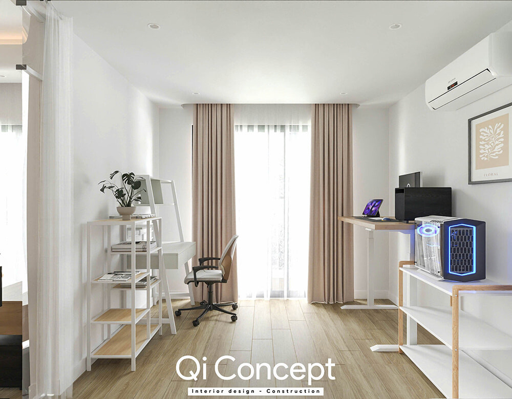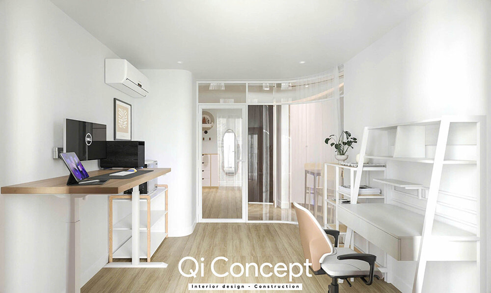 Nội thất:Bàn làm việc nâng hạ thông minh và hệ kệ mở tối giản là những lựa chọn ưu tiên để bảo vệ sức khỏe và tối ưu công năng.