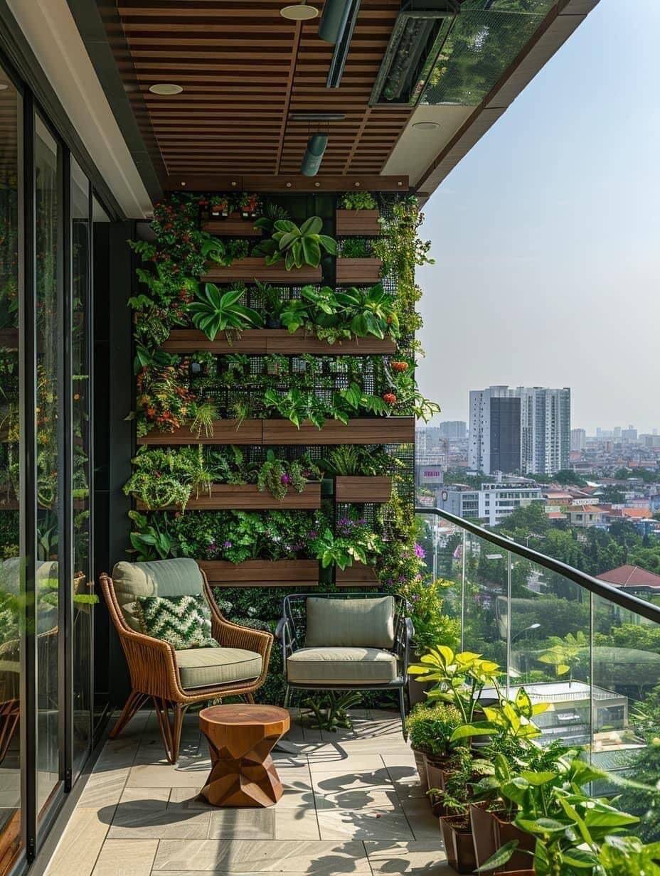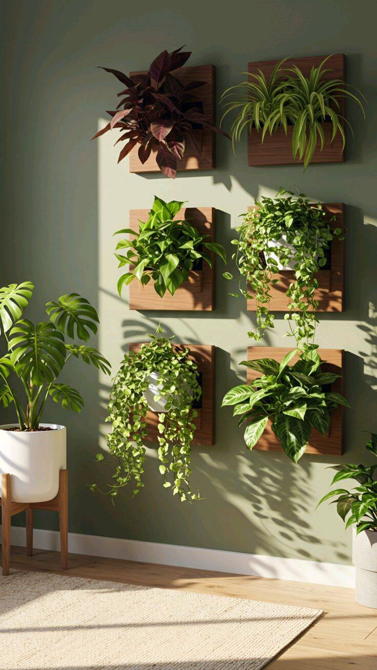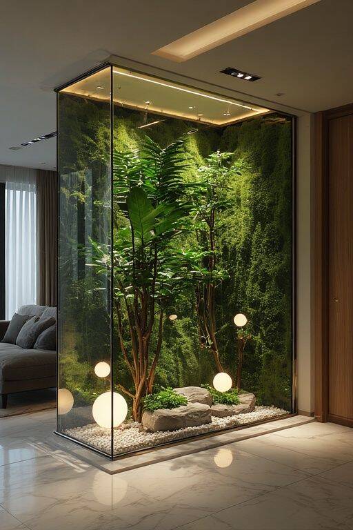 Tường cây trong phòng khách thường được bố trí tại mảng tường trống phía sau sofa hoặc khu vực tivi để tạo điểm nhấn thị giác. Việc kết hợp cây xanh với ánh sáng tự nhiên giúp không gian trở nên sinh động, thoáng đãng hơn. Các loại cây lá nhỏ, dễ chăm sóc thường được ưu tiên để đảm bảo tính bền vững lâu dài. Ngoài yếu tố thẩm mỹ, tường cây còn góp phần lọc không khí, giảm cảm giác bí bách trong nhà phố hoặc căn hộ.