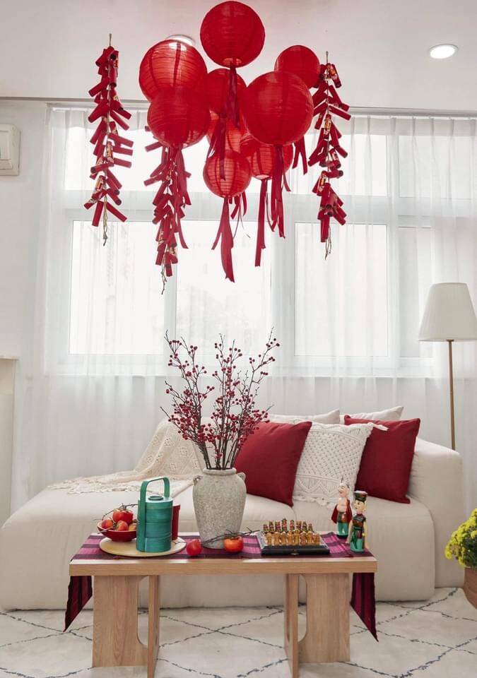 Thay vì tạo một khu vực riêng, bạn có thể biến một góc phòng khách thành góc chụp ảnh Tết. Sofa, bàn trà, thảm trải sàn chỉ cần thêm hoa xuân, gối tựa hoặc đèn trang trí là đã đủ tạo điểm nhấn. Cách làm này giúp góc chụp ảnh Tết vừa đẹp để chụp hình, vừa không phá vỡ công năng sinh hoạt hàng ngày.