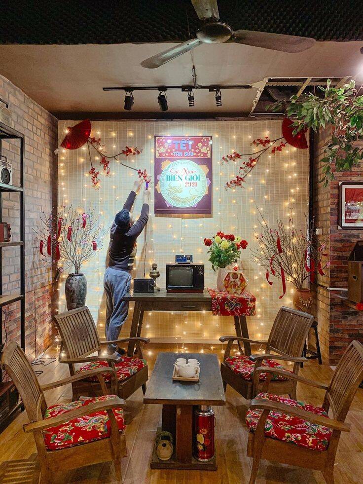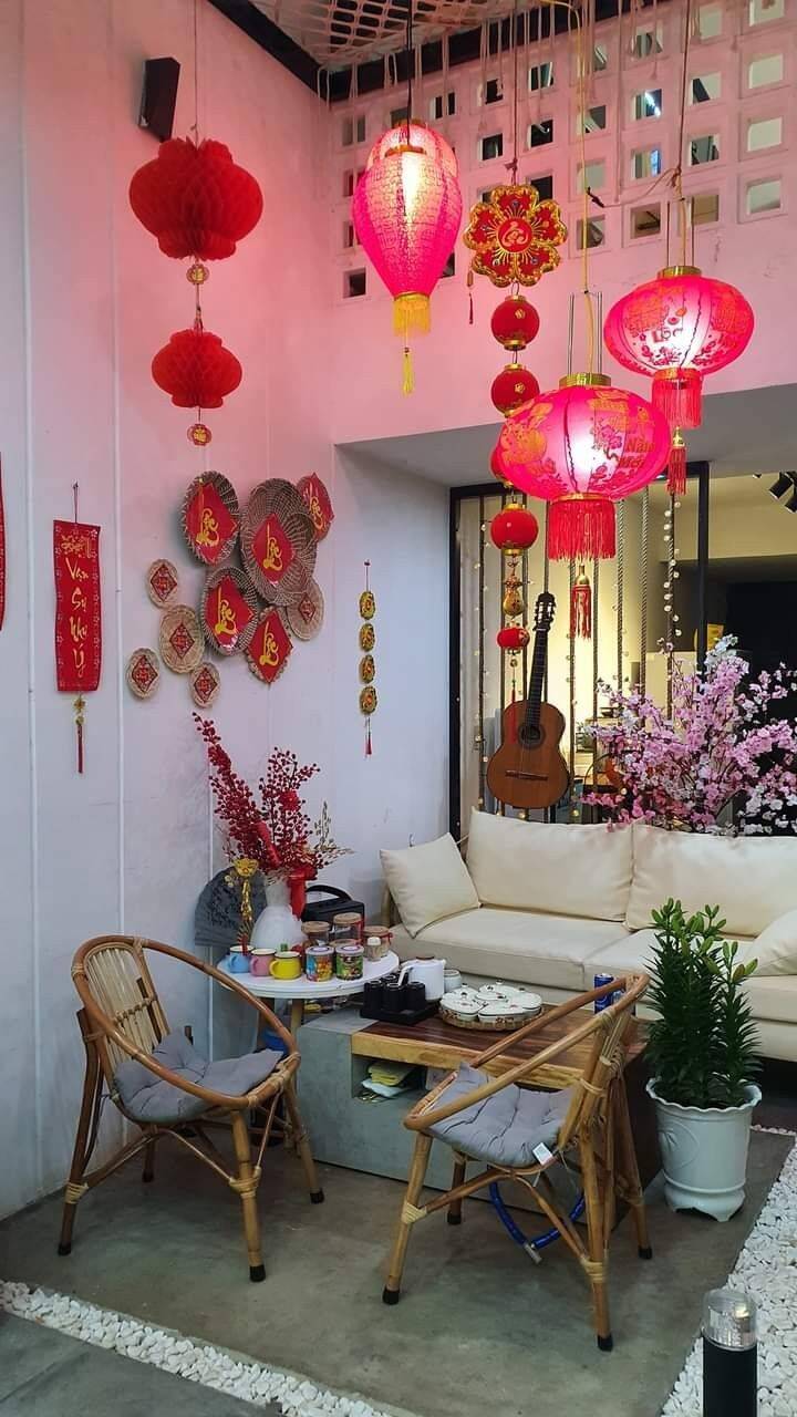 Góc chụp ảnh Tết mang hơi thở truyền thống thường sử dụng các chi tiết quen thuộc như hoa đào, hoa mai, câu đối đỏ, mành tre hoặc bàn gỗ nhỏ. Màu sắc chủ đạo là đỏ, vàng, nâu trầm, tạo cảm giác ấm áp và hoài niệm. Chỉ cần bố trí gọn gàng, ánh sáng tự nhiên là đã có một không gian chụp ảnh rất “Tết”.