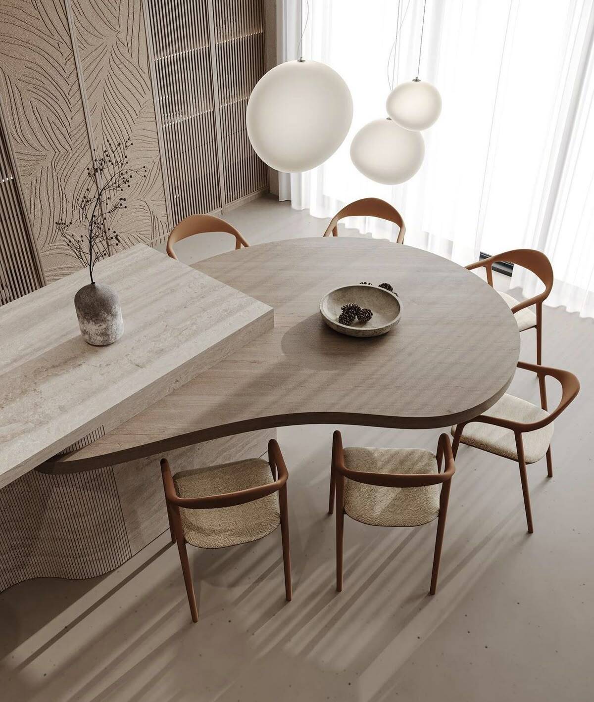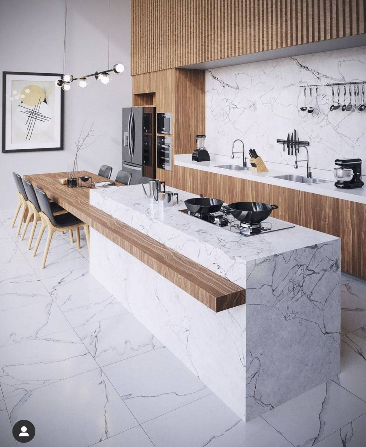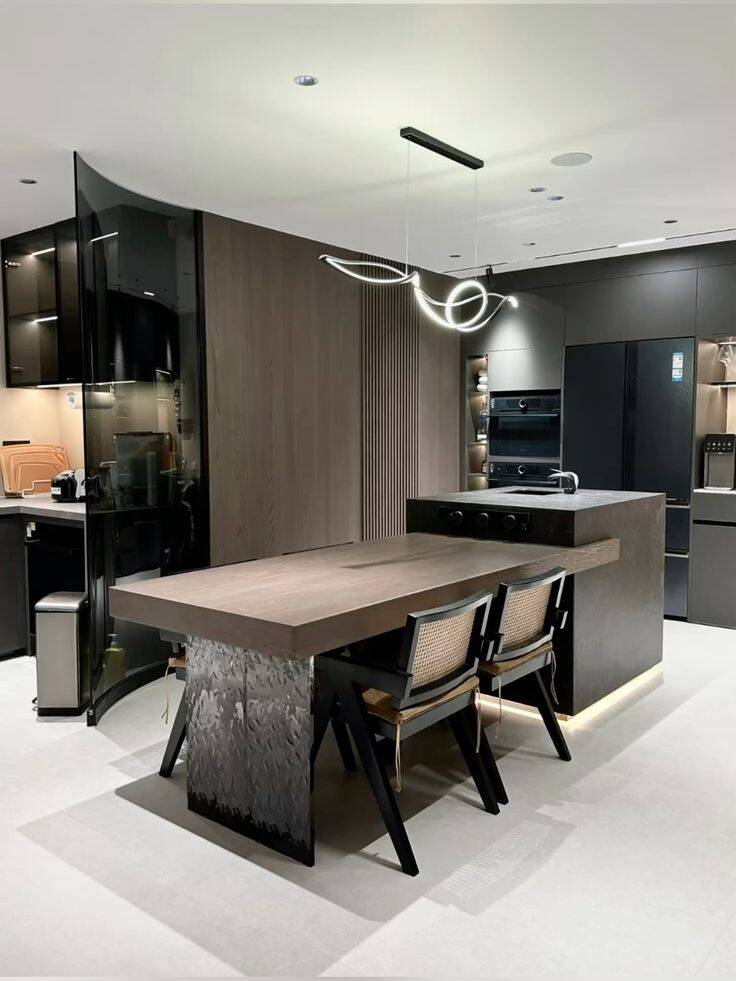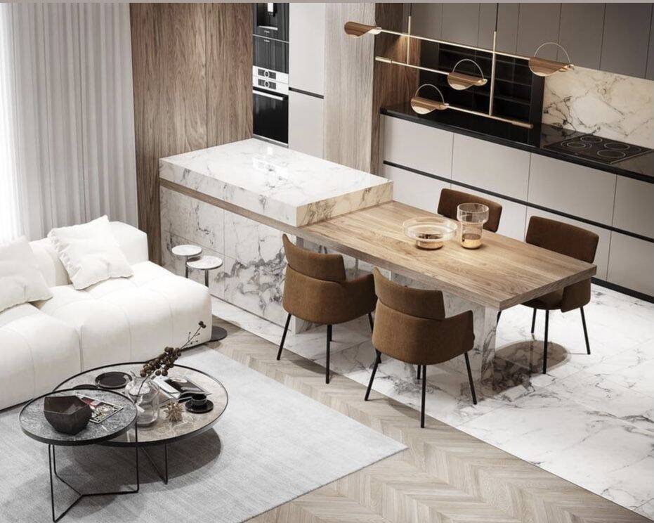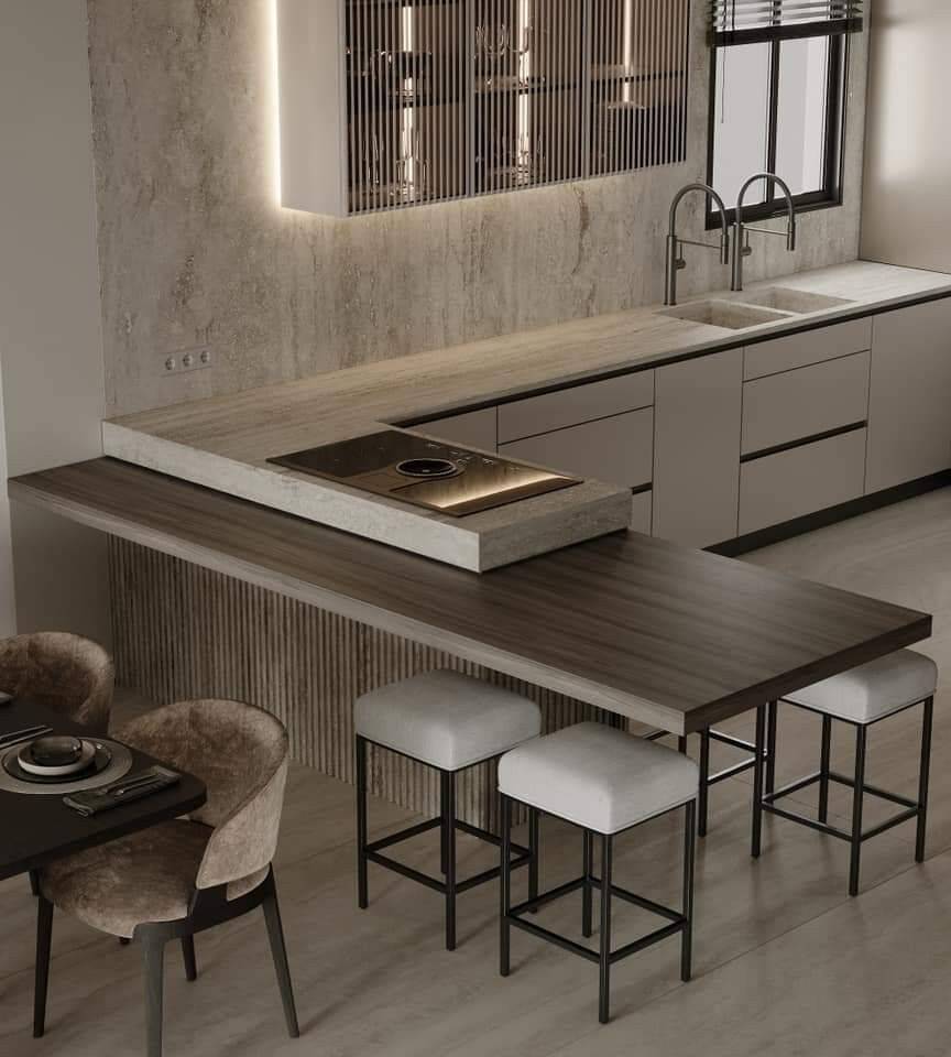 Mẫu bàn đảo kết hợp bàn ăn liền khối giúp giảm số lượng đồ nội thất trong bếp, từ đó tạo cảm giác không gian rộng và thoáng hơn. Phần bàn ăn thường được kéo dài từ đảo bếp, sử dụng chung vật liệu và chiều cao hợp lý để đảm bảo sự liền mạch.
