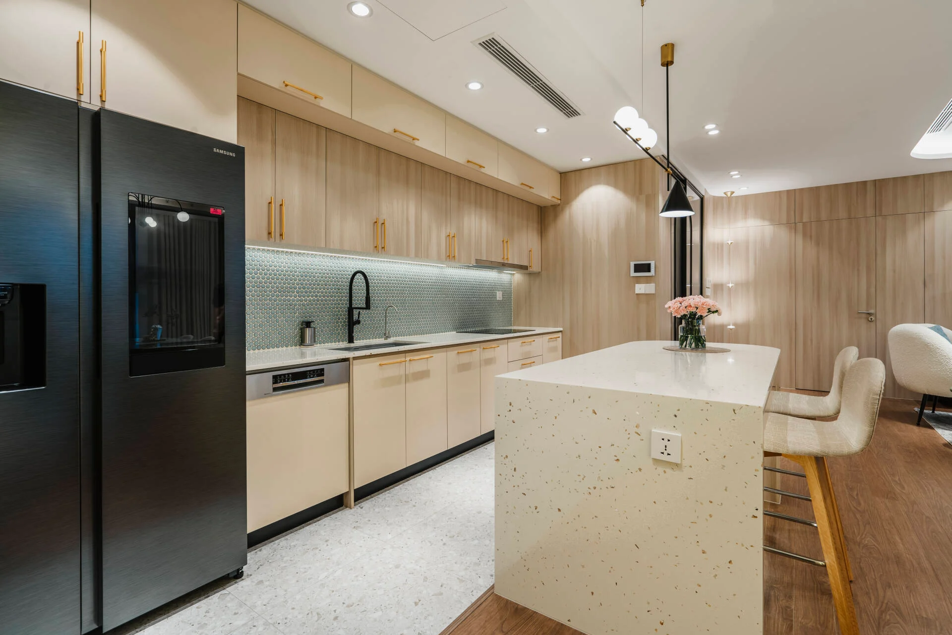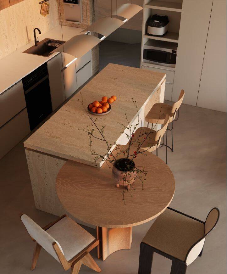 Với bố cục chữ L, bàn đảo kết hợp bàn ăn giúp phân tách tương đối rõ giữa khu vực nấu nướng và khu vực ăn uống. Cách bố trí này tạo sự thuận tiện trong sinh hoạt, đặc biệt phù hợp với gia đình đông người hoặc thường xuyên nấu nướng.