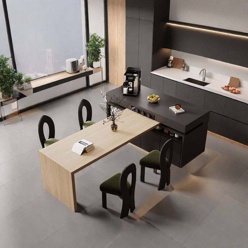 Một số bàn đảo kết hợp bàn ăn được thiết kế dạng xoay, gấp hoặc trượt, cho phép điều chỉnh kích thước tùy theo nhu cầu sử dụng. Khi không dùng đến, phần bàn ăn có thể thu gọn để trả lại không gian trống cho bếp.