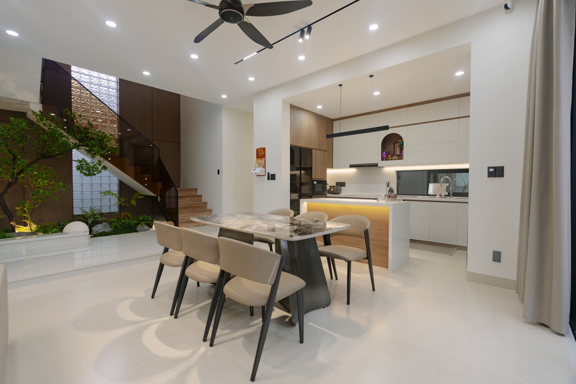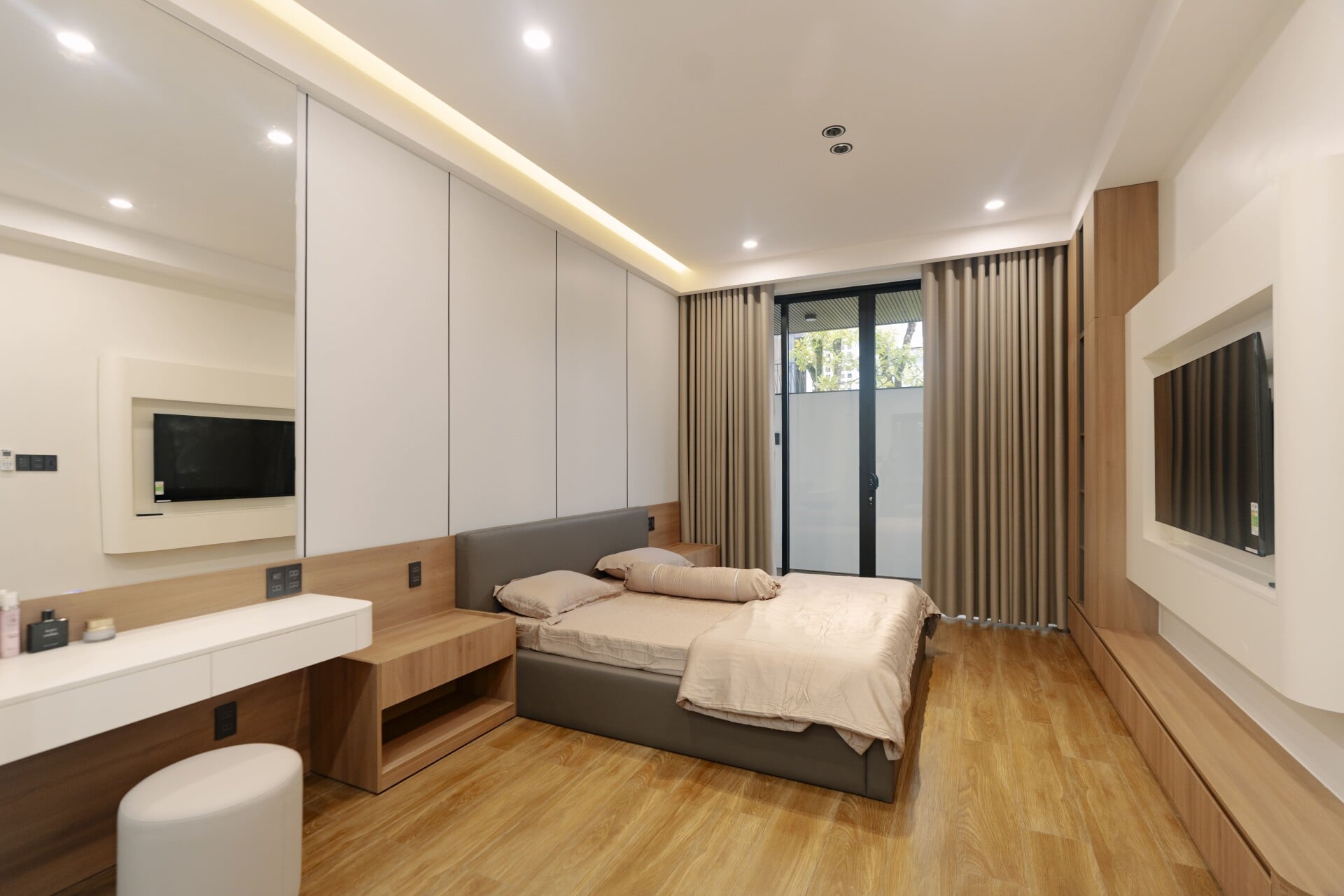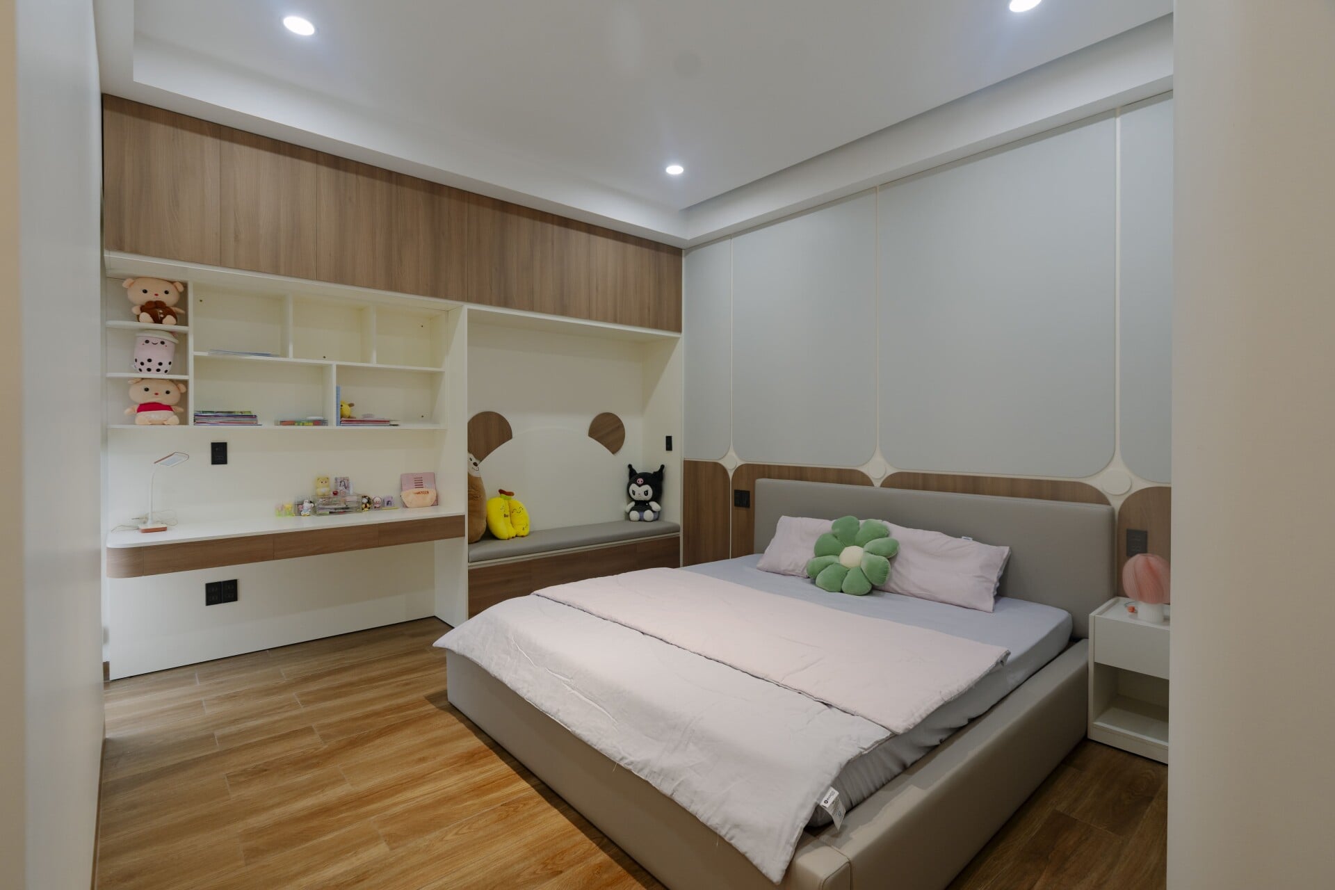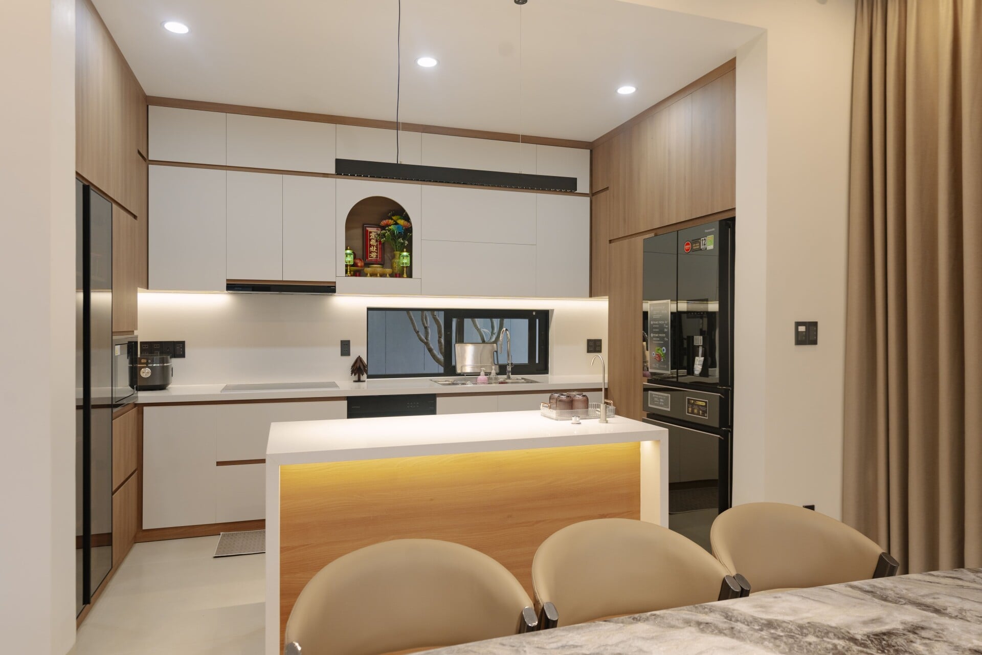 Sử dụng các mảng gỗ với tông màu tự nhiên, trung tính, từ các hệ tủ tích hợp cho các phòng, cho đến những chi tiết nội thất ở khu vực đảo bếp hay mảng ốp tường, đều trở thành “nền nhạc” dịu dàng, nâng đỡ và tôn vinh phong cách sống tinh tế hiện đại của gia chủ.
