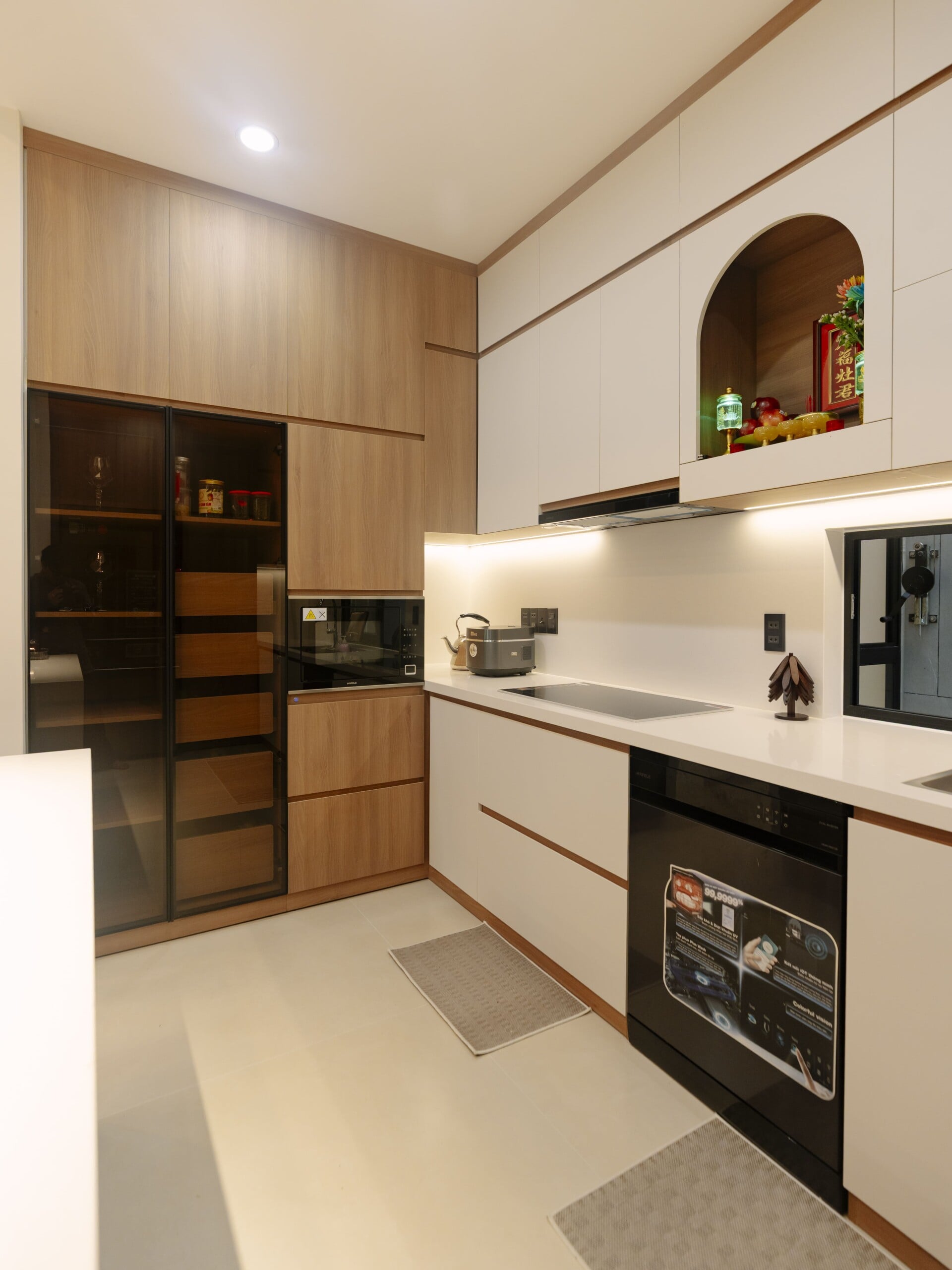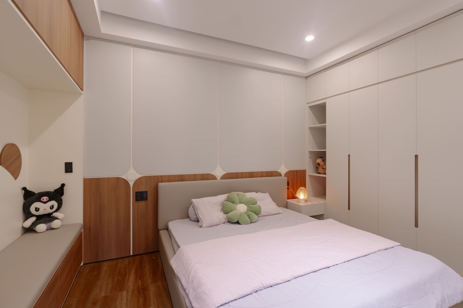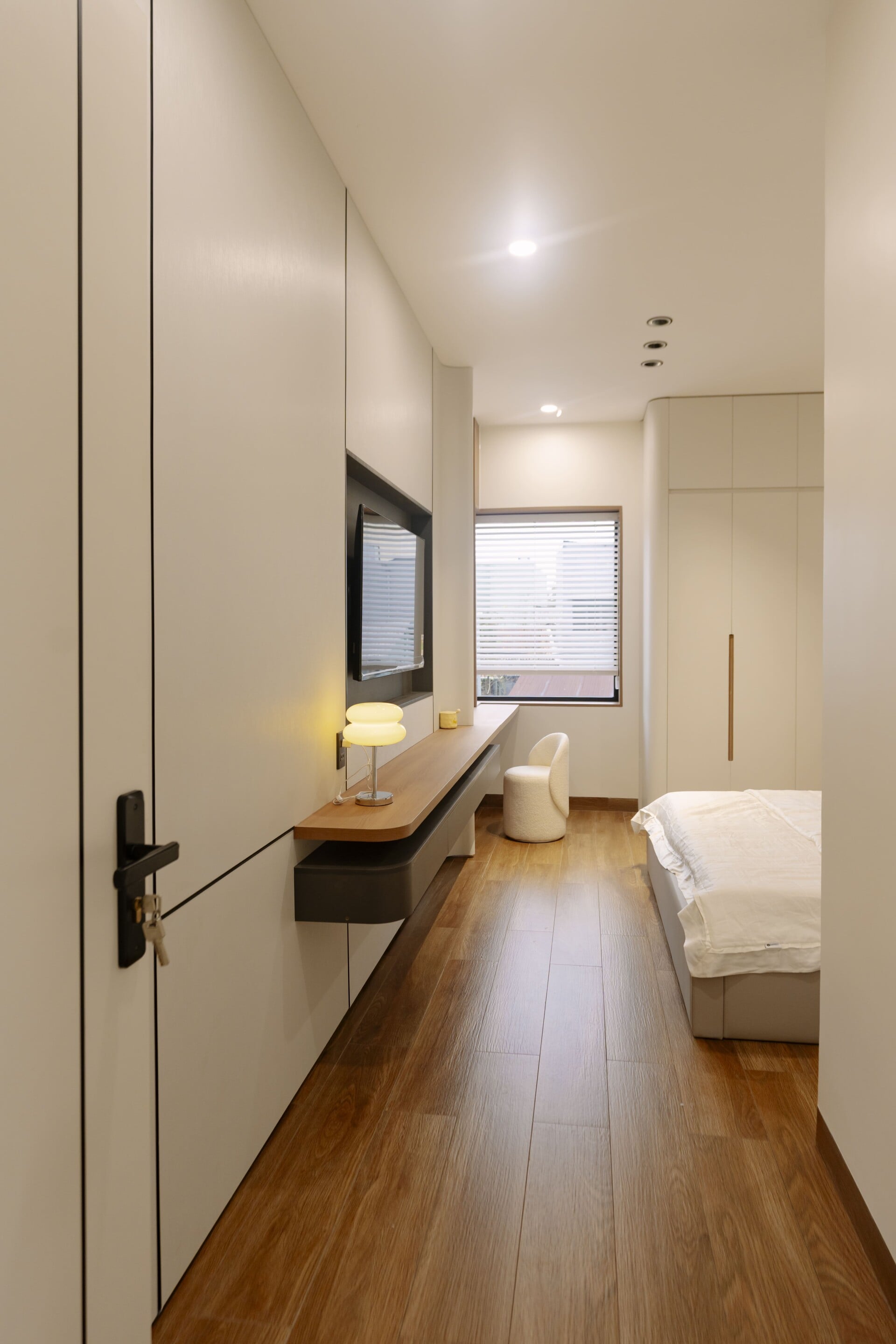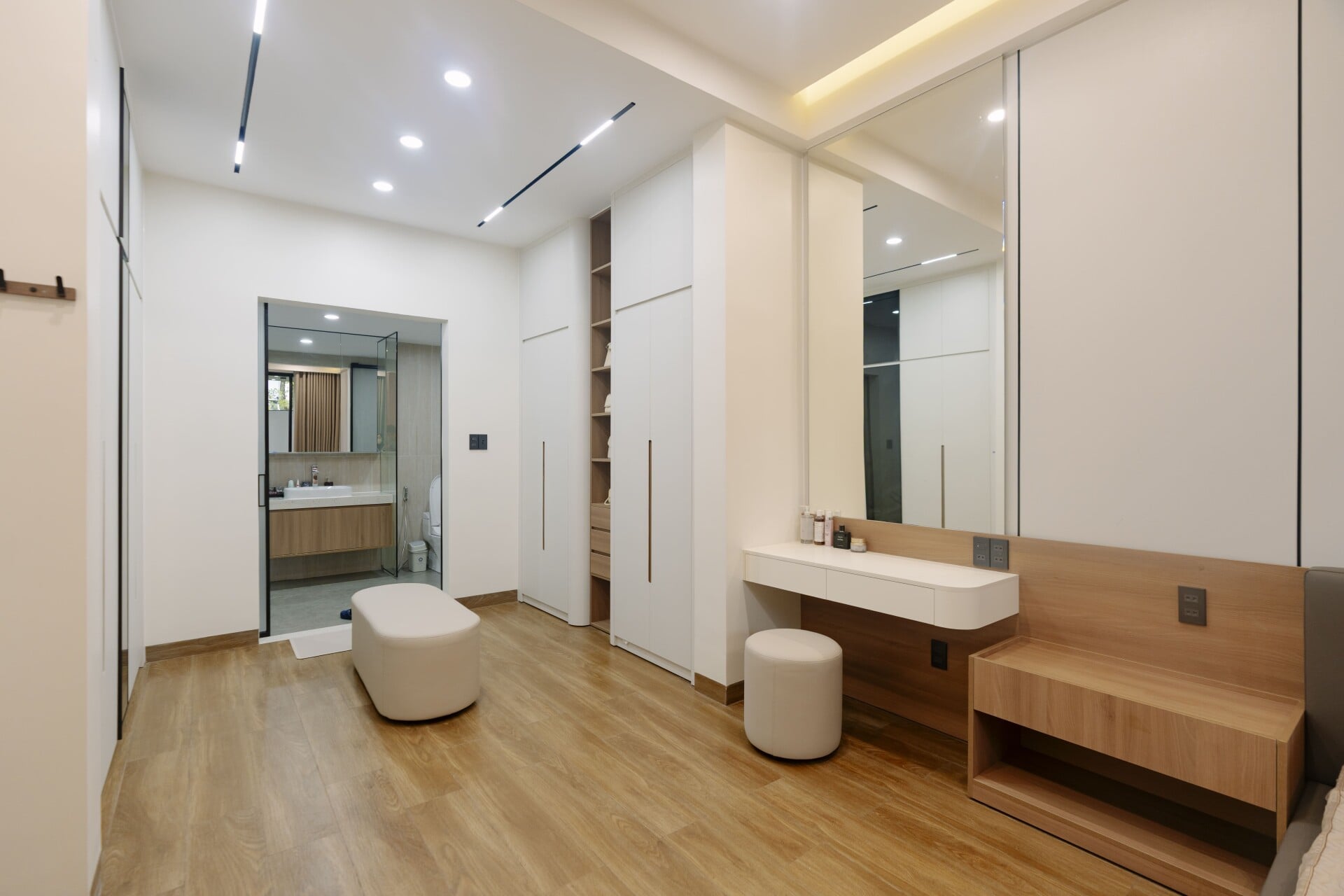 Sử dụng các mảng gỗ với tông màu tự nhiên, trung tính, từ các hệ tủ tích hợp cho các phòng, cho đến những chi tiết nội thất ở khu vực đảo bếp hay mảng ốp tường, đều trở thành “nền nhạc” dịu dàng, nâng đỡ và tôn vinh phong cách sống tinh tế hiện đại của gia chủ.