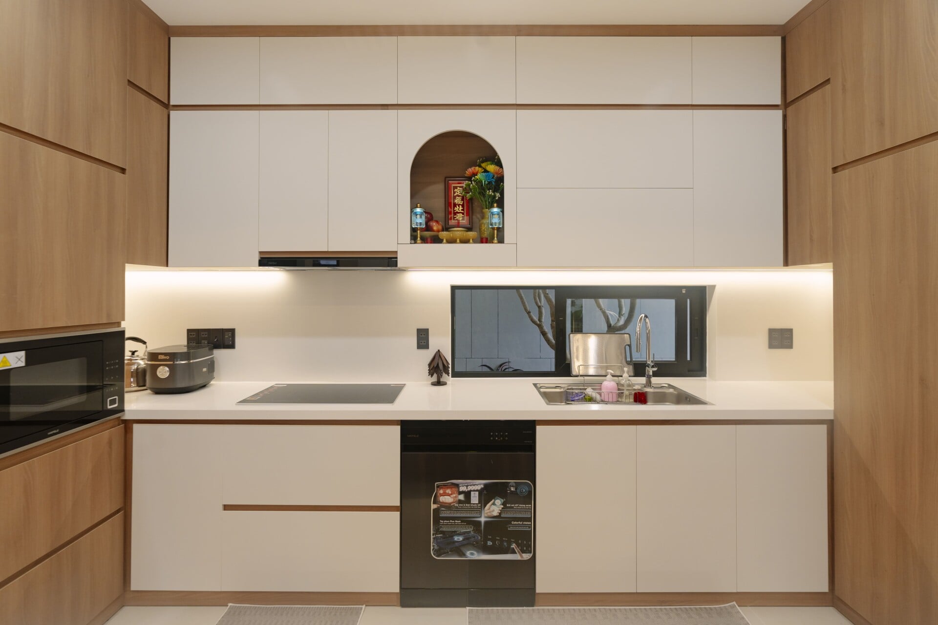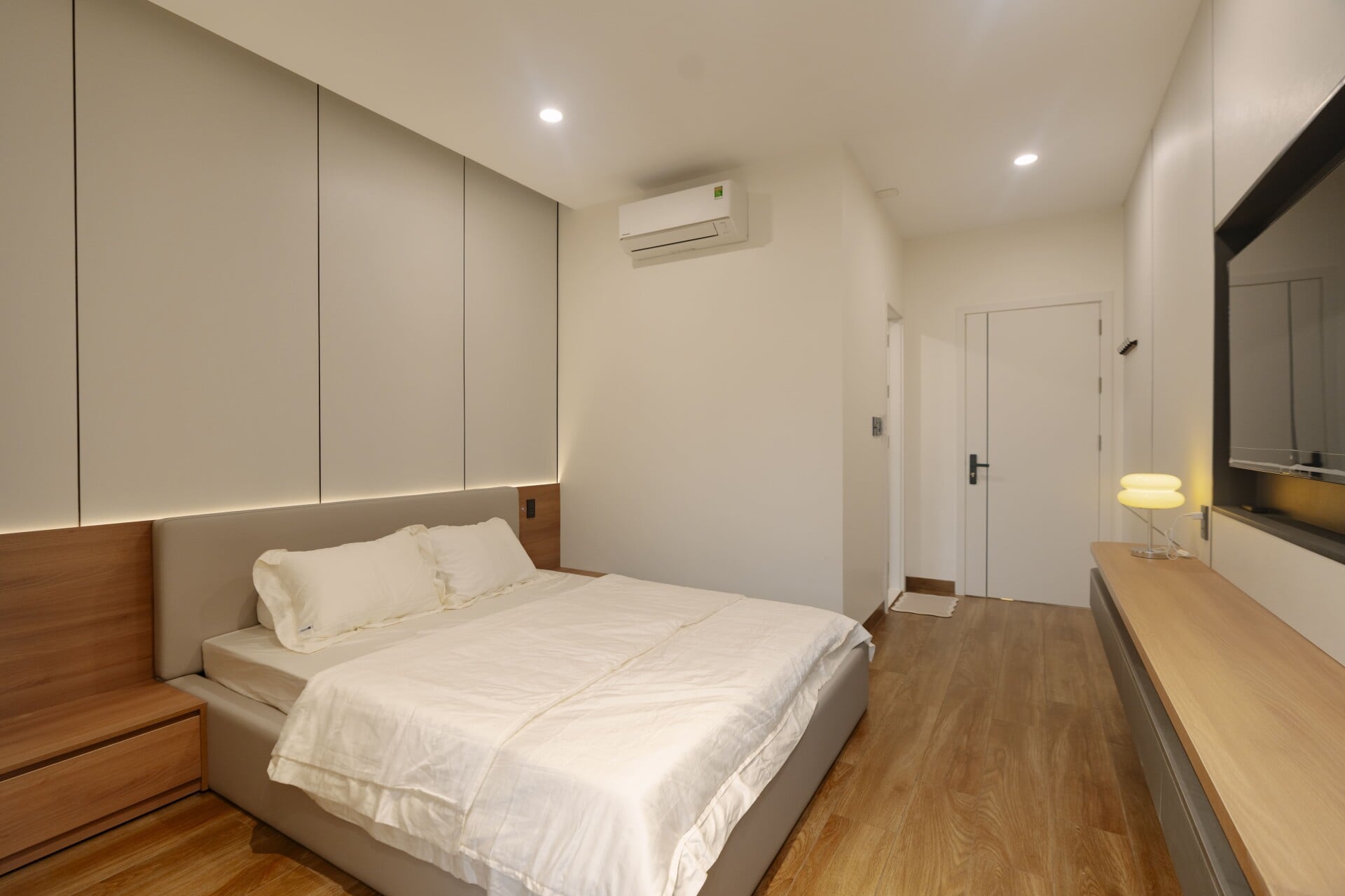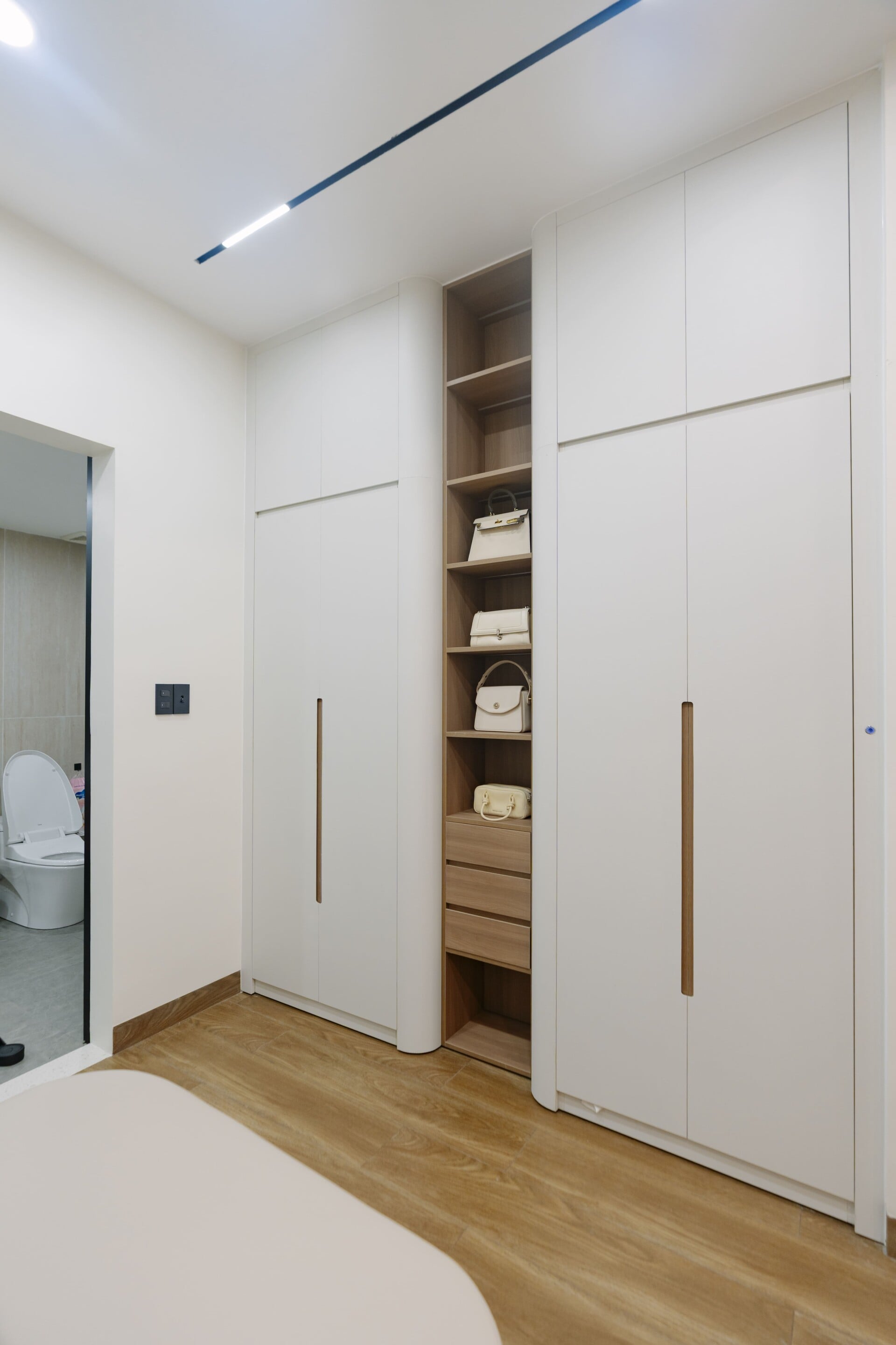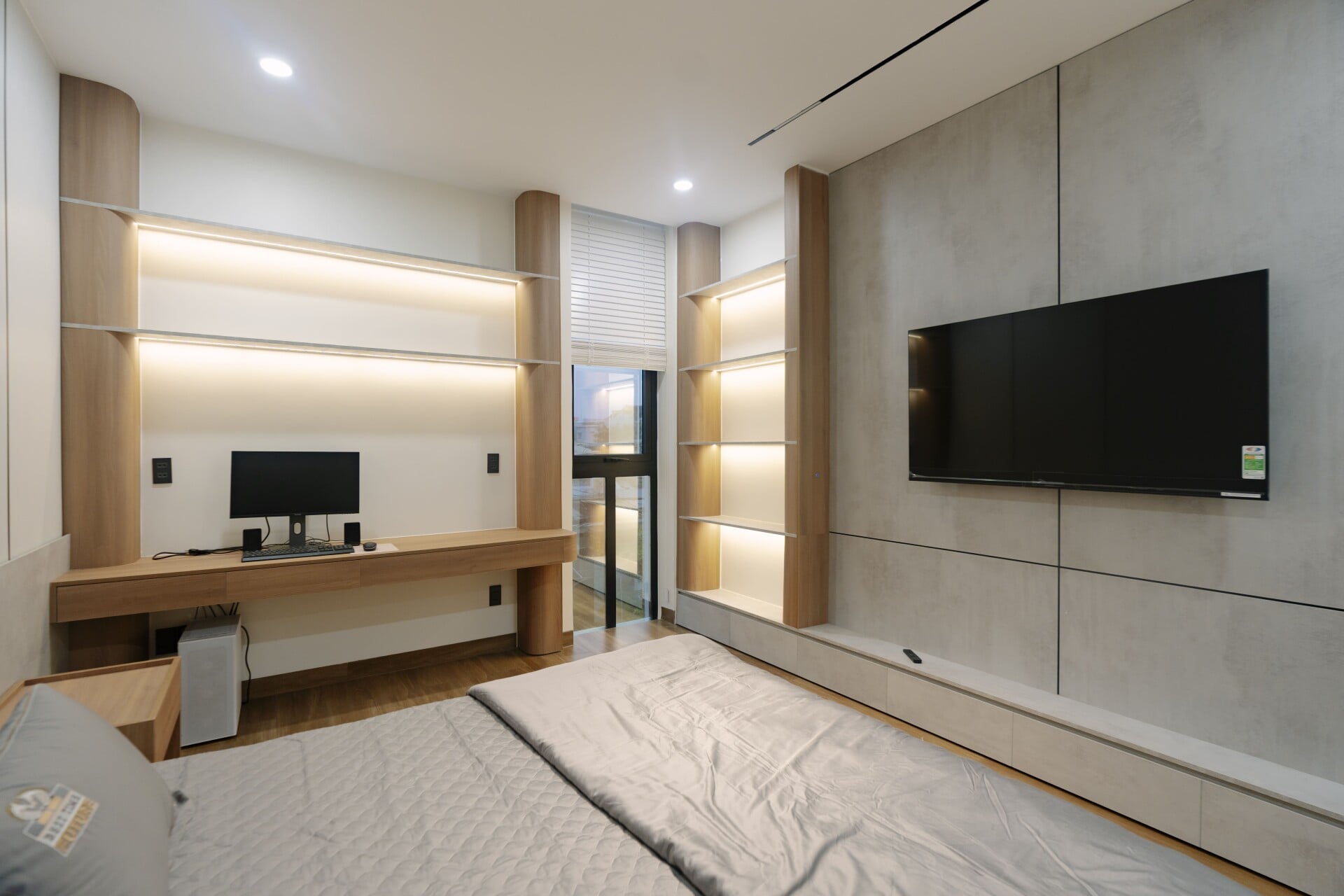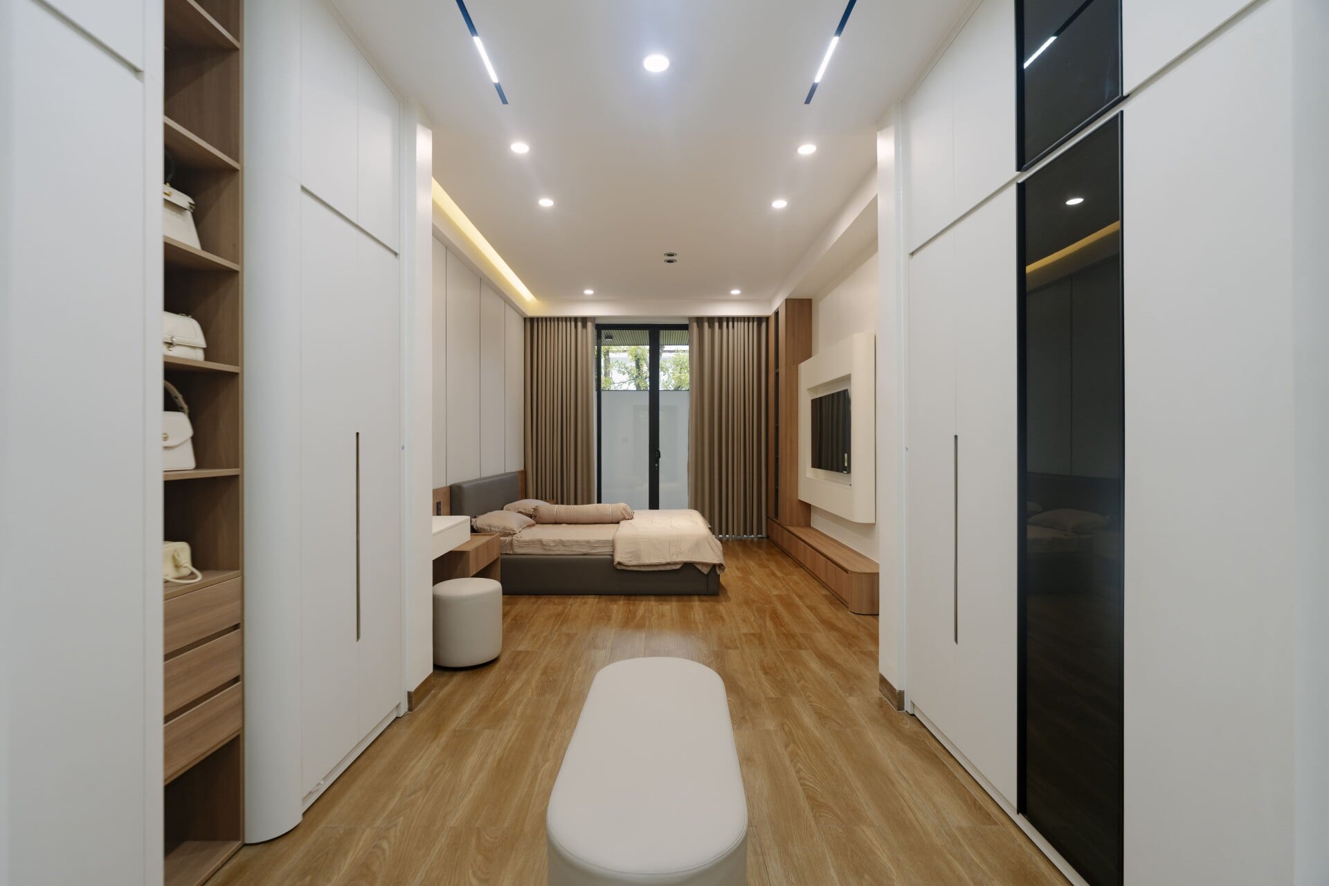 Sử dụng các mảng gỗ với tông màu tự nhiên, trung tính, từ các hệ tủ tích hợp cho các phòng, cho đến những chi tiết nội thất ở khu vực đảo bếp hay mảng ốp tường, đều trở thành “nền nhạc” dịu dàng, nâng đỡ và tôn vinh phong cách sống tinh tế hiện đại của gia chủ.