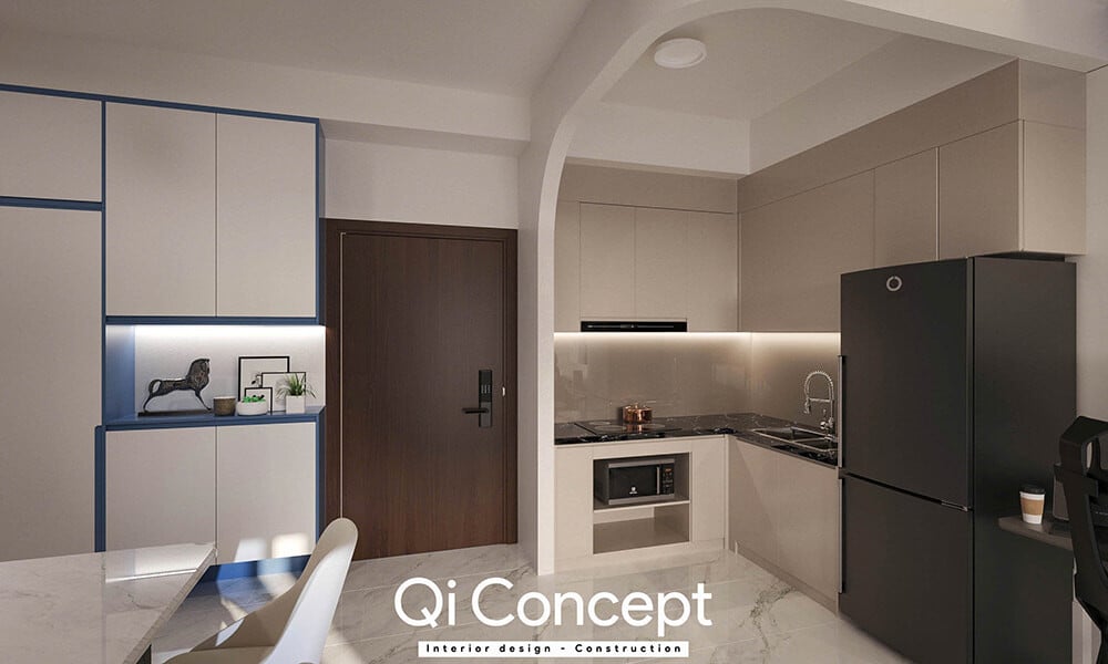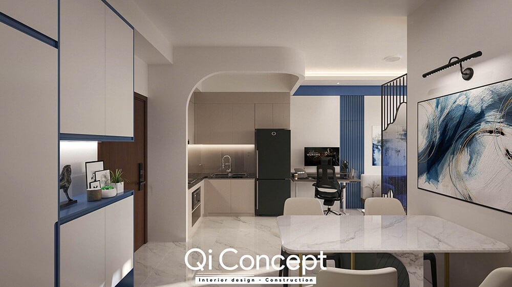 • Góc nhìn chuyên gia: Việc sử dụng màu trắng làm nền chủ đạo giúp "đánh lừa thị giác", khiến không gian sinh hoạt chung (khách - bếp liên thông) trông rộng hơn đáng kể. Màu xanh dương được nhấn nhá ở sofa và các mảng decor đóng vai trò tạo chiều sâu, giúp căn nhà không bị nhạt nhòa.
