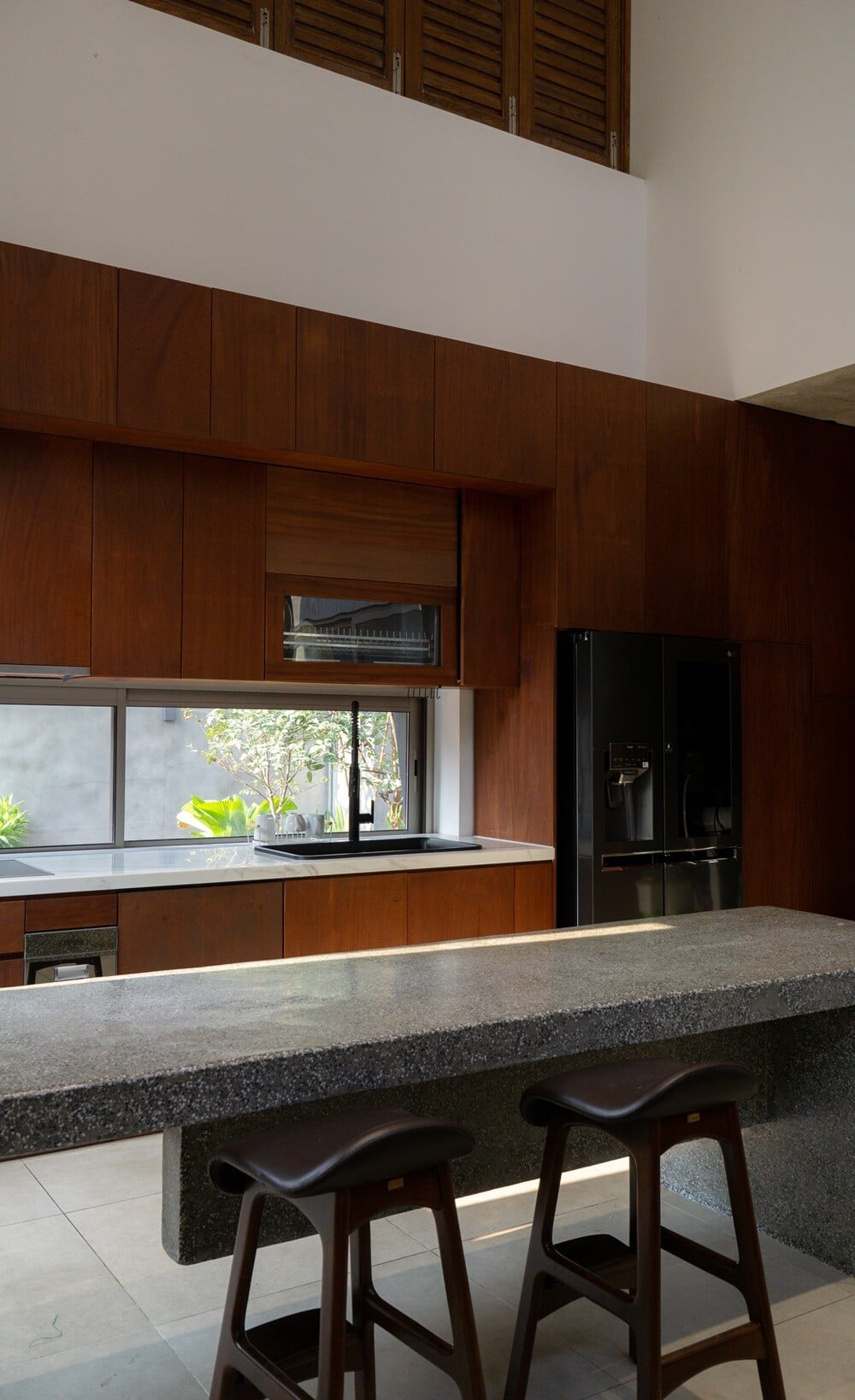 Công trình mang tinh thần hiện đại kết hợp hơi thở nhiệt đới Á Đông, ưu tiên phần lớn diện tích cho cây xanh và mặt nước. Mặt tiền sử dụng hệ cửa lá sách dài giúp tăng thông gió và gợi nhắc kiến trúc truyền thống, kết hợp vật liệu đá tổ ong và gỗ tạo cảm giác mộc mạc, bền vững. Bên trong, vật liệu thô và gỗ tự nhiên được nhấn nhá bằng khối container lệch tầng dành cho đọc sách và yoga, mang lại dấu ấn trẻ trung và khác biệt cho không gian sống.