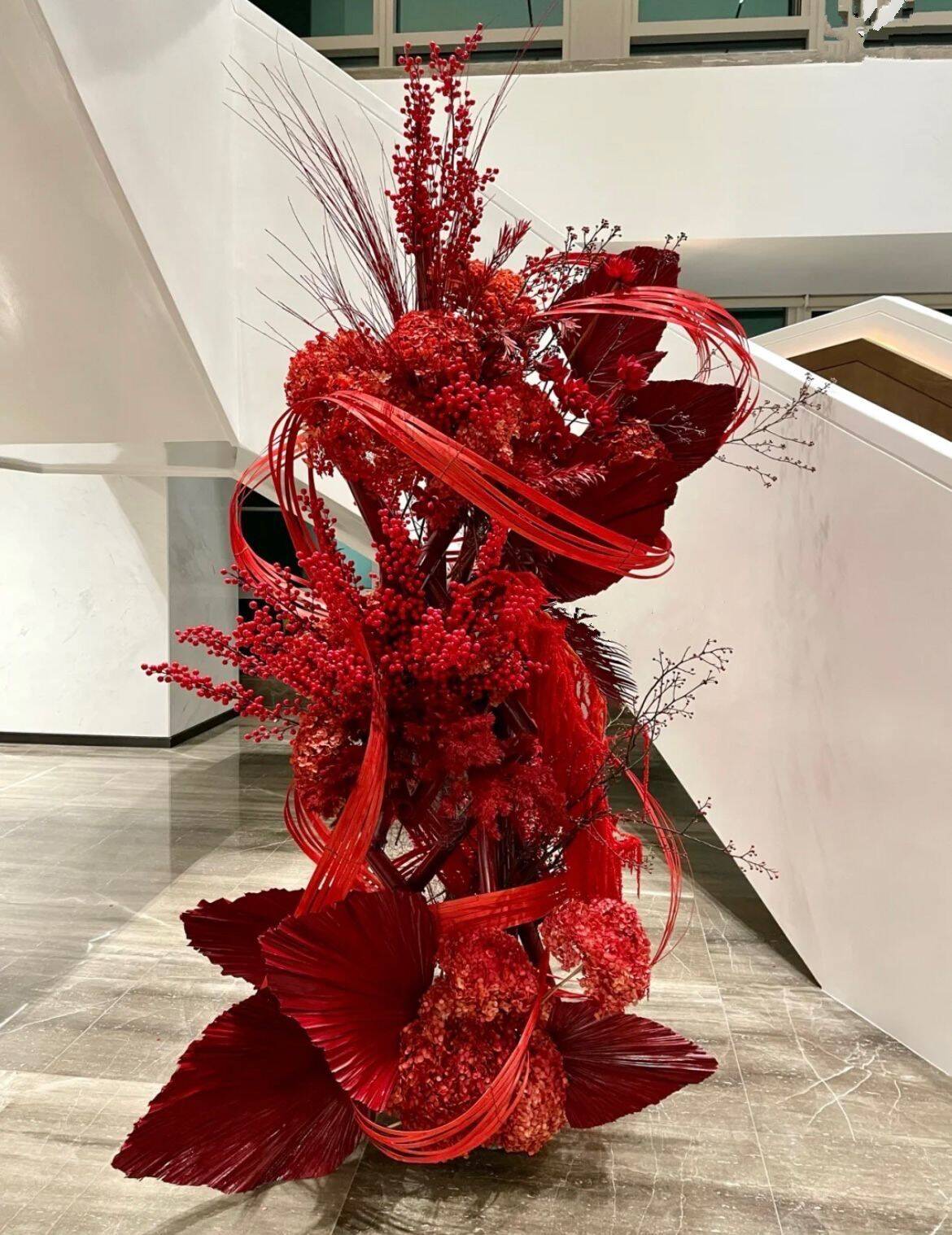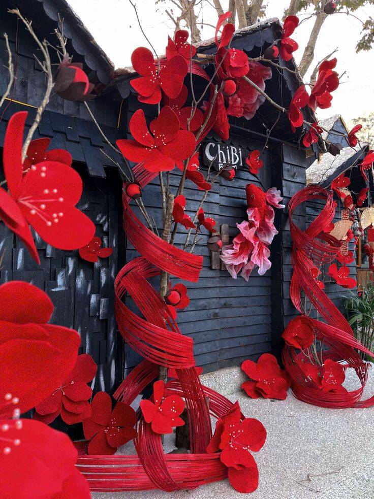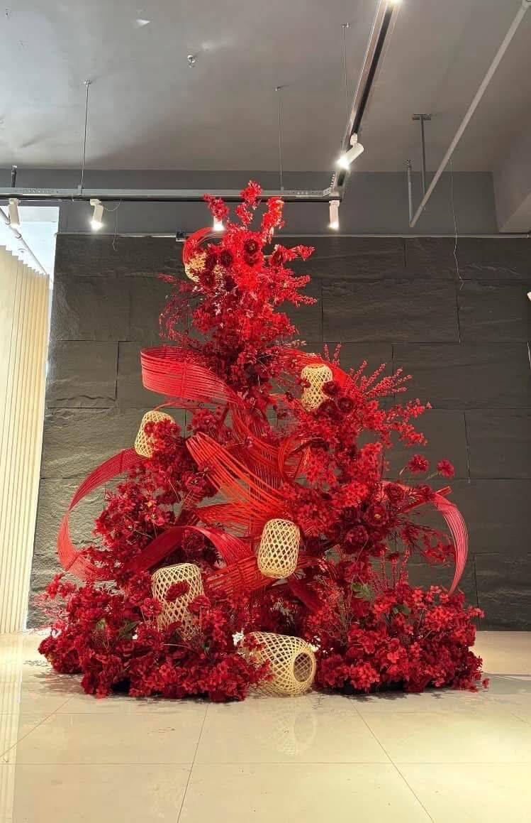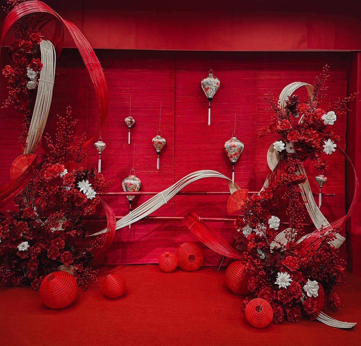Phên tre uốn dẻo làm backdrop trang trí Tết