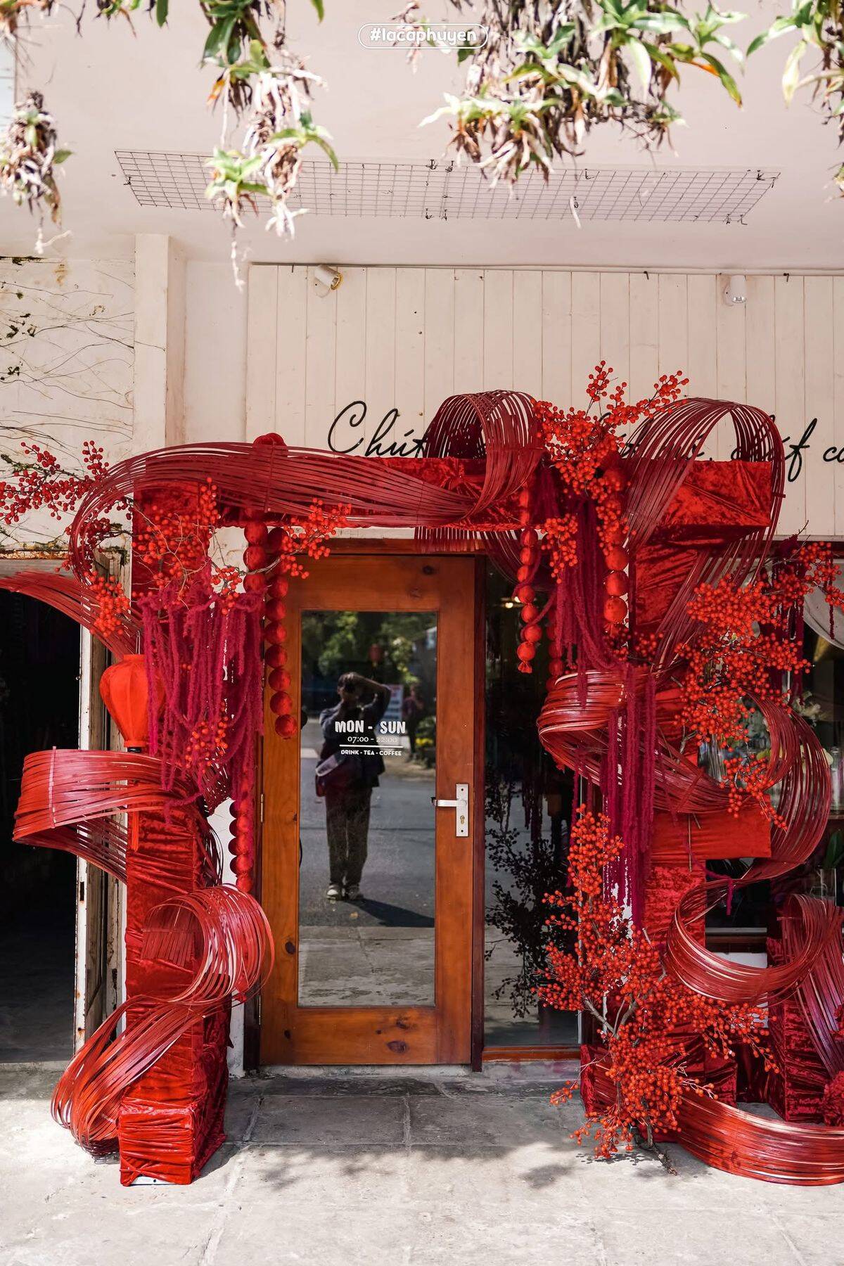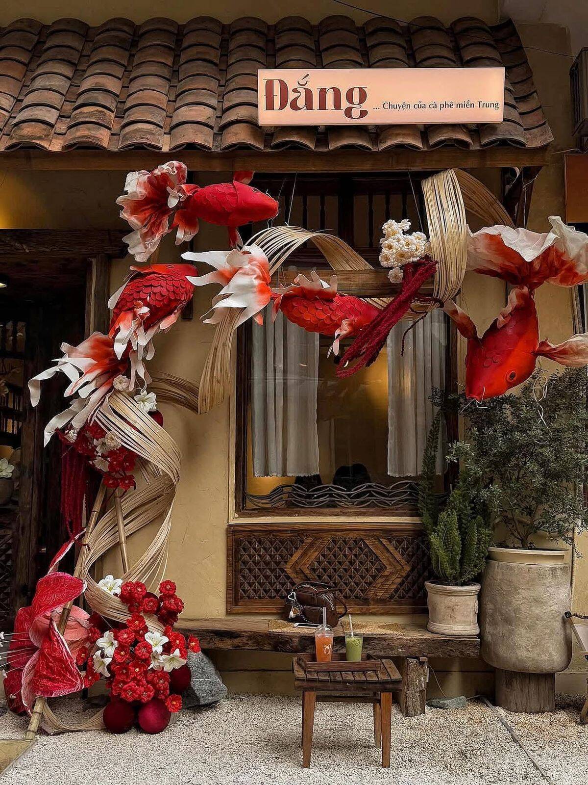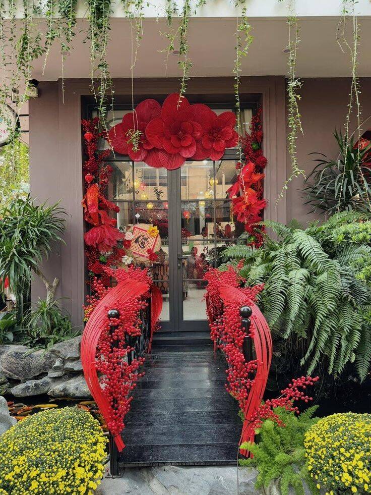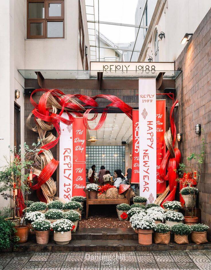 Với các quán cà phê, cửa hàng hoặc nhà phố, phên tre uốn dẻo là vật liệu lý tưởng để trang trí mặt tiền dịp Tết 2026. Phên tre có thể được uốn thành lớp che mềm, khung cong hoặc mảng treo trang trí, giúp không gian trở nên ấm áp và nổi bật giữa phố xá đông đúc. Chất liệu tre tự nhiên tạo cảm giác gần gũi, thân thiện, đồng thời dễ kết hợp với đèn dây, phụ kiện Tết hoặc bảng hiệu thủ công, mang lại hiệu ứng thị giác nhẹ nhàng nhưng đủ sức thu hút.