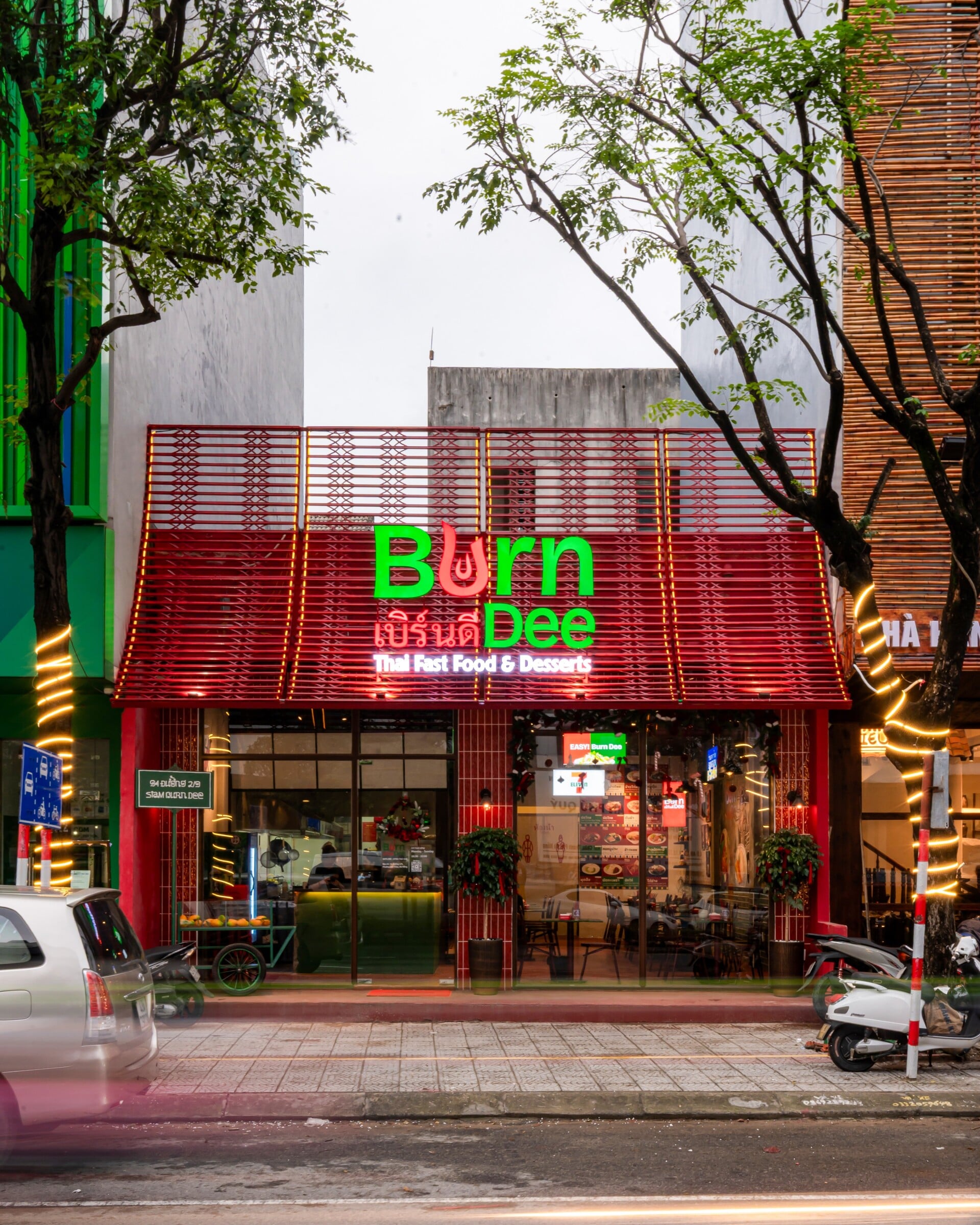 Nhà hàng Burn Dee tại Đà Nẵng do S2 Studio thiết kế và thi công hiện lên rõ nét với tinh thần đường phố Thái Lan phóng khoáng, sống động và rất “đời”. Ngay từ không gian ngoại thất, Burn Dee gây ấn tượng mạnh với mặt tiền đỏ rực – xanh lá đặc trưng, kết hợp hệ lam kim loại và bảng hiệu neon nổi bật. Cách xử lý mặt đứng gợi nhớ đến những quán ăn ven đường tại Bangkok, nơi ánh đèn, màu sắc và nhịp sống đô thị hòa quyện, thu hút ánh nhìn cả ban ngày lẫn khi phố lên đèn.