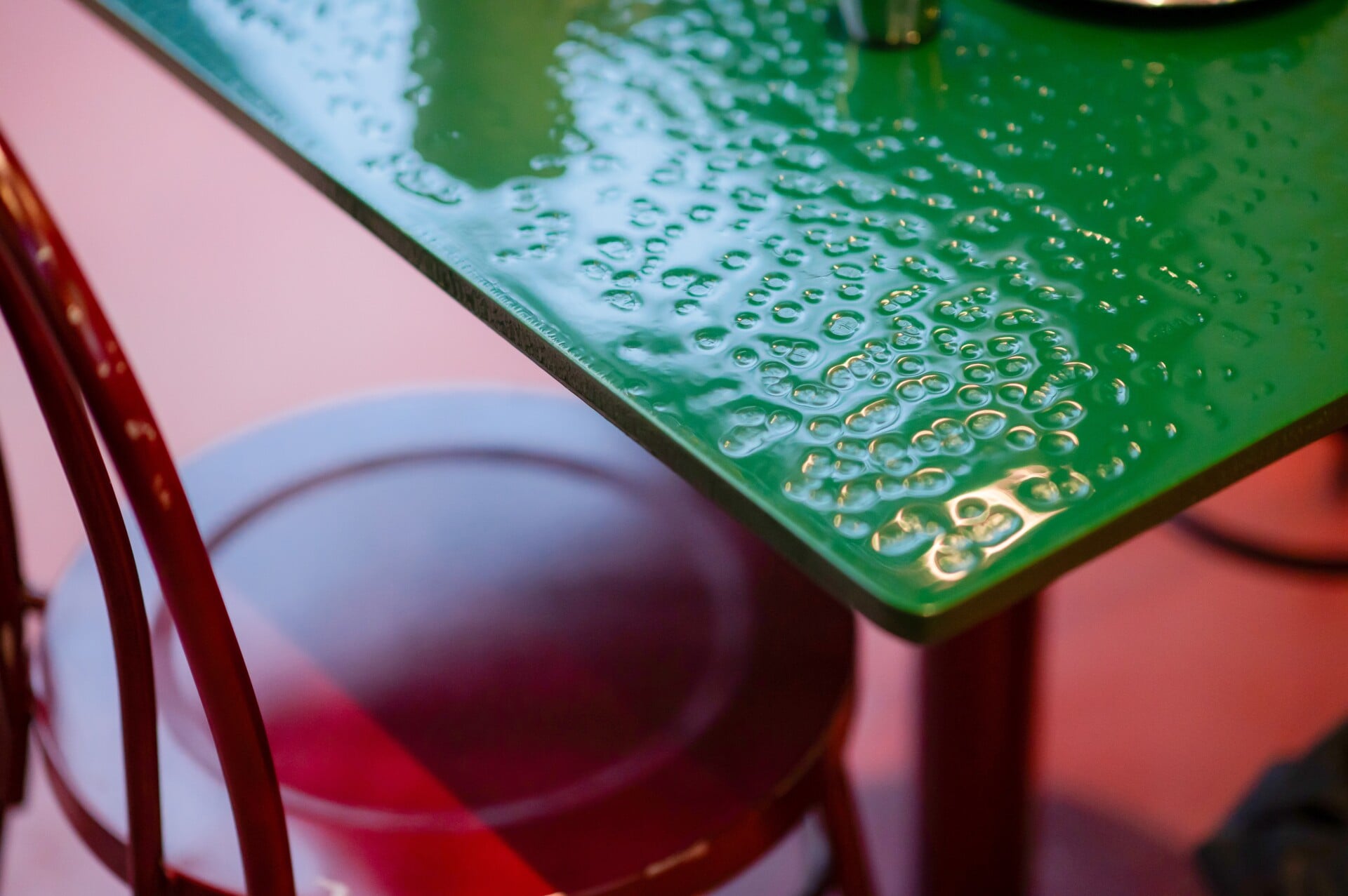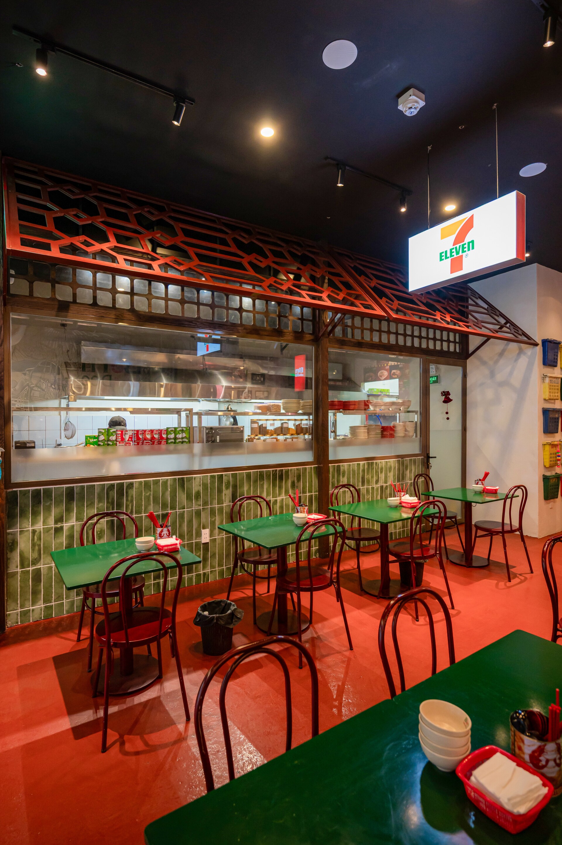 Bước vào bên trong, không gian nội thất được tổ chức như một con hẻm ẩm thực Thái thu nhỏ. Sàn đỏ cam nổi bật, bàn ghế sắt đơn giản sơn xanh – đỏ gợi cảm giác quen thuộc của các quán ăn bình dân Thái Lan. Tường được ốp gạch xanh bóng nửa dưới, phía trên là mảng bê tông thô kết hợp tranh vẽ tay, typography tiếng Thái và minh họa món ăn, xe đẩy street food – tất cả tạo nên một bức tranh sinh động về văn hóa ẩm thực đường phố.