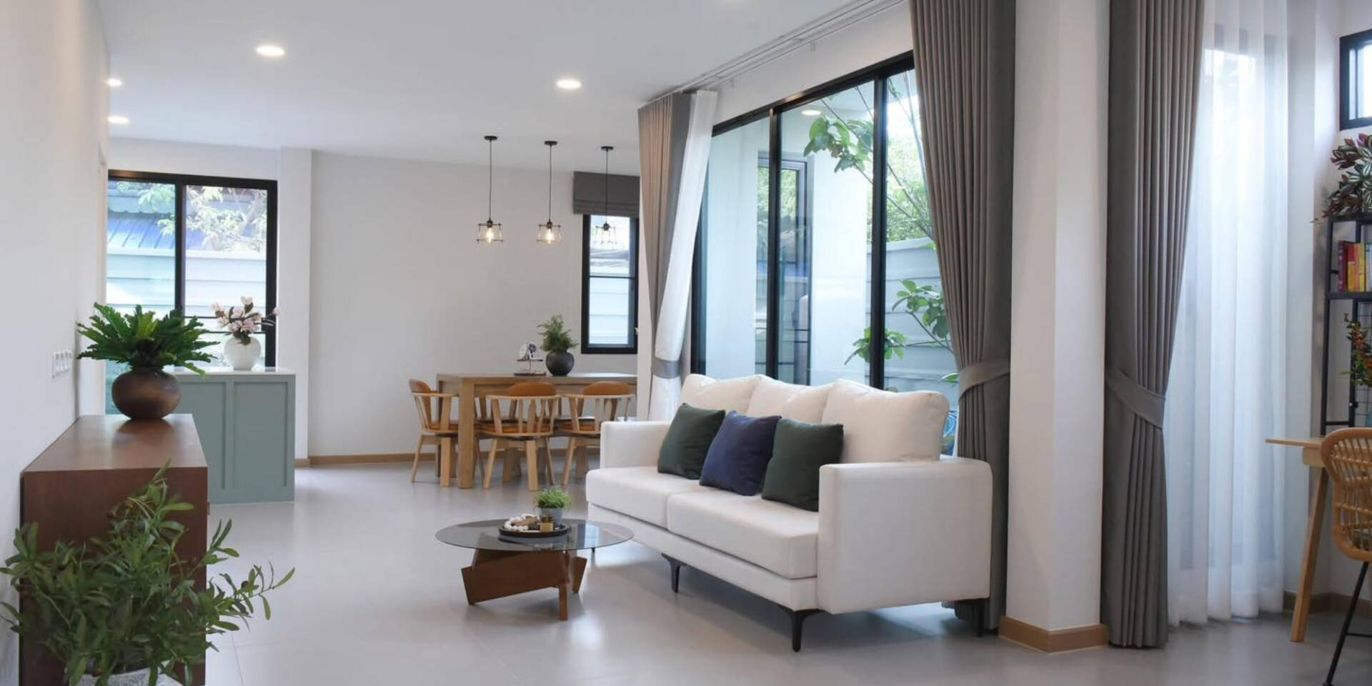 Toàn cảnh kết hợp sofa tiếp khách, bàn trà và bàn làm việc, ánh sáng tự nhiên chan hòa.