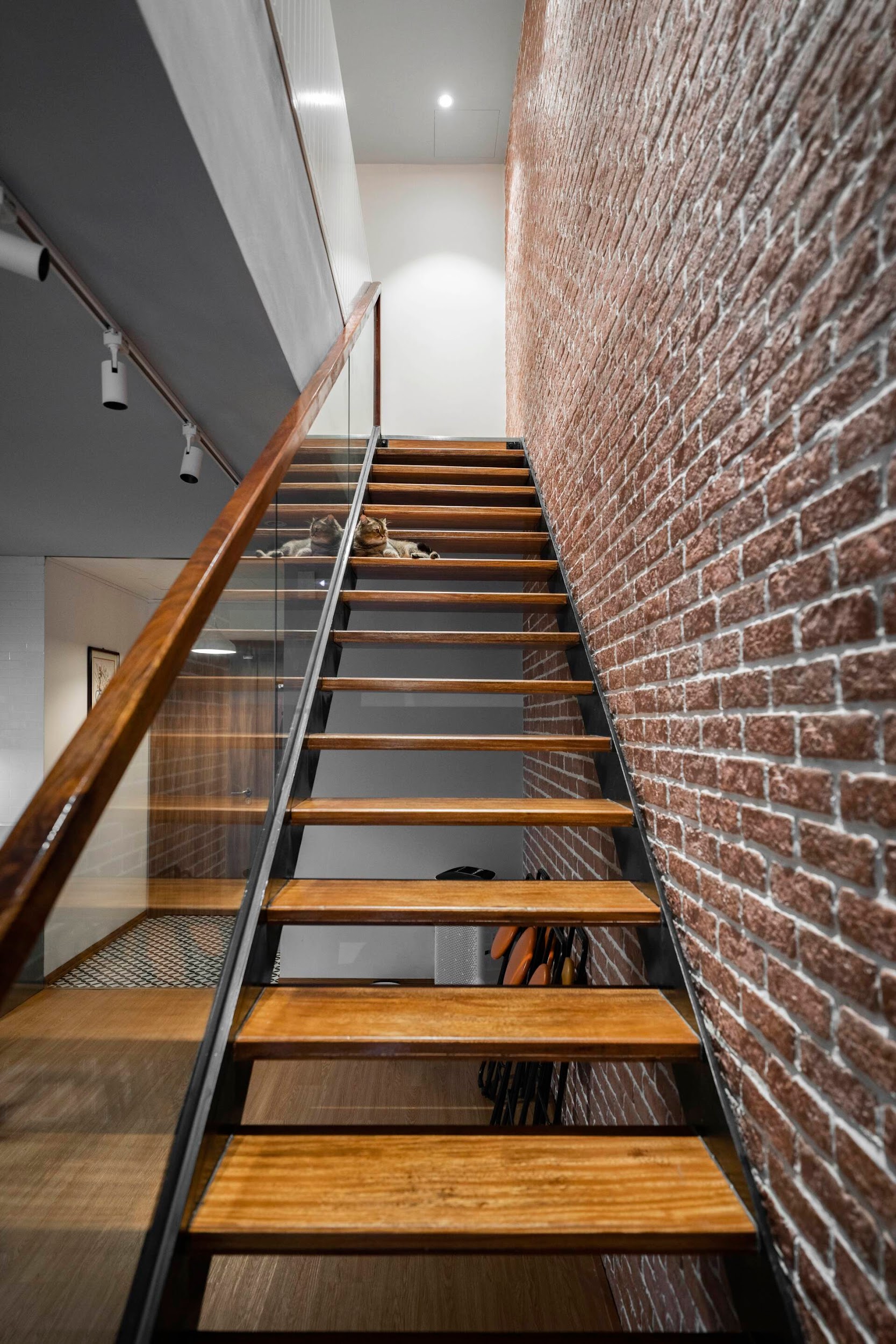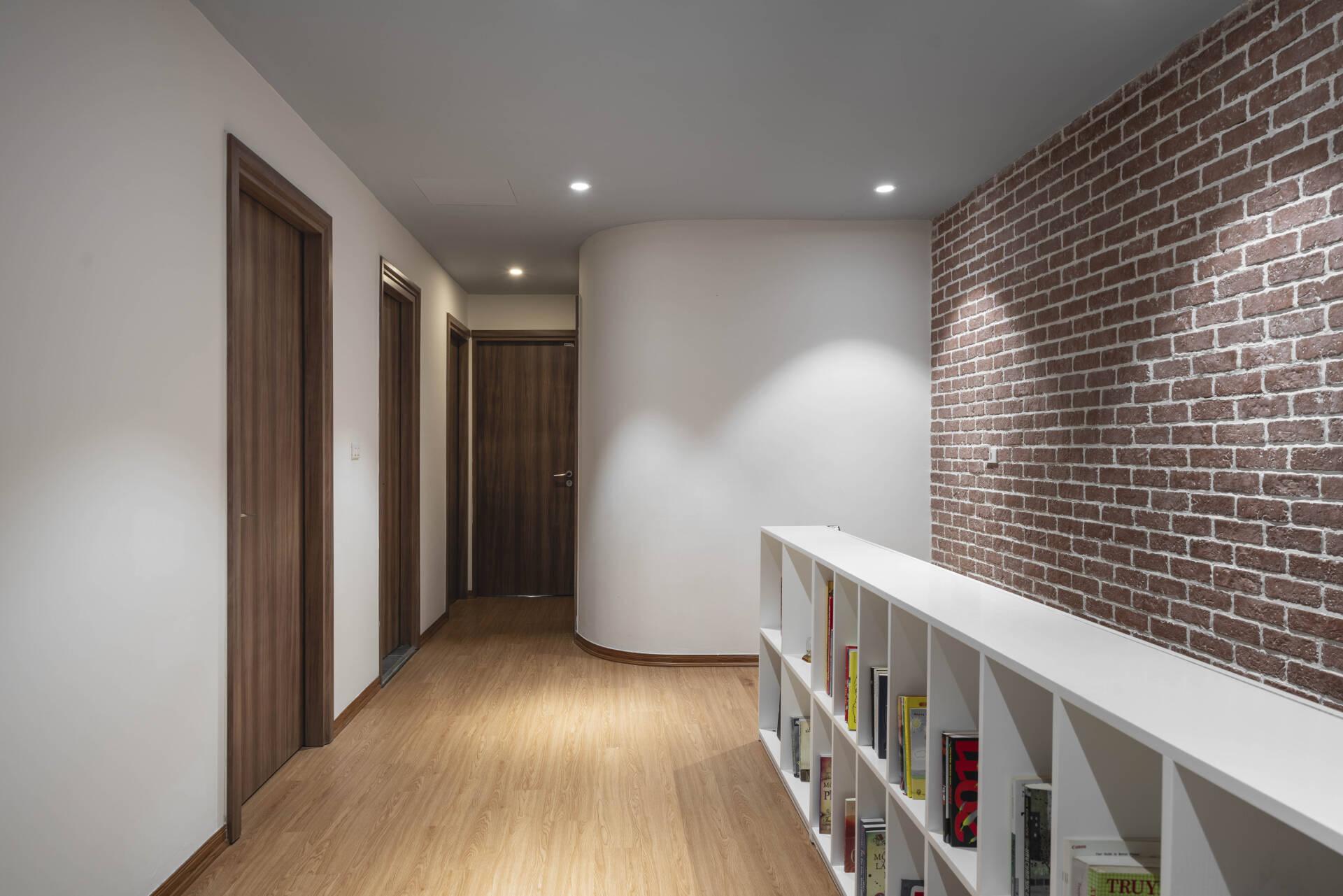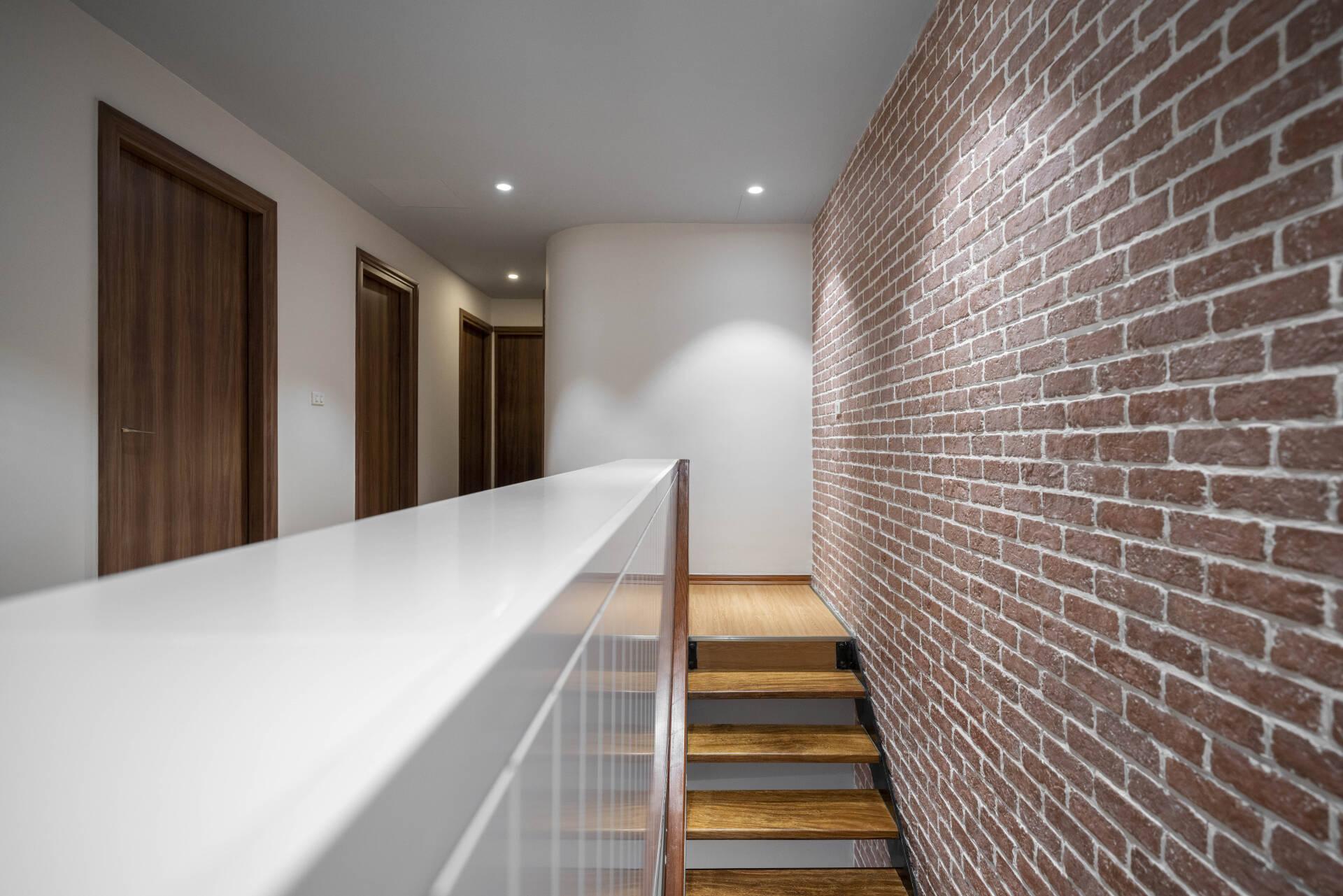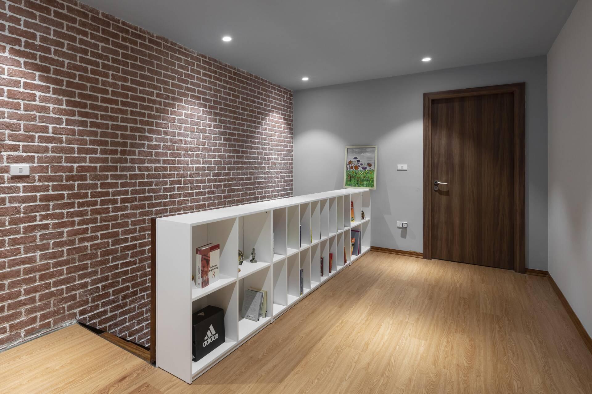 Cầu thang được đặt sát tường, với vách gạch đỏ mộc mạc làm điểm nhấn. Hành lang tầng 2 trở thành thư viện mini nhờ hệ kệ sách gỗ âm tường. Mỗi không gian đều được khai thác triệt để về công năng mà vẫn đảm bảo thẩm mỹ.