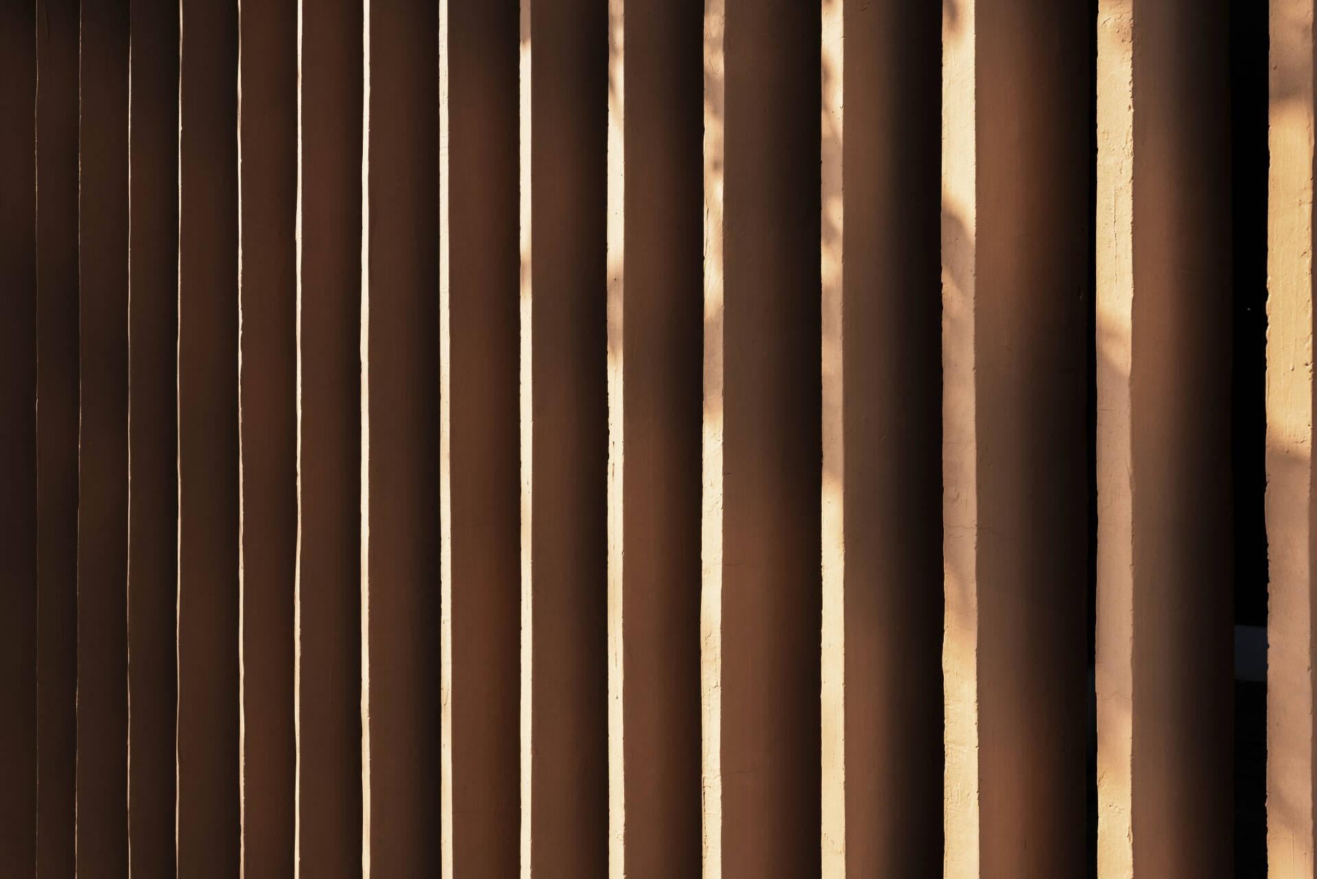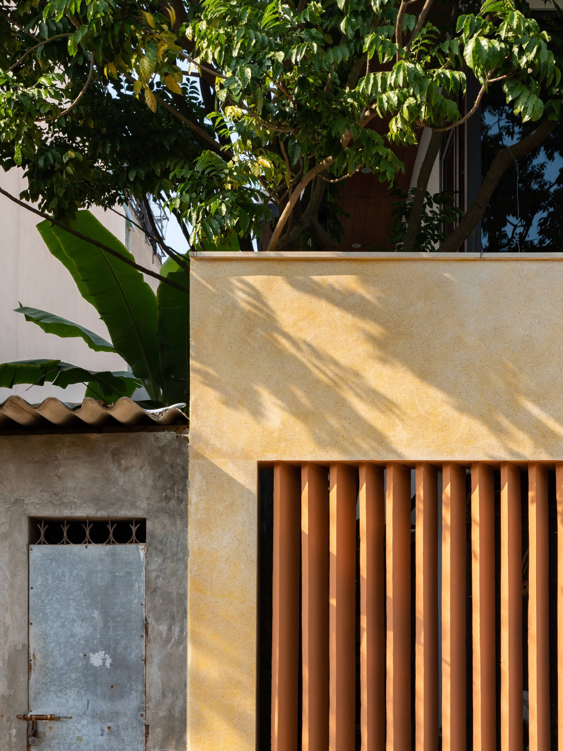 Mặt tiền công trình chọn tông nâu – vàng làm chủ đạo. Những khối bê tông xếp chéo tạo hình “rèm gió” đặc trưng – giúp che chắn riêng tư nhưng vẫn lưu thông không khí. Đây cũng là điểm nhấn thị giác ấn tượng, khiến công trình nổi bật trên phố nhưng không phô trương.
