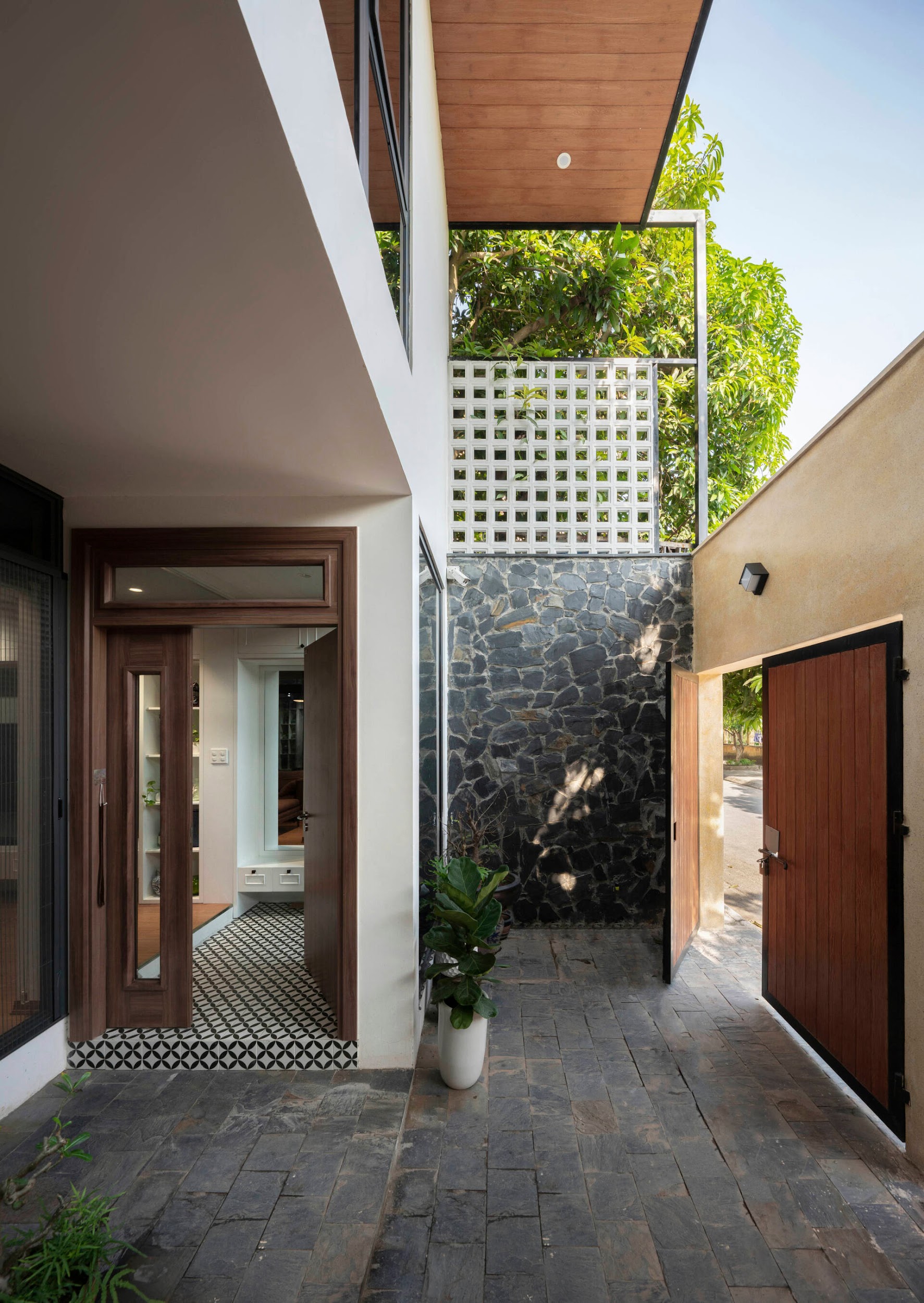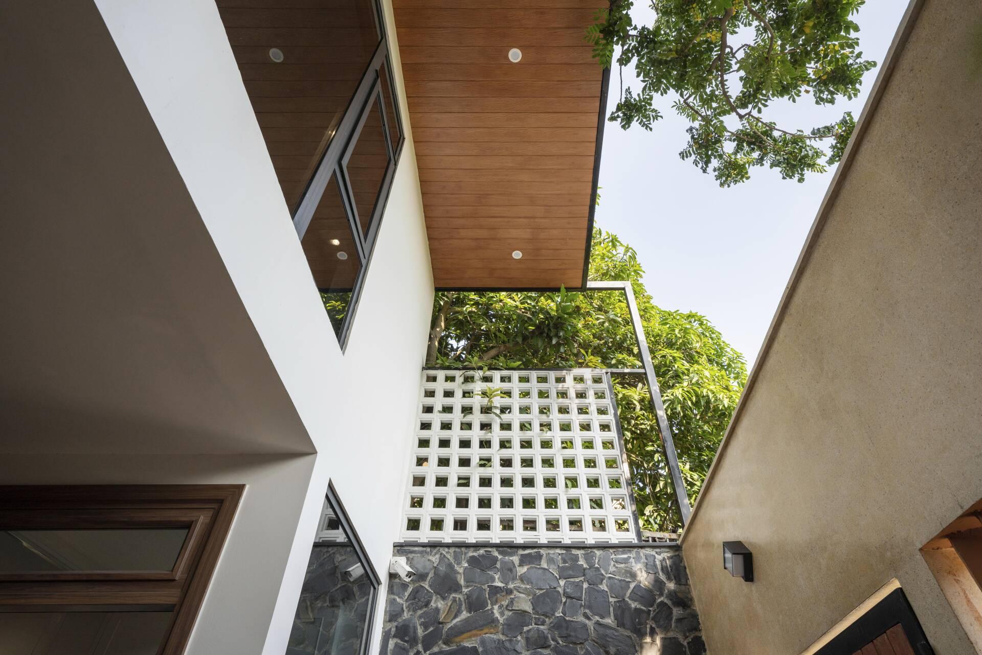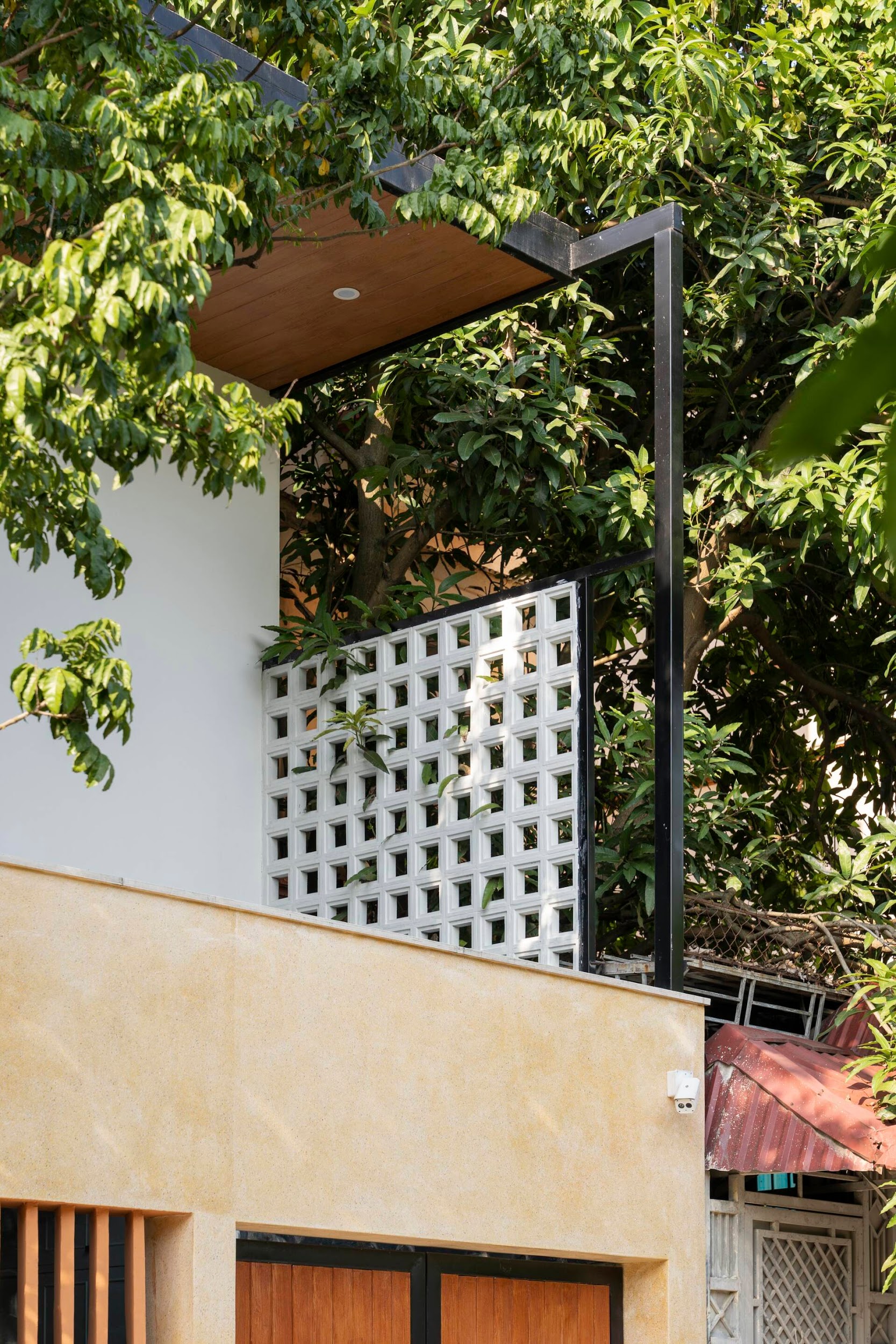 The Lot House là điển hình của xu hướng nhà phố hiện đại đề cao tính kết nối với thiên nhiên. Thay vì đóng kín hoặc che chắn bằng tường đặc, công trình sử dụng gạch thông gió, rèm bê tông và mặt đứng rỗng thoáng để tạo sự đối lưu khí liên tục. Giải pháp giữ cây xanh lâu năm không chỉ là yếu tố cảm xúc mà còn là quyết định đúng đắn về vi khí hậu và sinh thái đô thị.