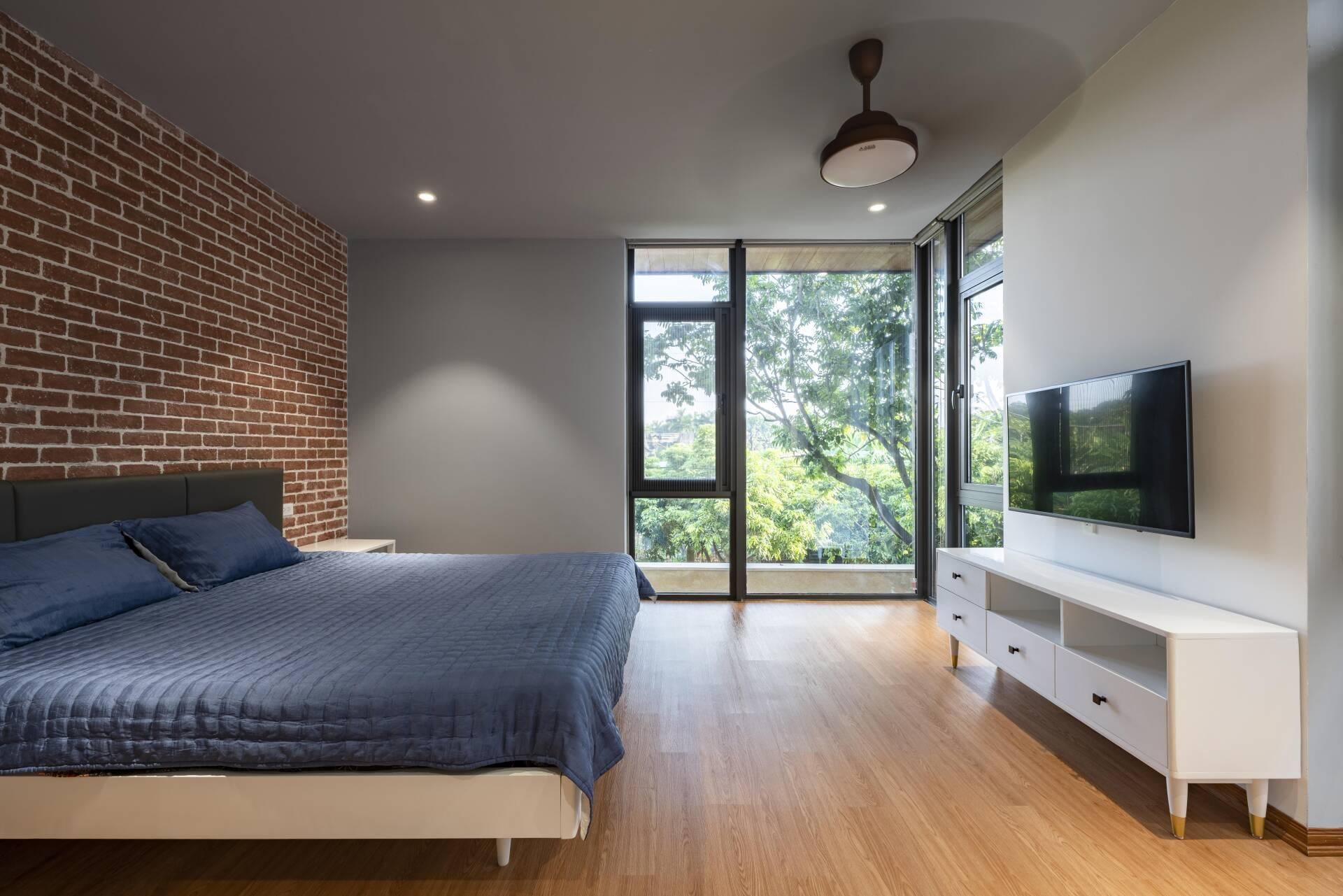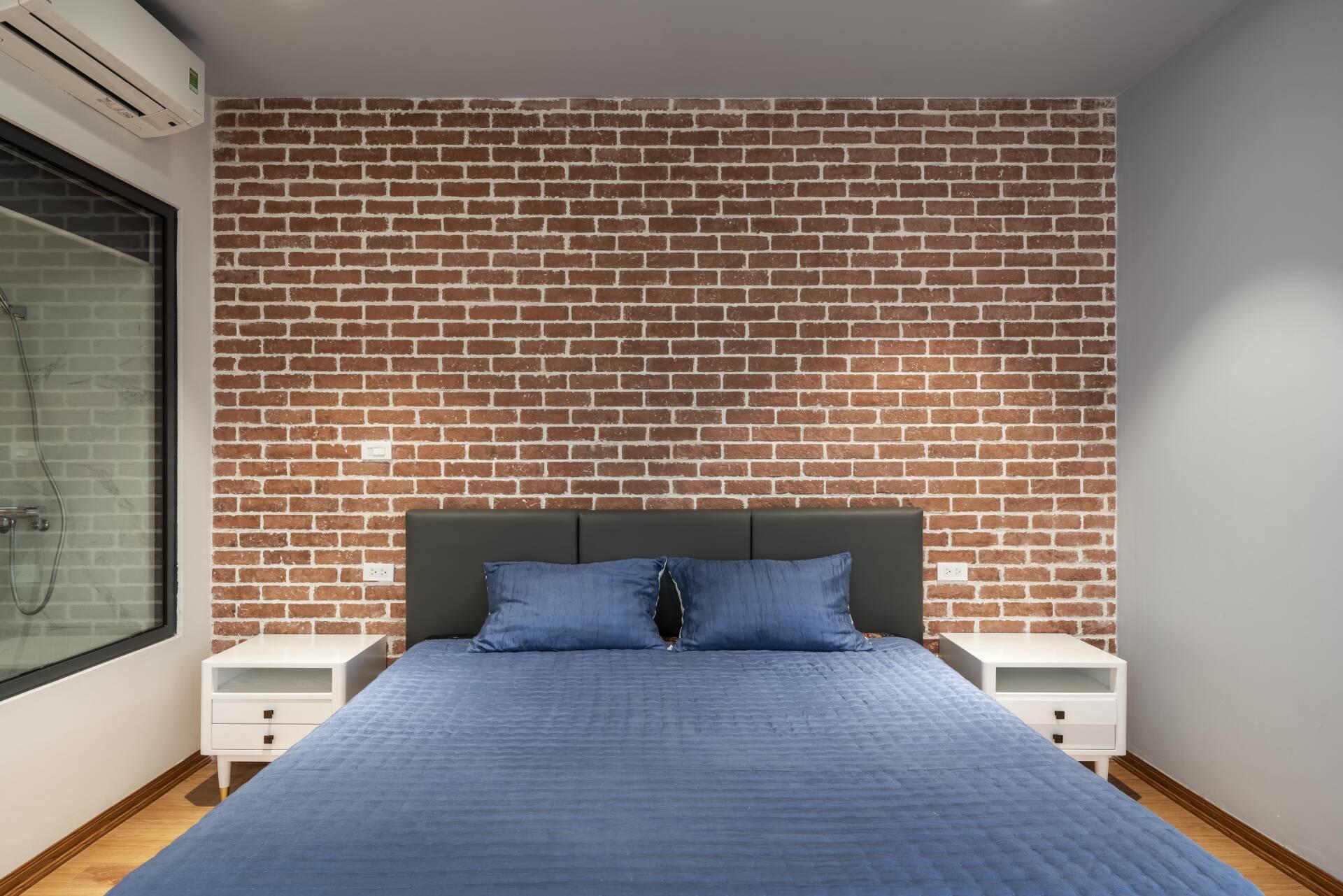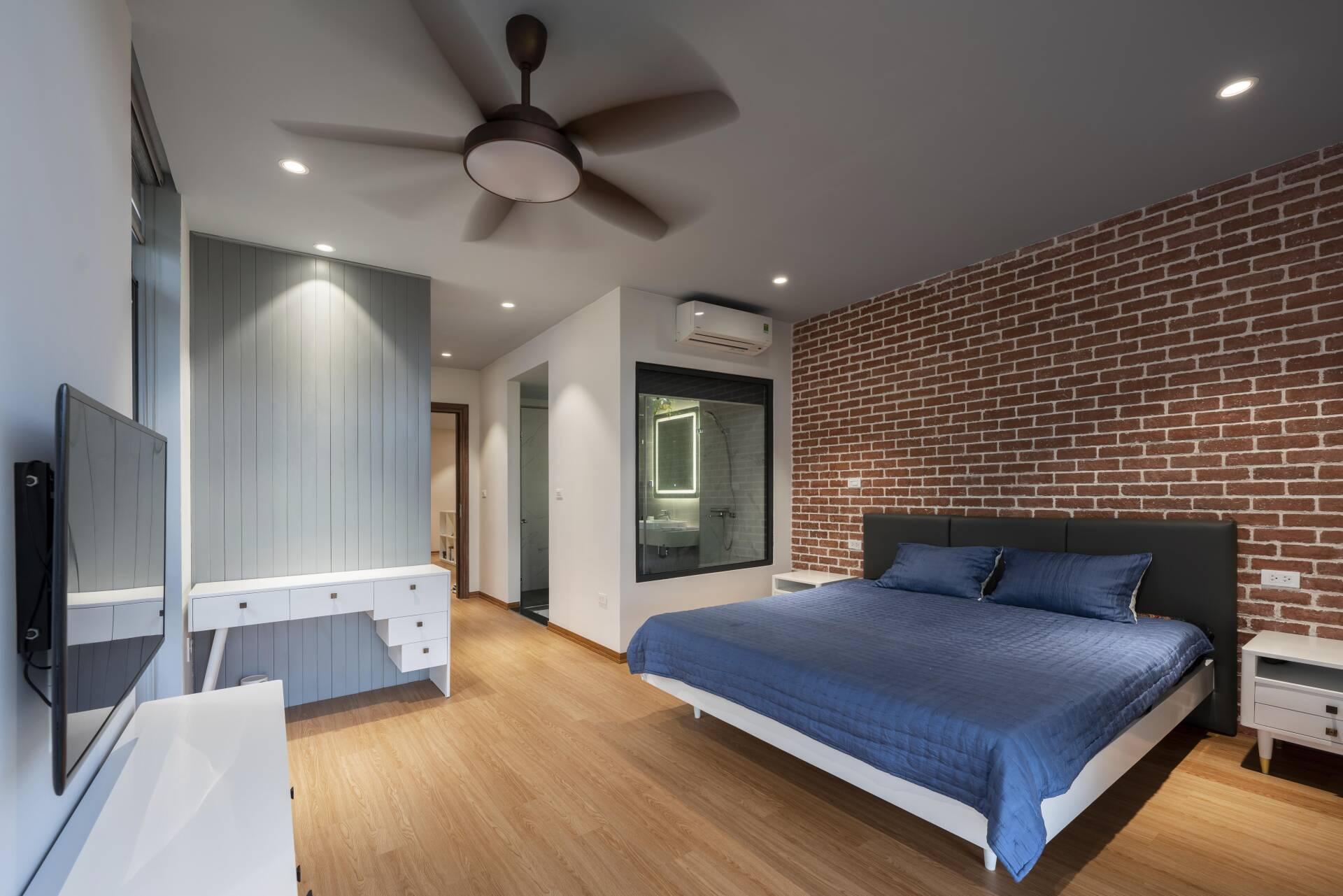 Phòng ngủ master sử dụng tường gạch mộc ở đầu giường, mang cảm giác ấm cúng và cá tính. Phòng còn tích hợp khu thay đồ và vệ sinh khép kín. Khu tắm – rửa – vệ sinh được tách riêng bằng vách kính cường lực, kết hợp kính trong suốt để tận dụng tối đa ánh sáng tự nhiên và mở rộng tầm nhìn.