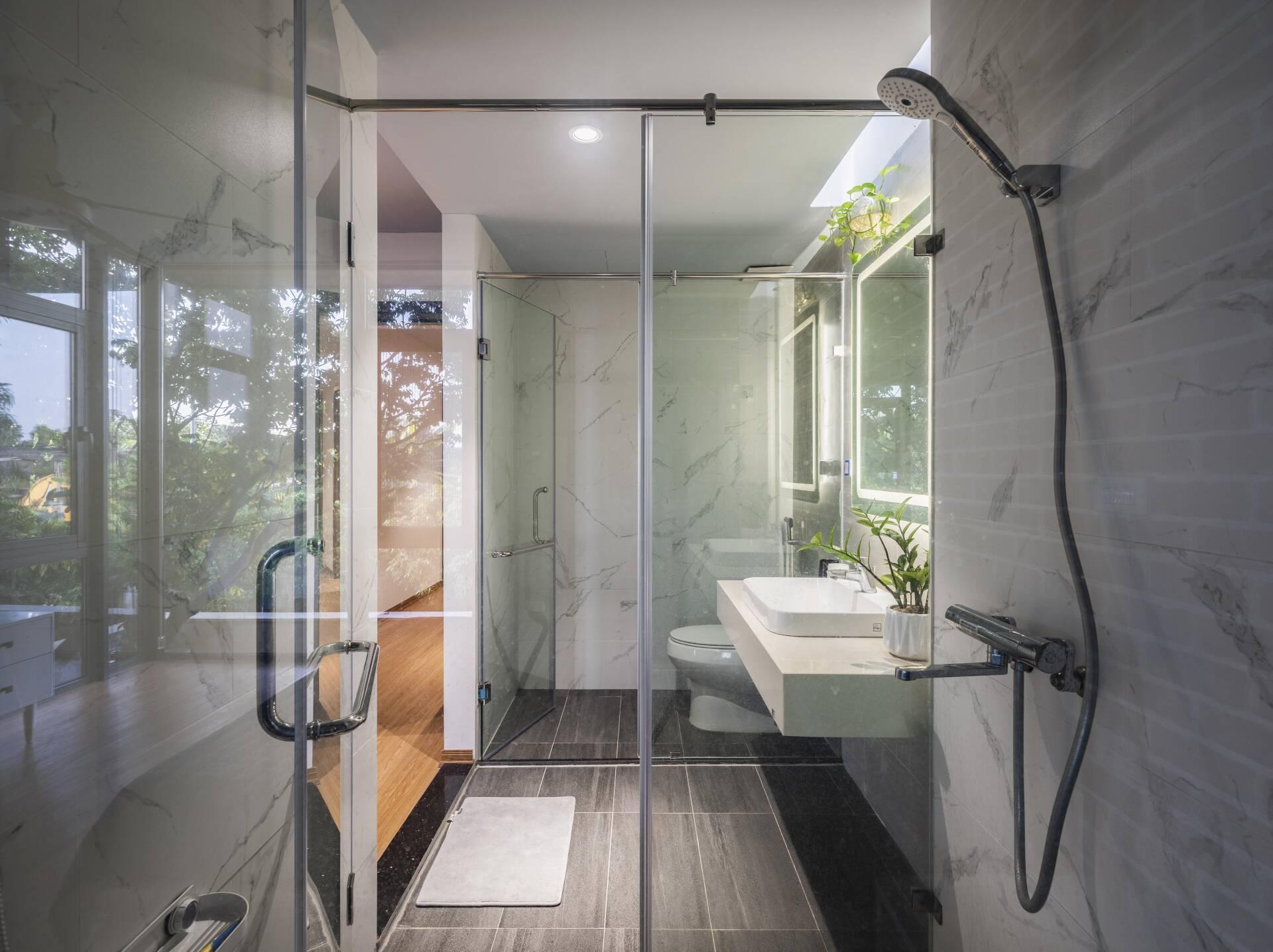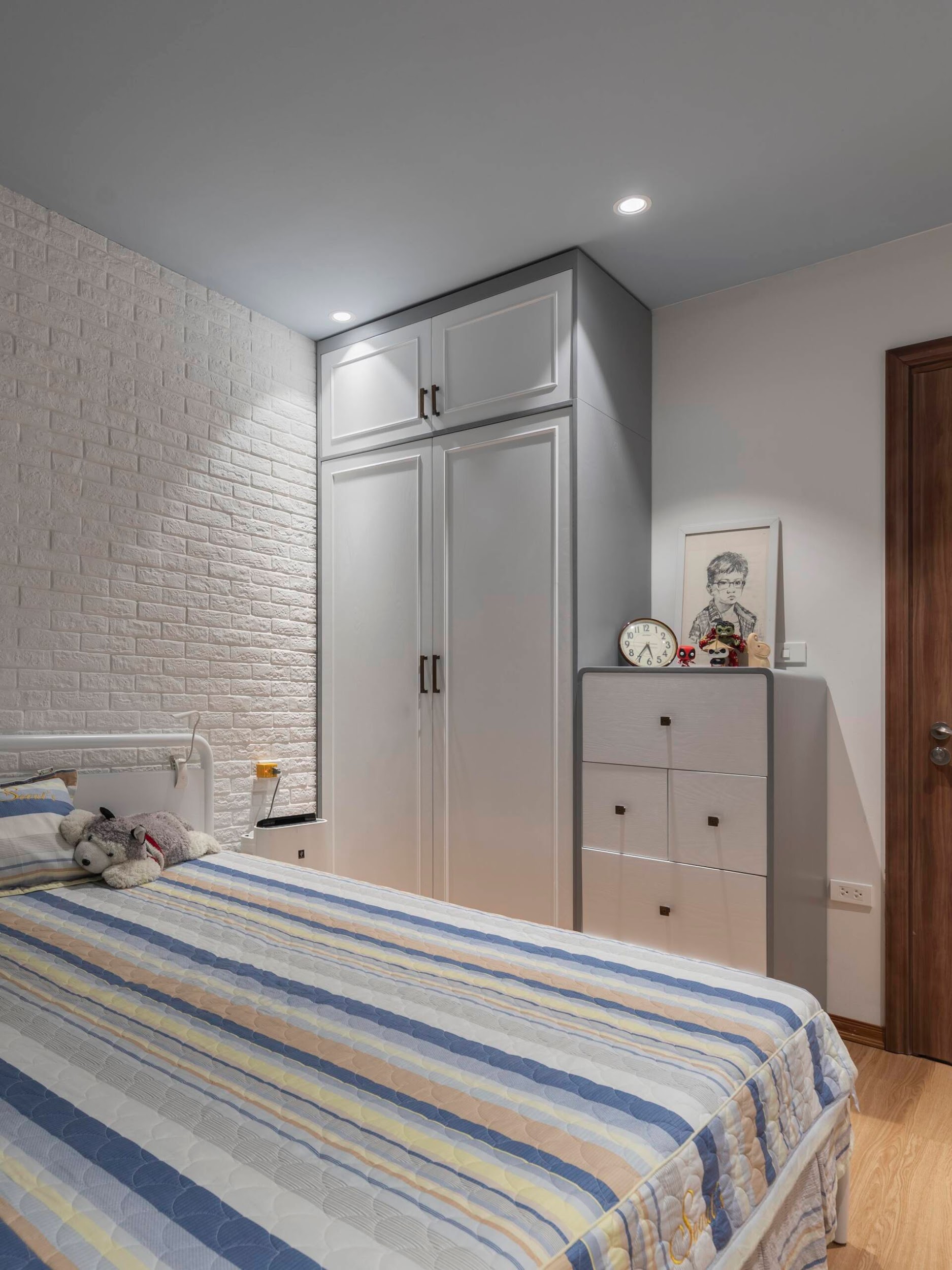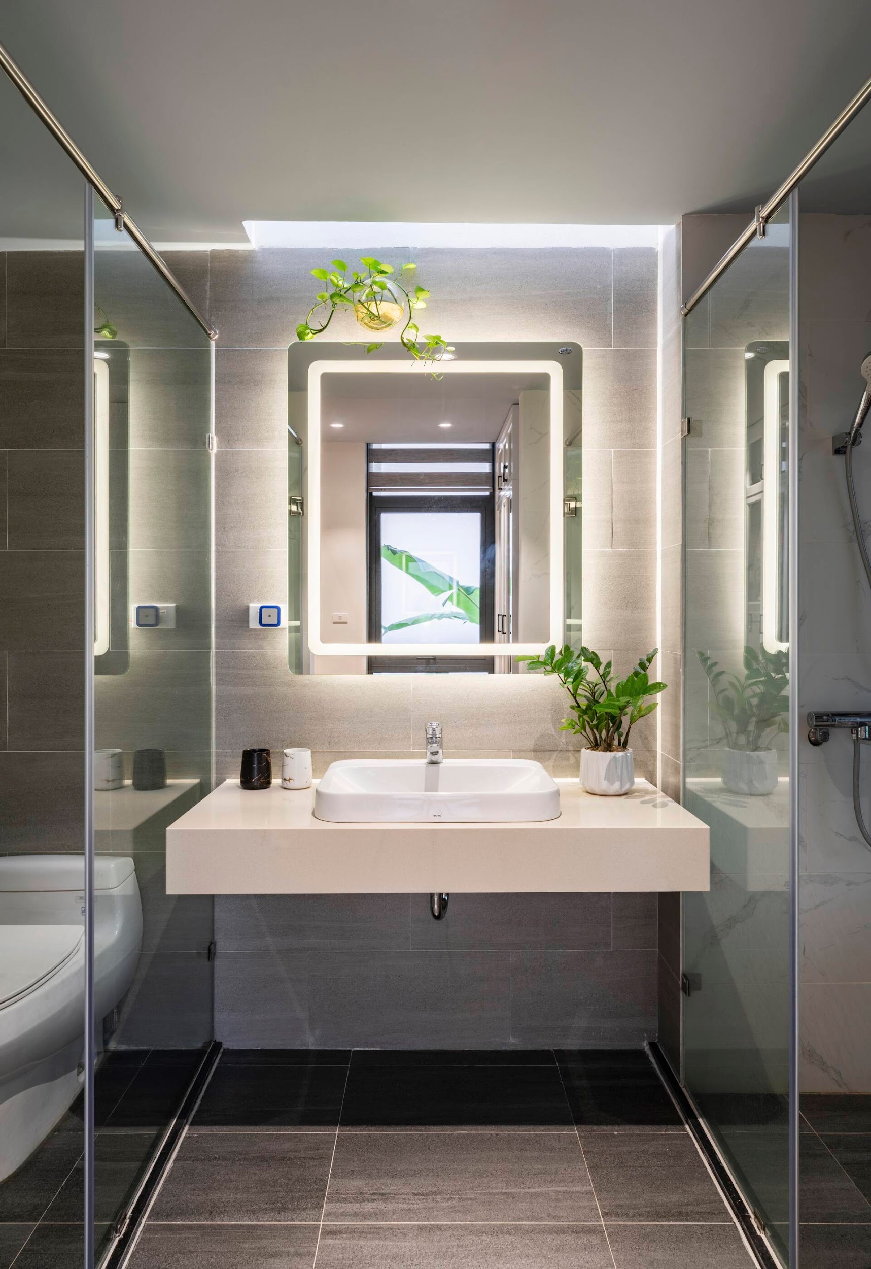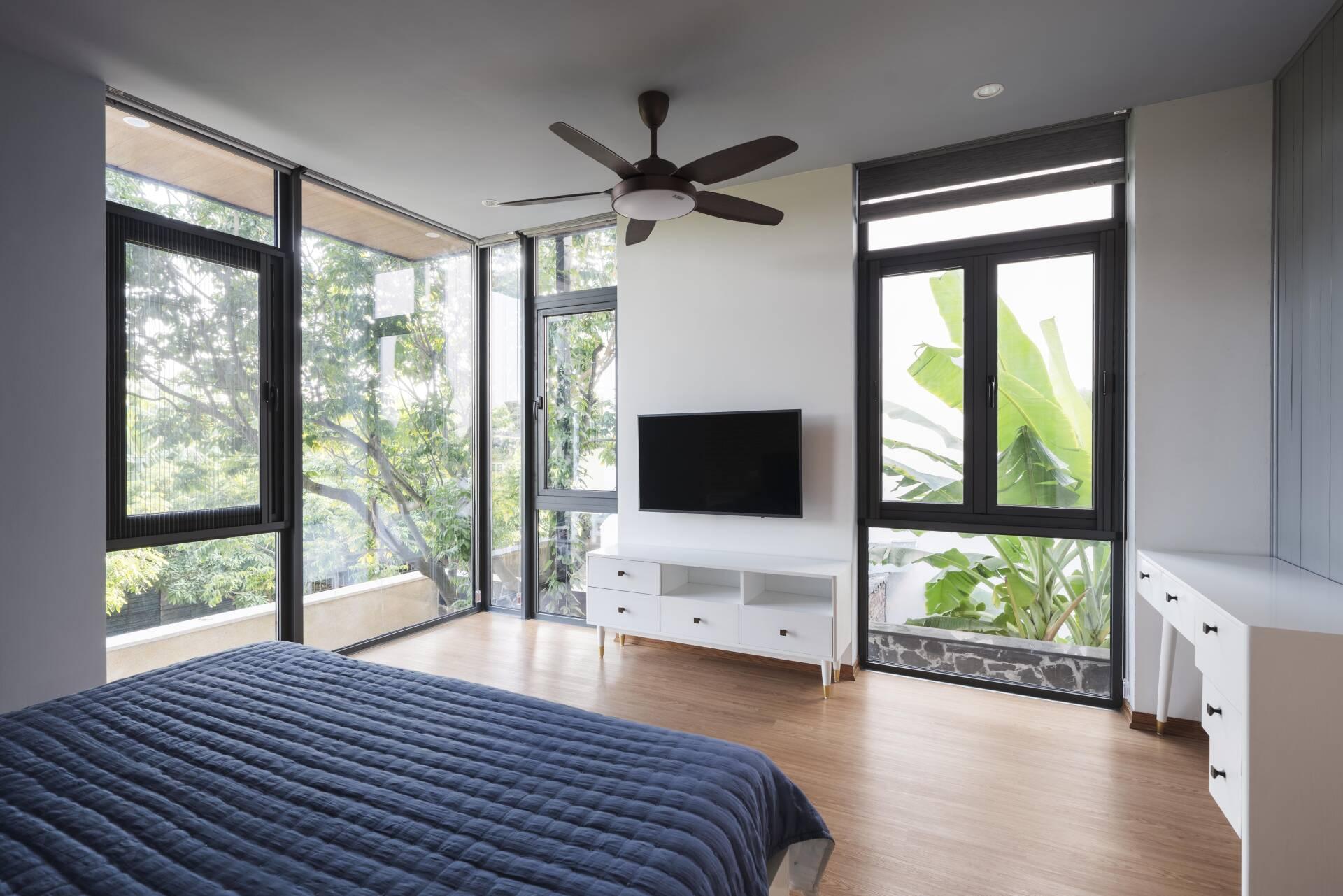 Phòng ngủ master sử dụng tường gạch mộc ở đầu giường, mang cảm giác ấm cúng và cá tính. Phòng còn tích hợp khu thay đồ và vệ sinh khép kín. Khu tắm – rửa – vệ sinh được tách riêng bằng vách kính cường lực, kết hợp kính trong suốt để tận dụng tối đa ánh sáng tự nhiên và mở rộng tầm nhìn.
