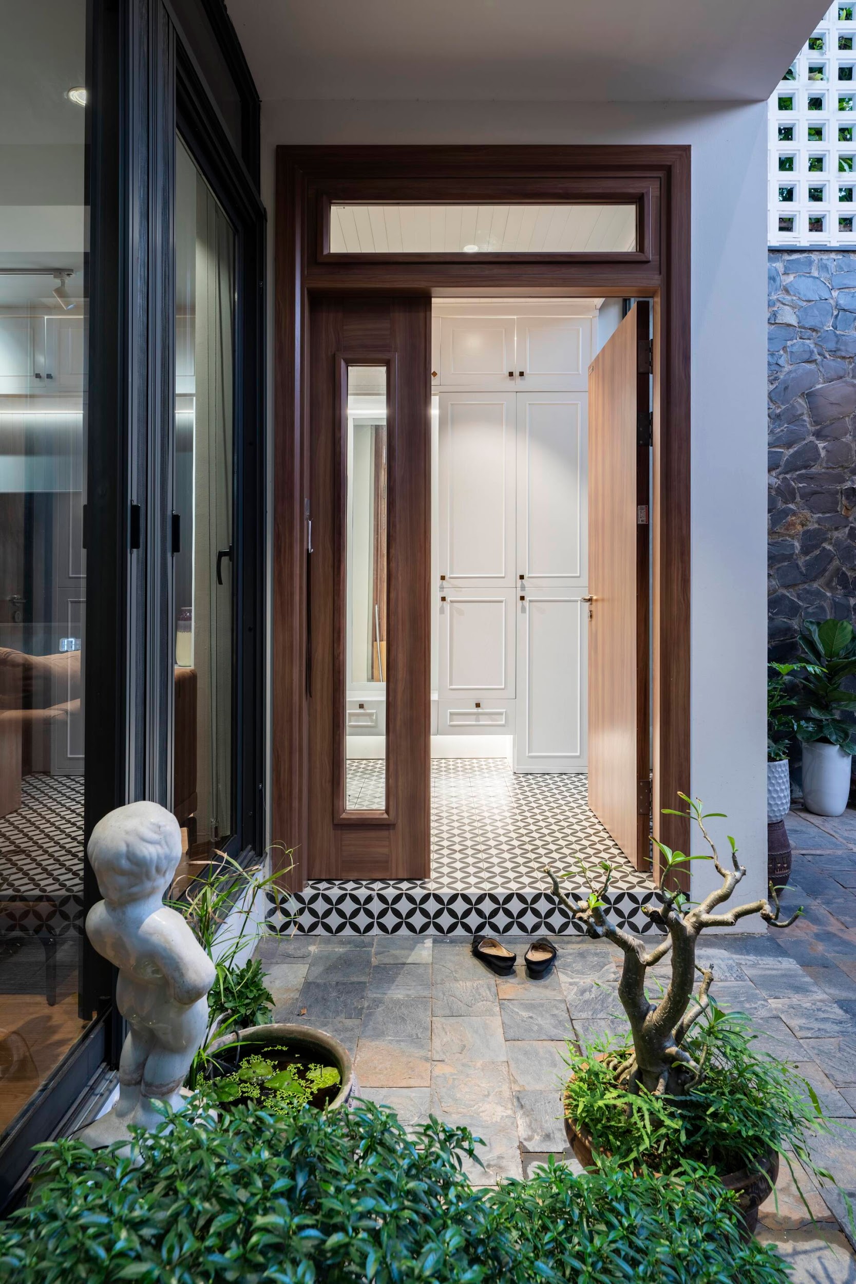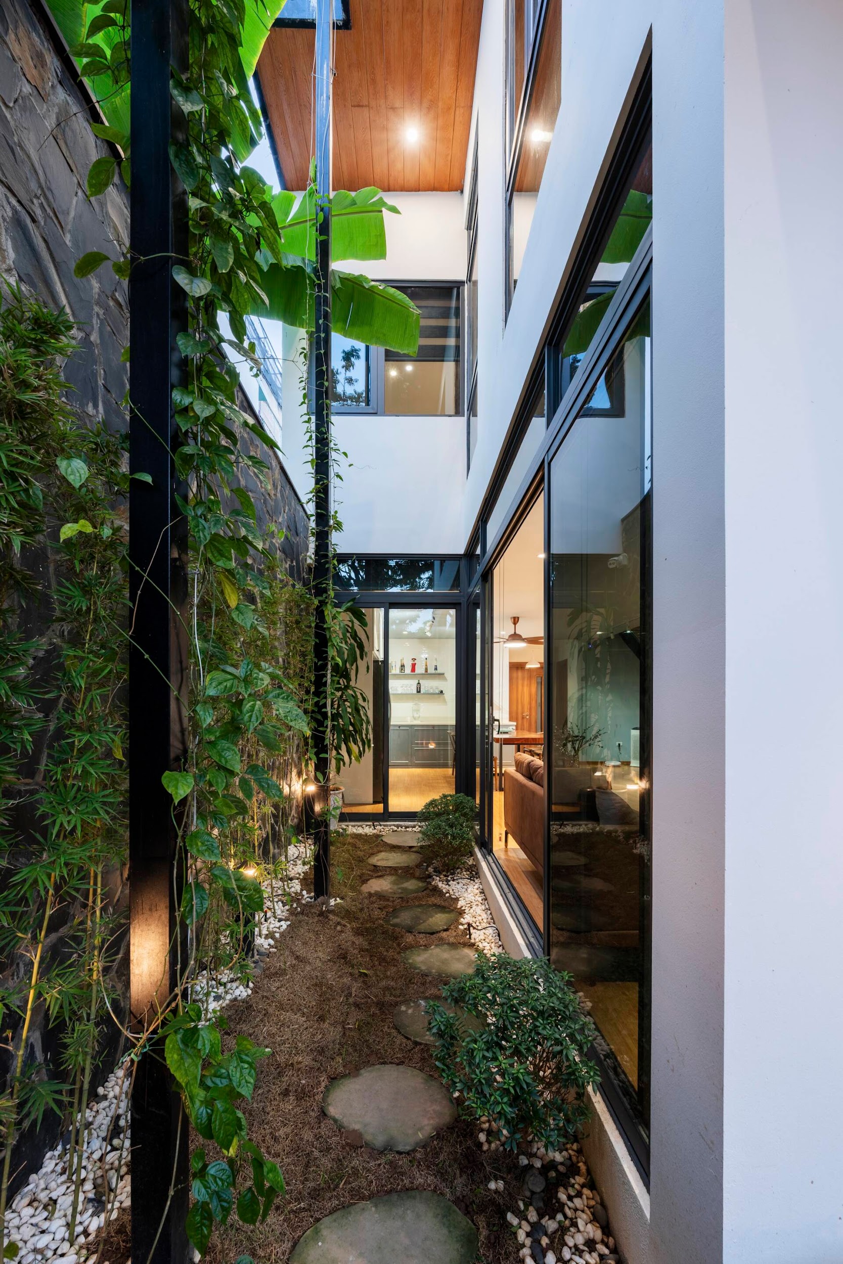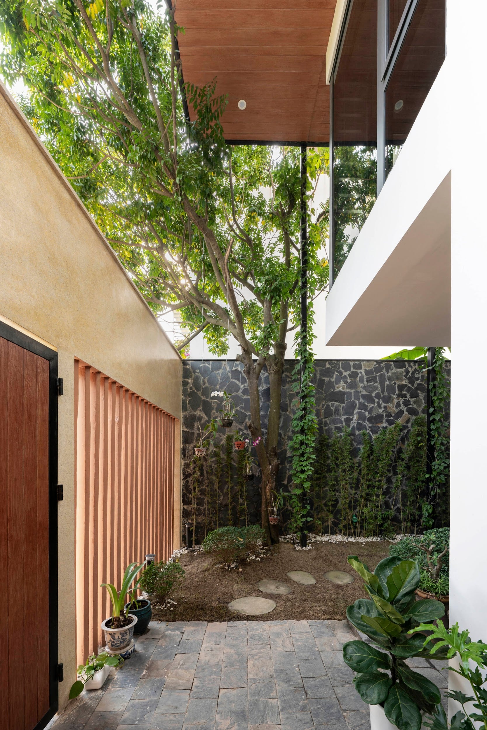 Khoảng sân trước và sau được ốp đá tự nhiên, trồng cây trúc và dây leo theo chiều dài nhà, vừa điều hòa vi khí hậu, vừa tạo cảm giác thư giãn, xanh mát. Cây xanh 10 năm tuổi được giữ nguyên vị trí và phát triển tiếp trong khoảng sân vườn trước – nơi đóng vai trò lớp đệm tránh khói bụi và nhiệt lượng từ ngoài phố.