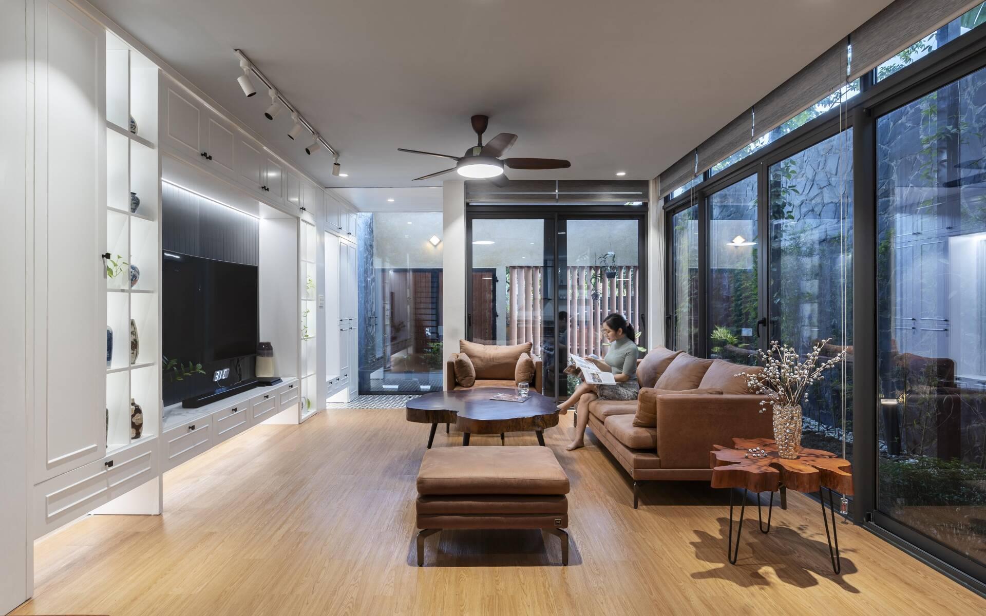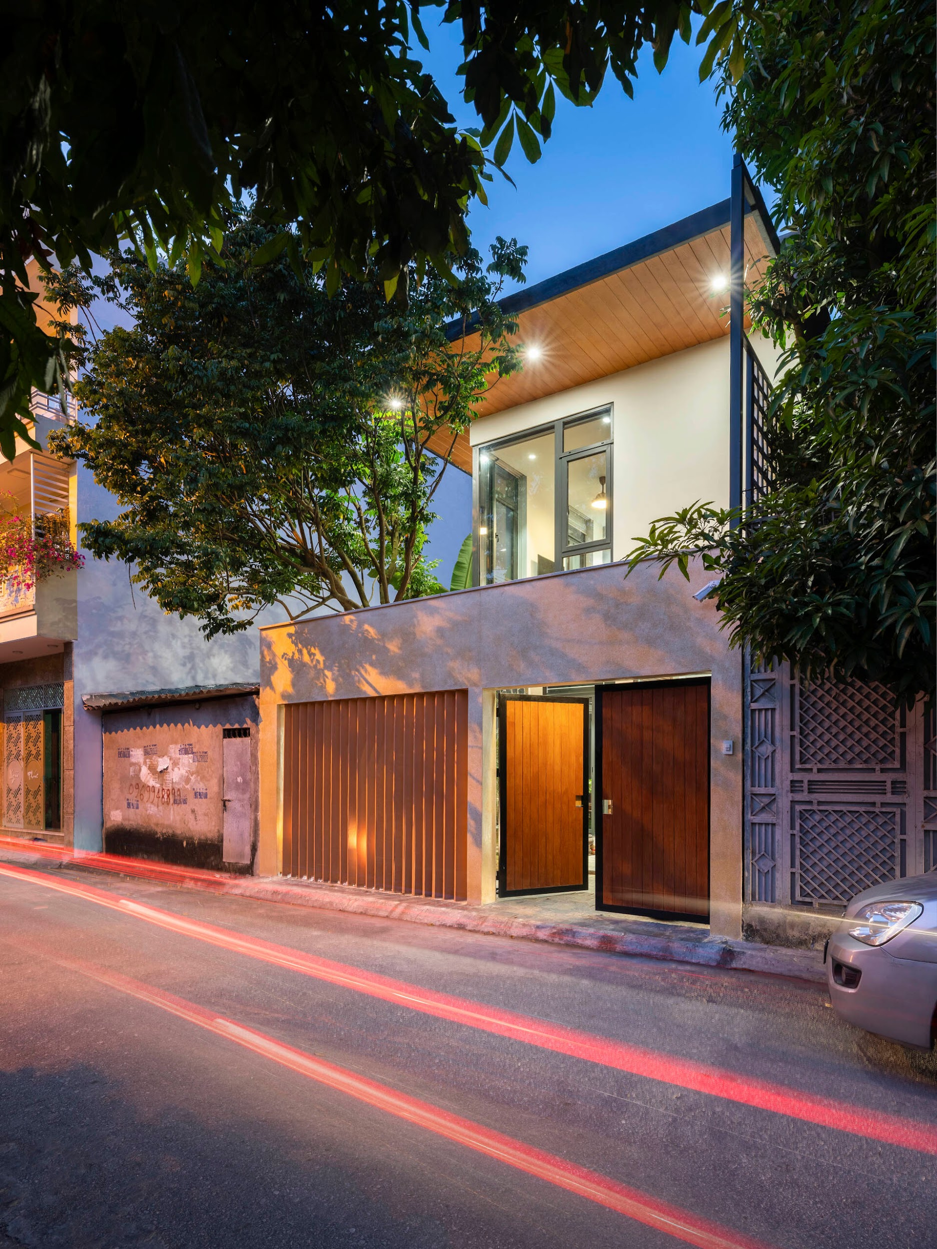 The Lot House được xây dựng trên khu đất 130m², là nhà phố 2 tầng theo phong cách hiện đại. Tuy chỉ có hai mặt thoáng trước – sau, công trình vẫn sở hữu khả năng lấy sáng và thông gió hiệu quả nhờ hai khoảng sân vườn được bố trí khéo léo. Đây không chỉ là giải pháp kỹ thuật mà còn là cách nhóm thiết kế giúp gia chủ giữ lại cây xanh đã gắn bó nhiều năm, trở thành biểu tượng cảm xúc cho ngôi nhà.