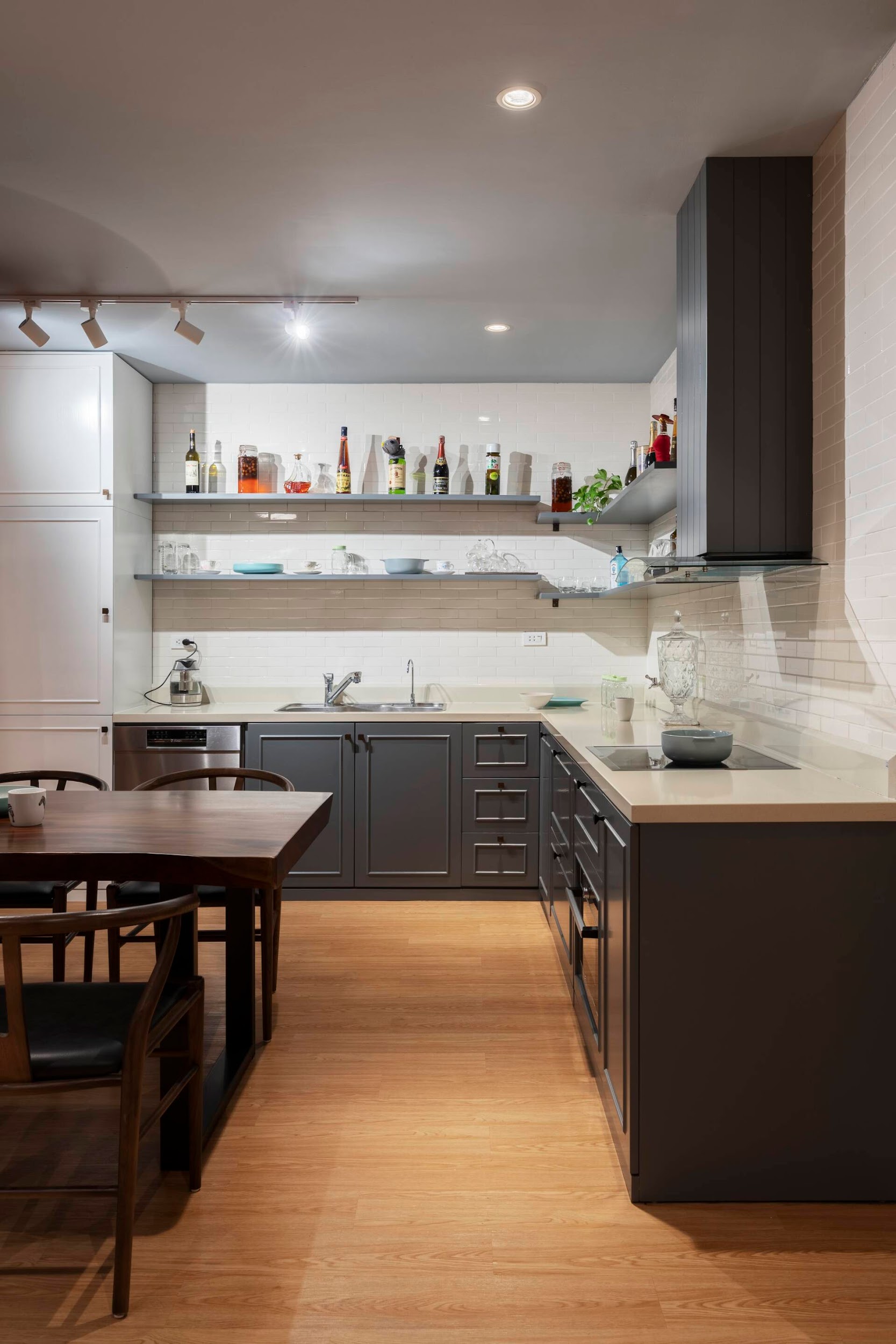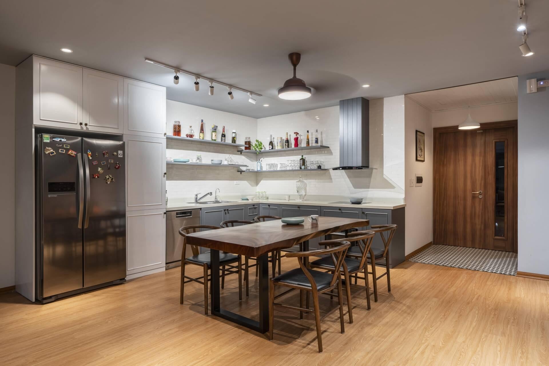 Khu vực bếp – ăn là nơi thể hiện cá tính gia chủ rõ nét. Hệ tủ bếp xanh ngọc phối trắng tươi sáng, phía trên không gắn tủ để giữ cảm giác thoáng đãng. Ánh sáng từ sân vườn xuyên qua cửa kính cỡ lớn, kết hợp cùng màu sắc nhã nhặn khiến không gian luôn nhẹ nhàng và truyền cảm hứng nấu nướng.