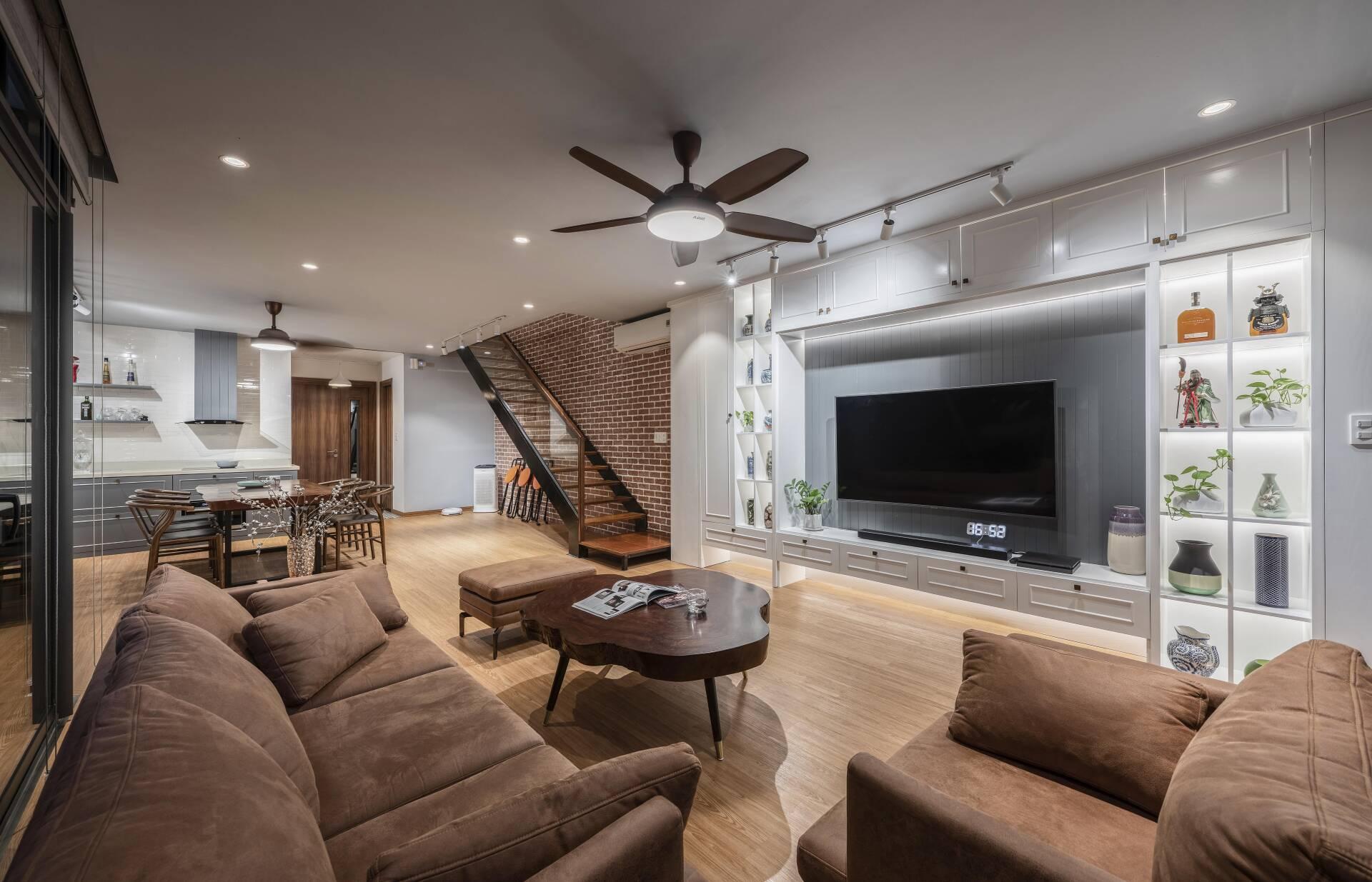 Bước qua tiền sảnh ốp gạch bông, không gian mở ra với phòng khách, bếp và ăn liên thông. Bộ sofa nhung màu nâu, bàn trà gỗ và thảm mềm màu be tạo cảm giác ấm cúng. Tủ kệ tivi được thiết kế tinh giản, là nơi trưng bày bộ sưu tập bình hoa của gia chủ – điểm chạm mềm mại giữa thô mộc và nữ tính.