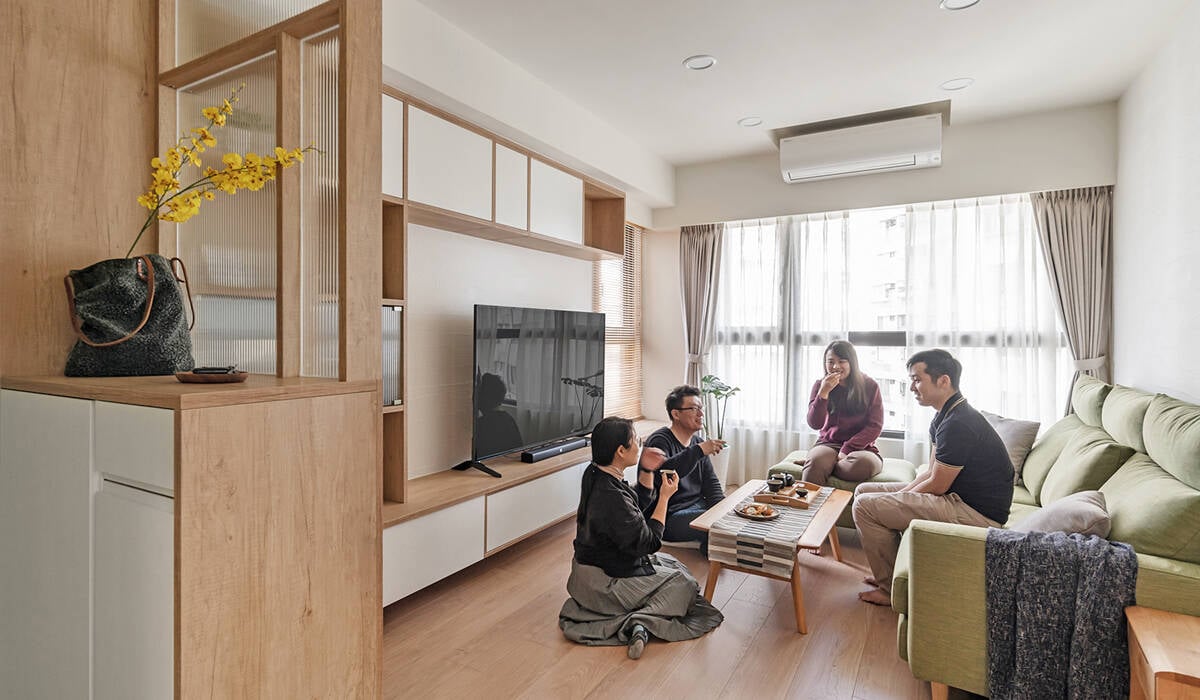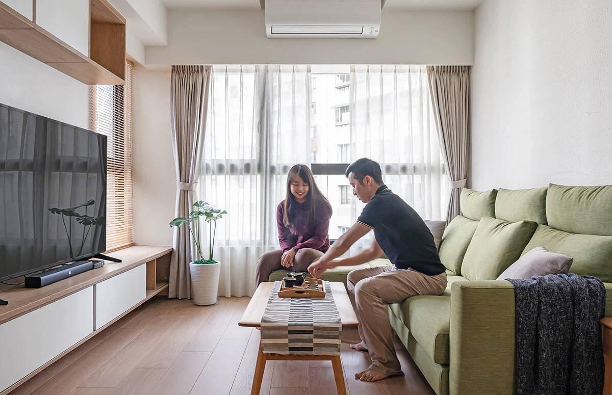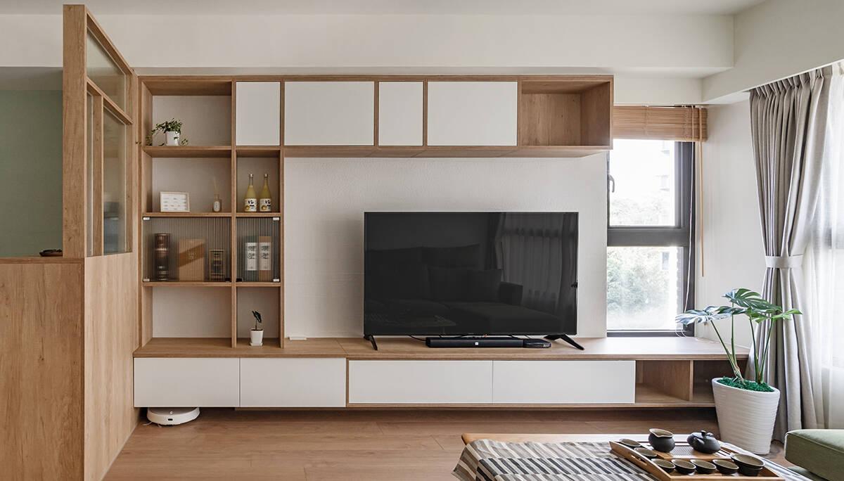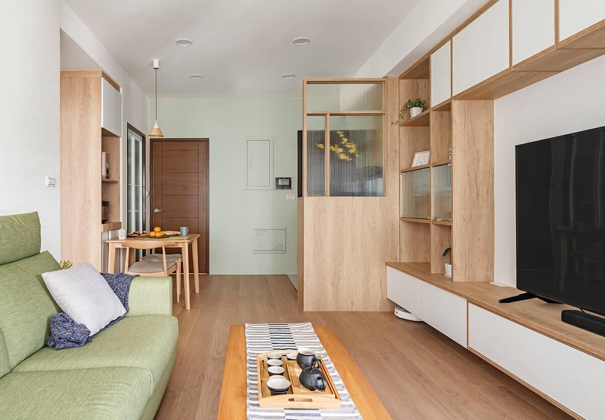 Tông màu chủ đạo là trắng, nâu gỗ và xanh matcha – một bảng màu đậm tinh thần Nhật Bản, dịu mắt và dễ chịu. Phòng khách nổi bật với sofa matcha kết hợp bàn trà gỗ mộc. Hệ tủ tivi liền tường vừa tiết kiệm diện tích, vừa đảm bảo tính thẩm mỹ. Rèm cửa hai lớp giúp điều chỉnh ánh sáng linh hoạt, tạo bầu không khí ấm cúng vào buổi tối và thư thái vào ban ngày.