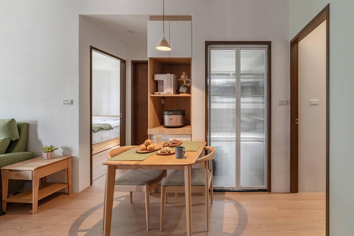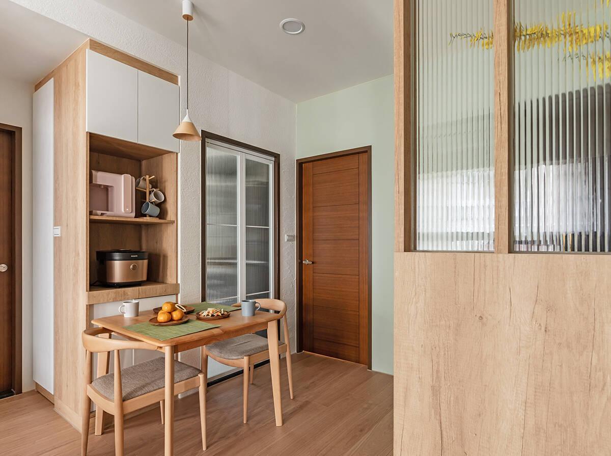 Không gian phòng ăn và bếp được bố trí đơn giản nhưng khoa học, với các vật dụng gọn gàng, có thể di chuyển dễ dàng tùy theo nhu cầu. Tủ đựng đồ bếp đặt ngay cạnh bàn ăn, đảm bảo mọi thao tác đều thuận tiện dù diện tích hạn chế.
