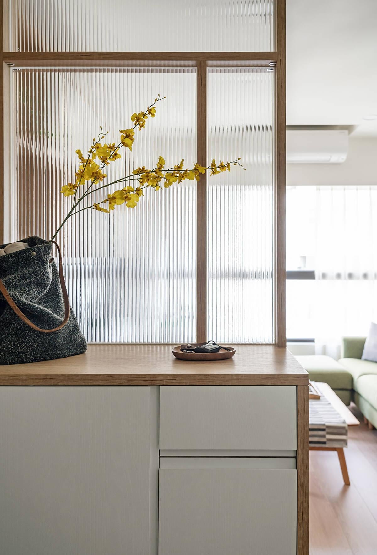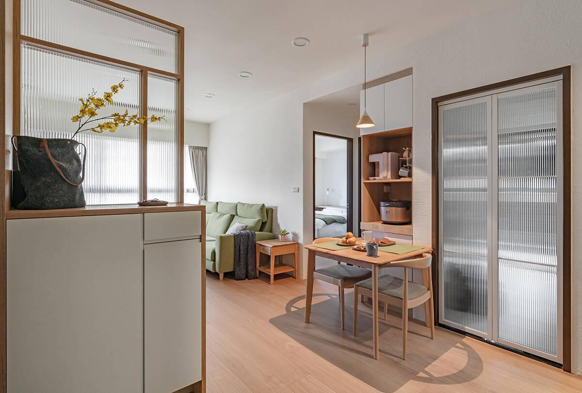 Ngay từ lối vào, căn hộ đã cho cảm giác ngăn nắp nhờ thiết kế tủ giày tích hợp vách ngăn. Từ đây, không gian mở dẫn thẳng vào phòng khách – ăn – bếp liền mạch, tạo sự kết nối và giúp ánh sáng tự nhiên lan tỏa khắp nhà.
