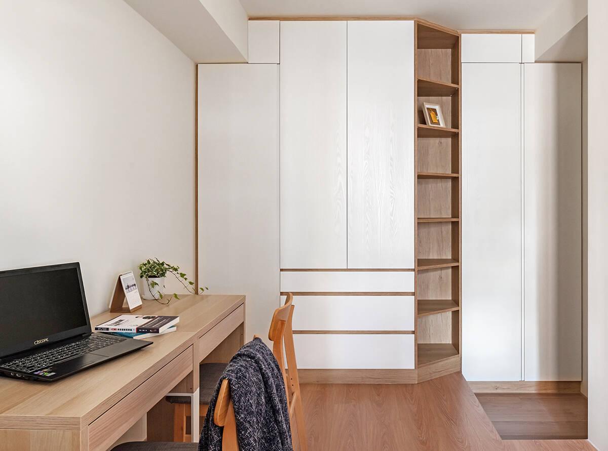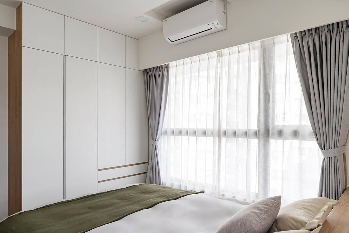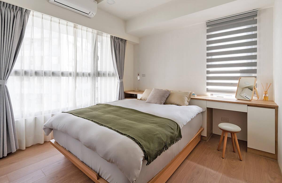 Căn hộ có hai phòng ngủ, trong đó phòng ngủ chính mang tông nâu gỗ đồng điệu với toàn bộ không gian. Phòng còn lại hiện là phòng làm việc, nhưng được thiết kế linh hoạt để chuyển đổi thành phòng ngủ thứ hai khi cần – dự phòng cho tương lai có thêm thành viên mới.