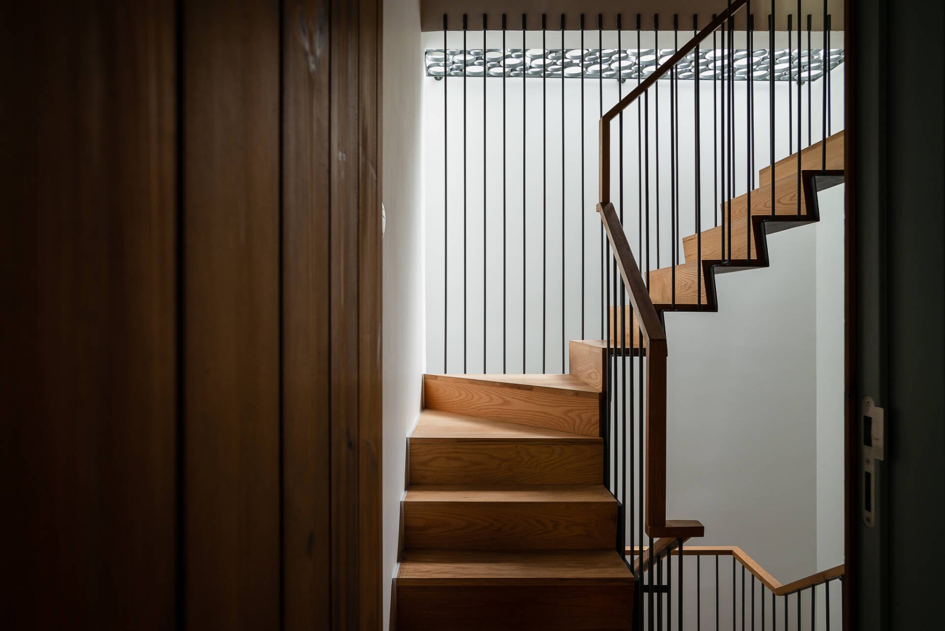Cầu thang như một con đường theo phương đứng, nép về phía sau nhà nhằm ưu tiên diện tích cho không gian sinh hoạt