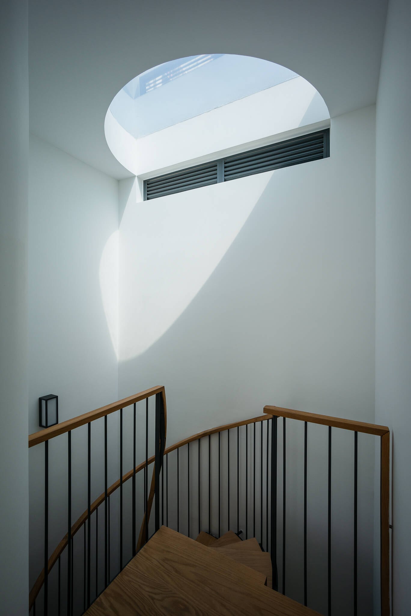 Điểm cuối cùng của cầu thang chạm tới ánh sáng tự nhiên bởi ô cửa sổ mái kính tựa như giếng trời hình bán nguyệt - giải pháp quen thuộc nhưng hiệu quả cho nhà trong hẻm