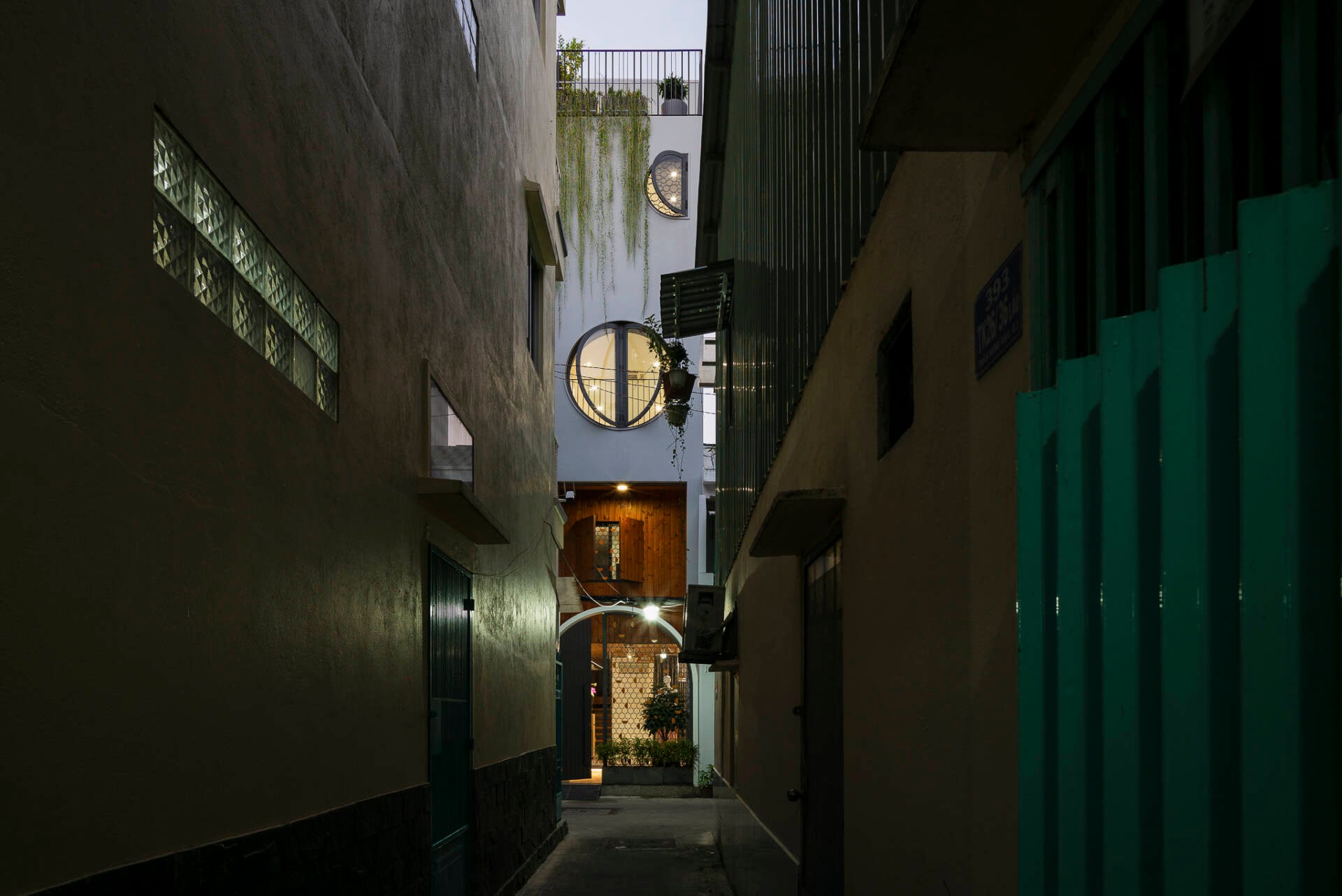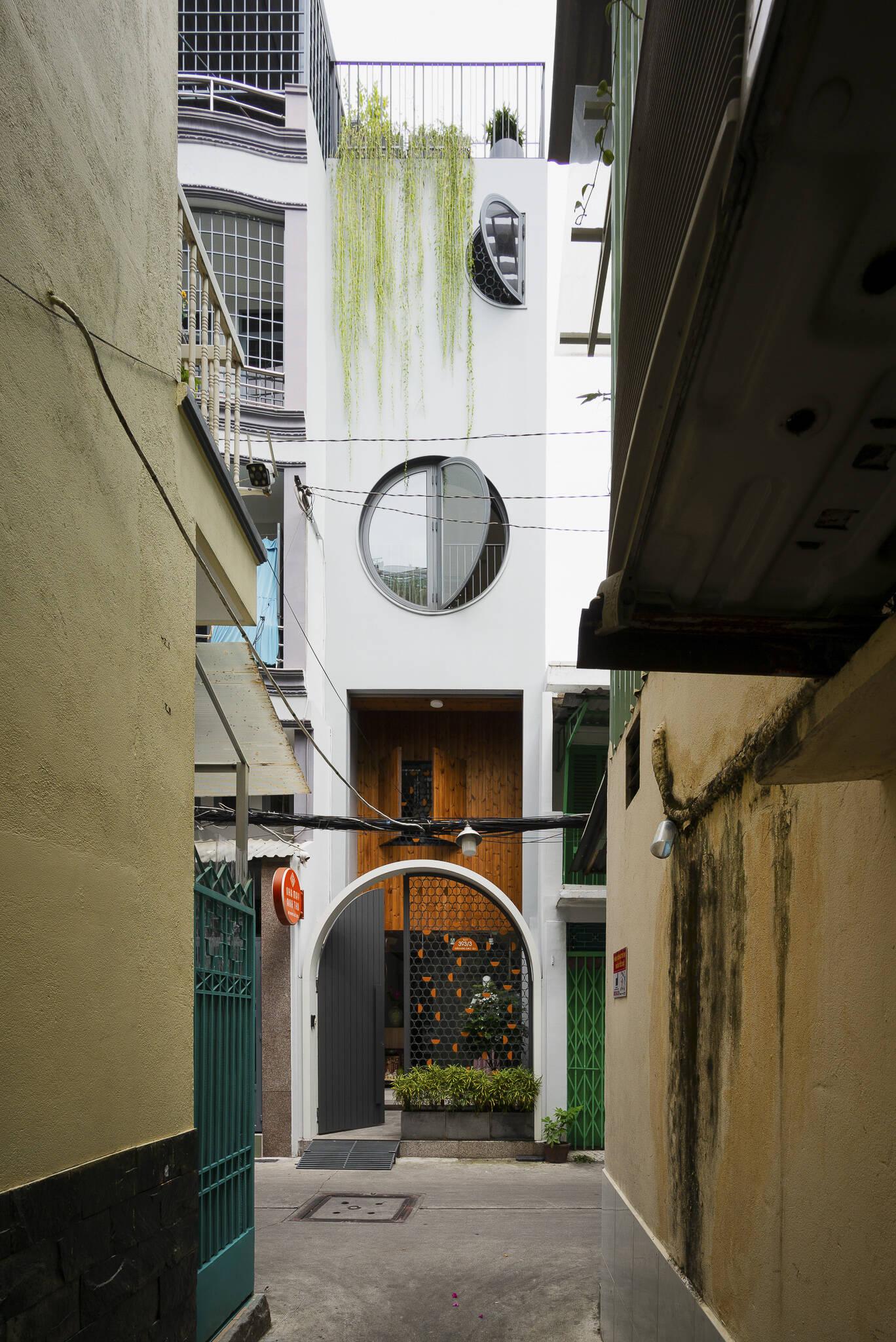 Không chỉ có vậy, ngay từ mặt tiền, những đường cong uyển chuyển đã được tạo nên thay vì những hình khối khô cứng, giúp mang đến sự mềm mại cho ngôi nhà 26m2 nói riêng và con hẻm nói chung.