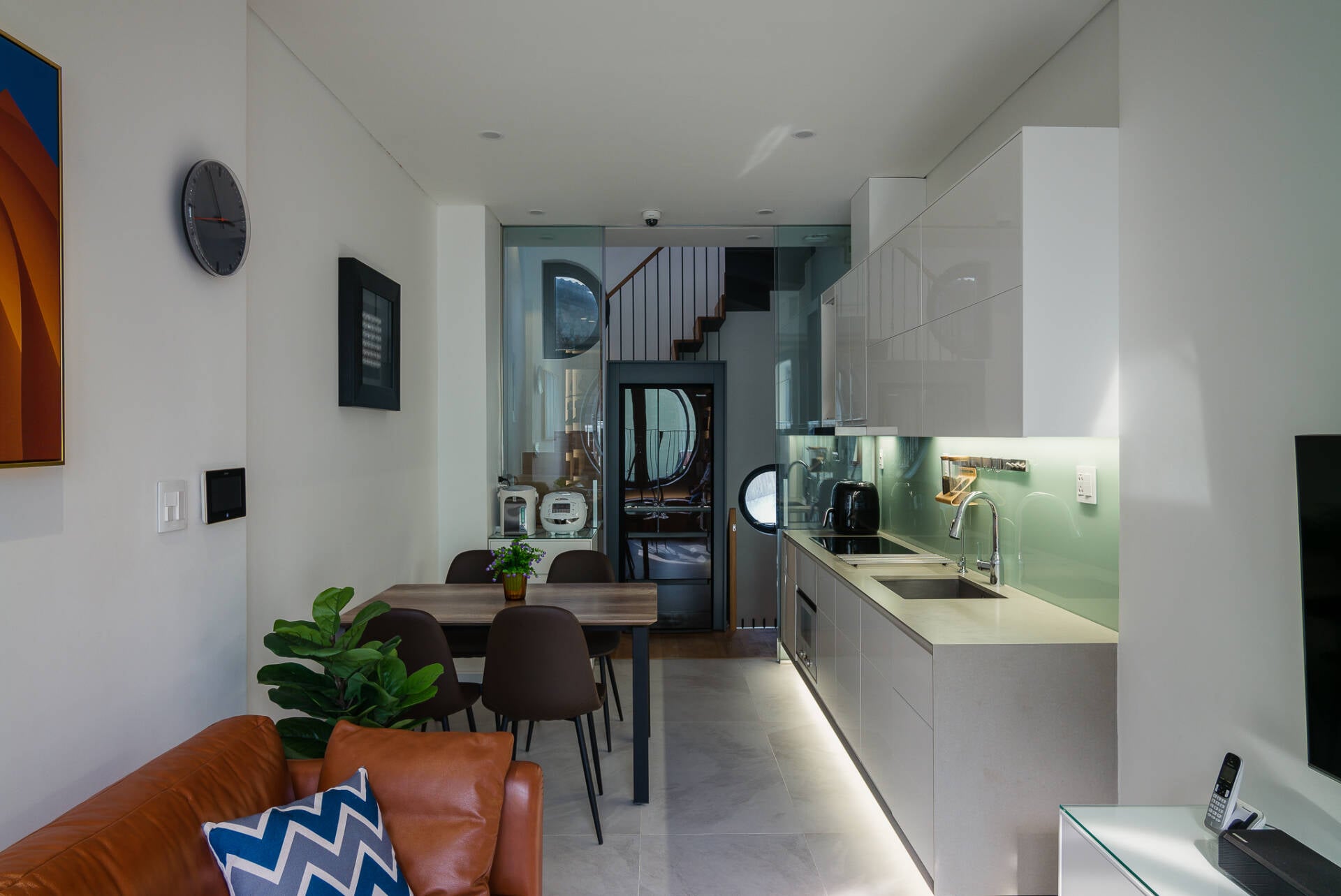 Phòng khách, bếp và phòng ăn thiết kế mở giúp tiết kiệm diện tích