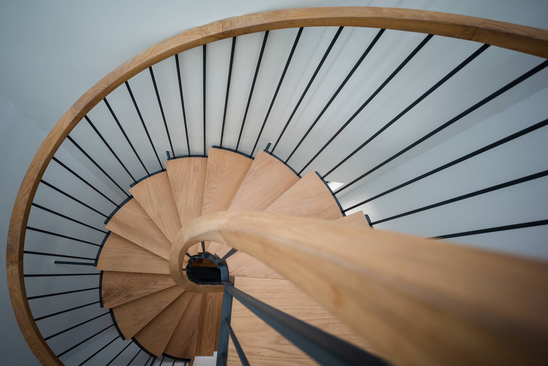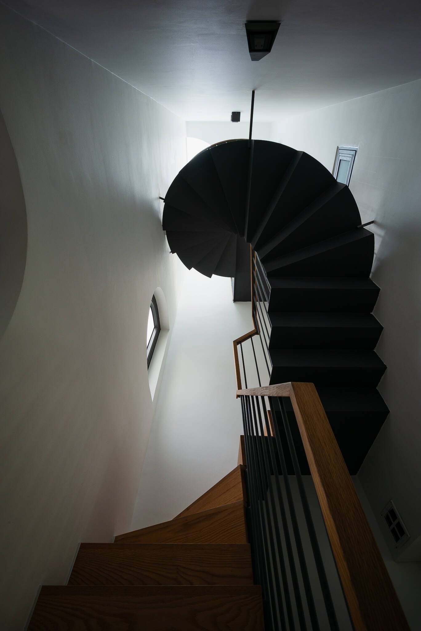 Bên trong ngôi nhà 26m2, cầu thang chữ U chuyển dần thành cầu thang tròn cho phù hợp với công năng các tầng đồng thời thay đổi cảm giác của người ở khi di chuyển. Điểm cuối của con đường là cửa sổ mái kính hình bán nguyệt mang ánh sáng tự nhiên ngập tràn.